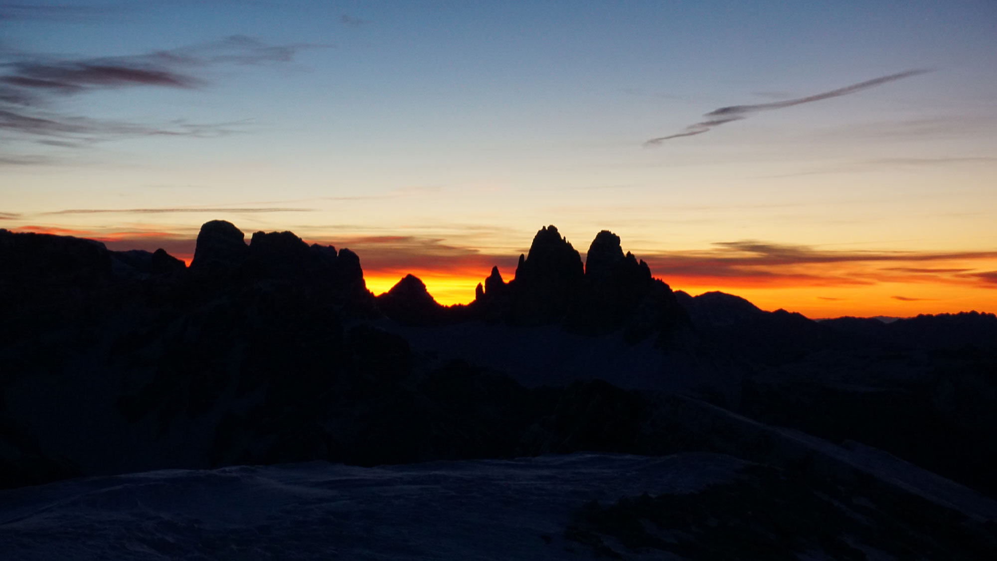 Sonstiges: zur Zeit geht die Sonne direkt hinter den Drei Zinnen auf, deshalb sicher 150 Leute zum Sonnenaufgang am Gipfel