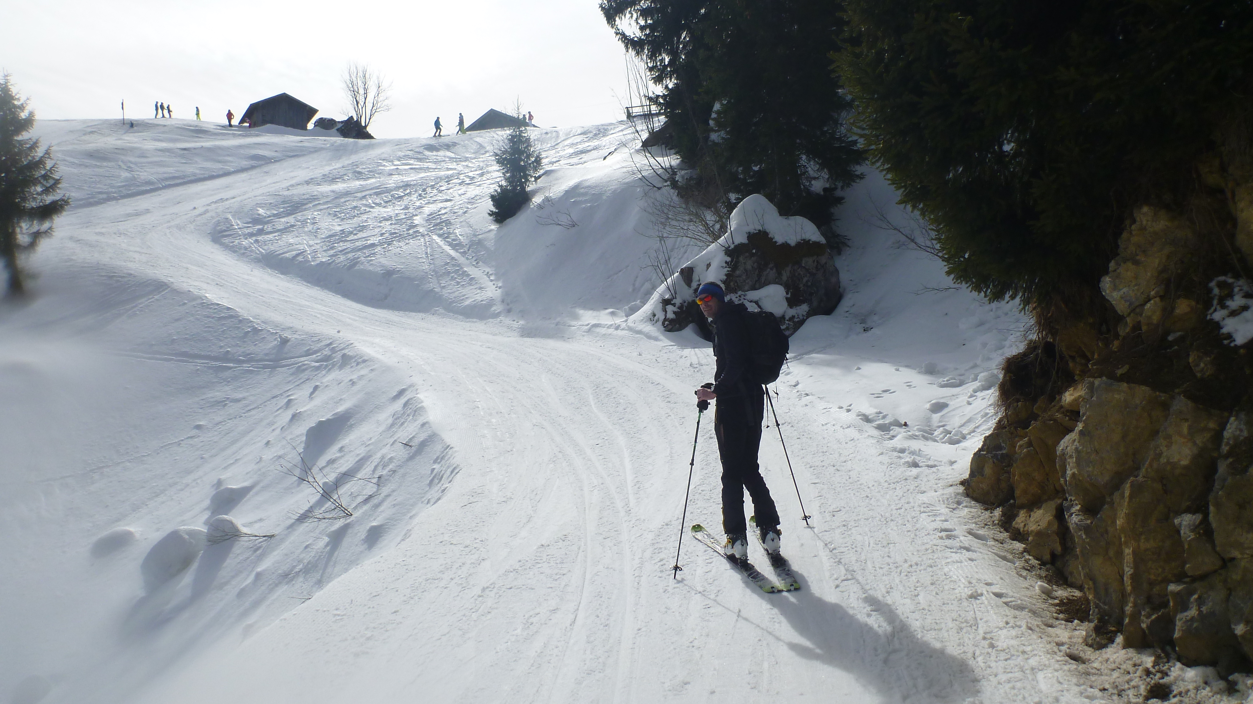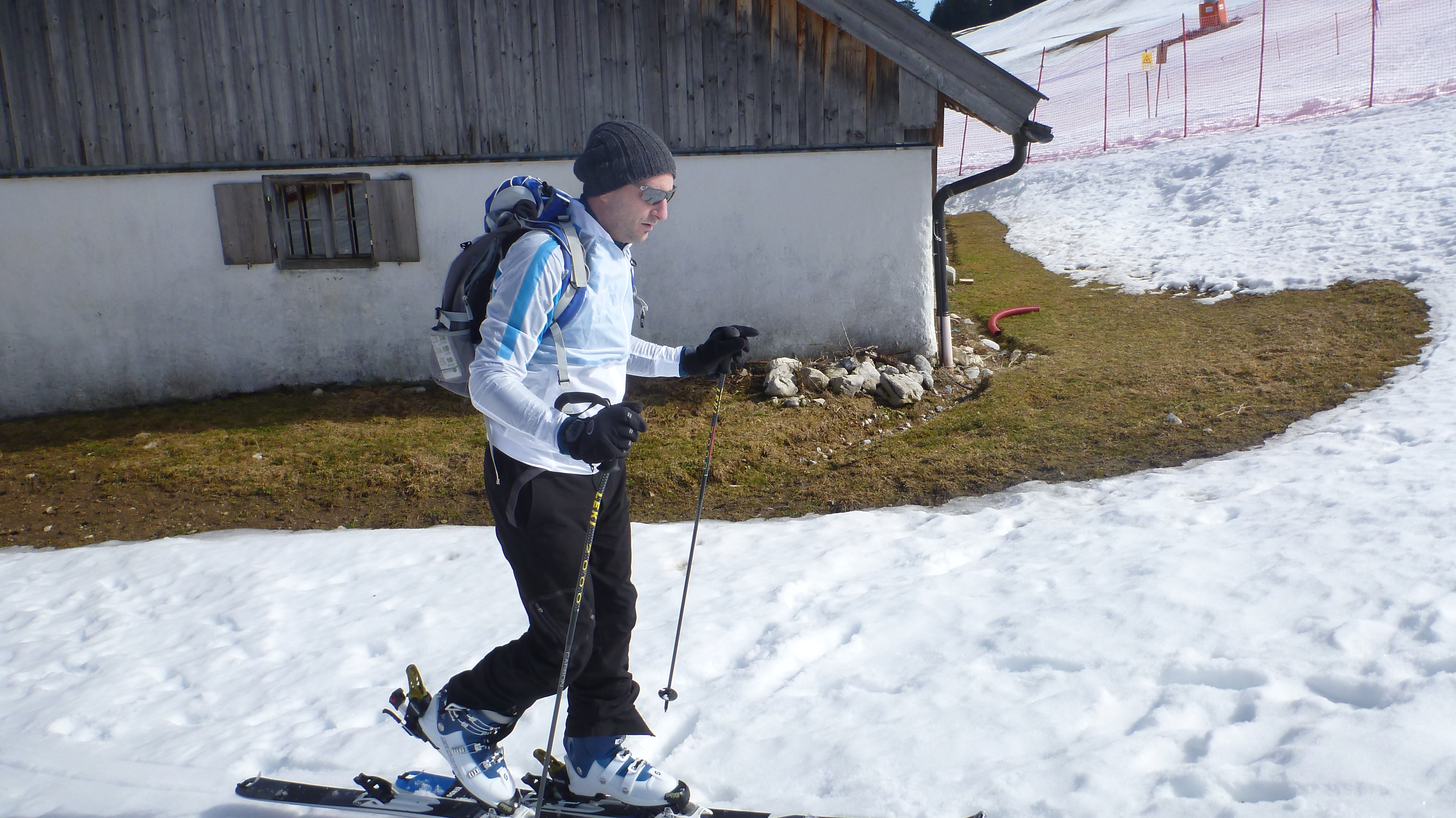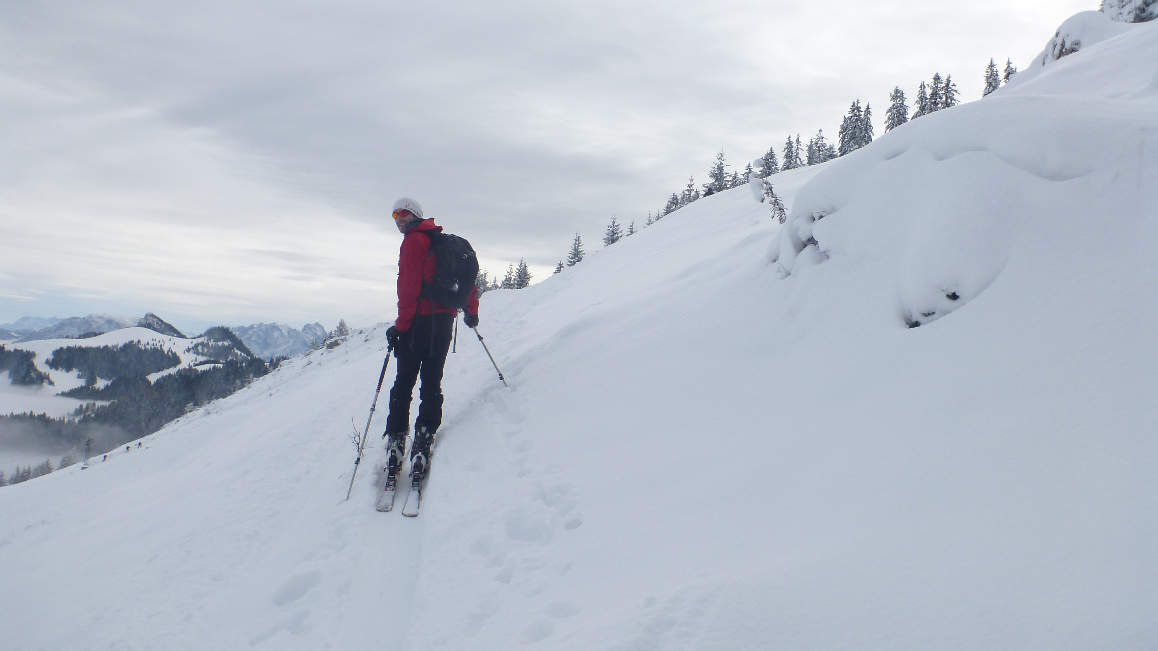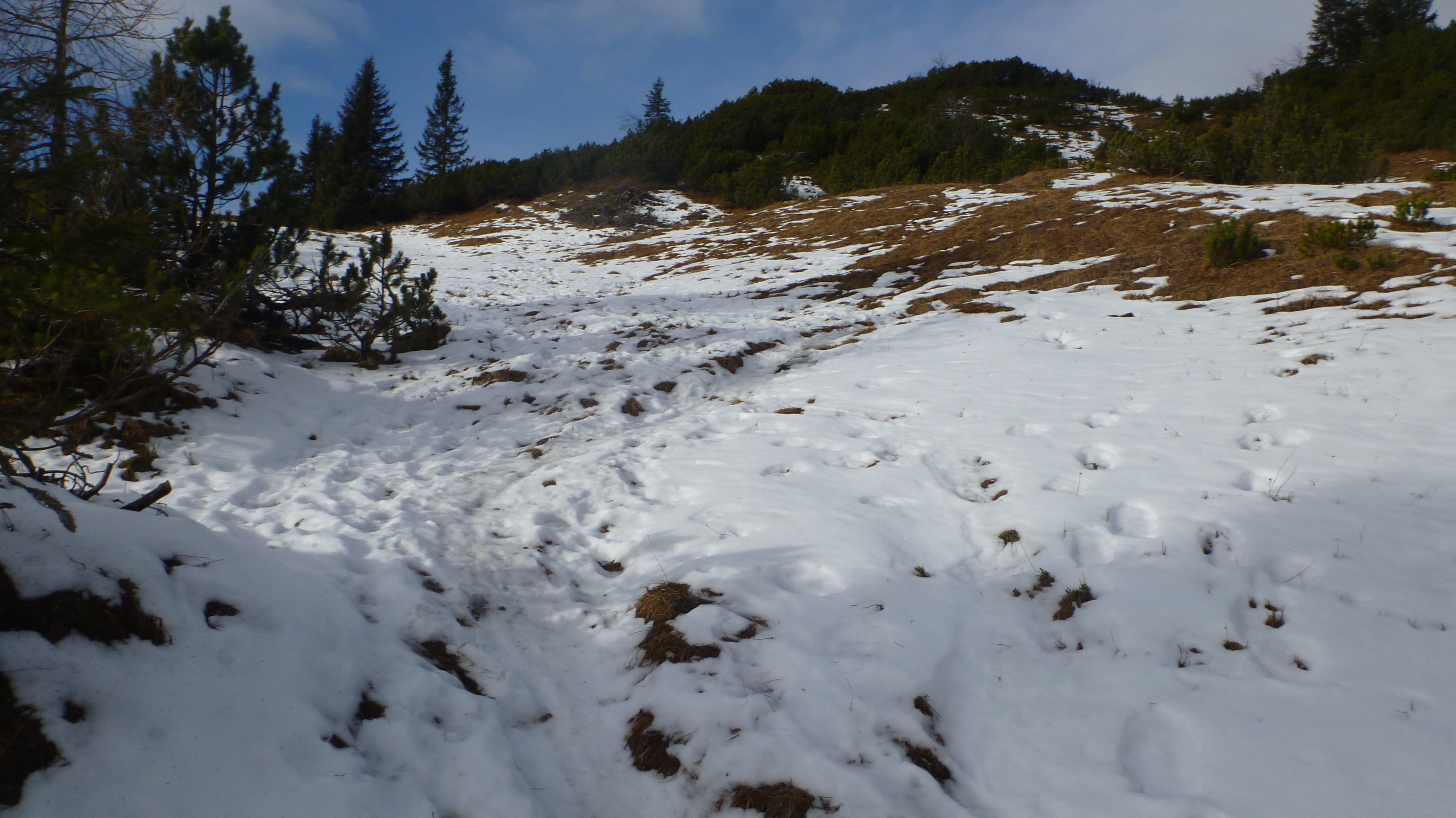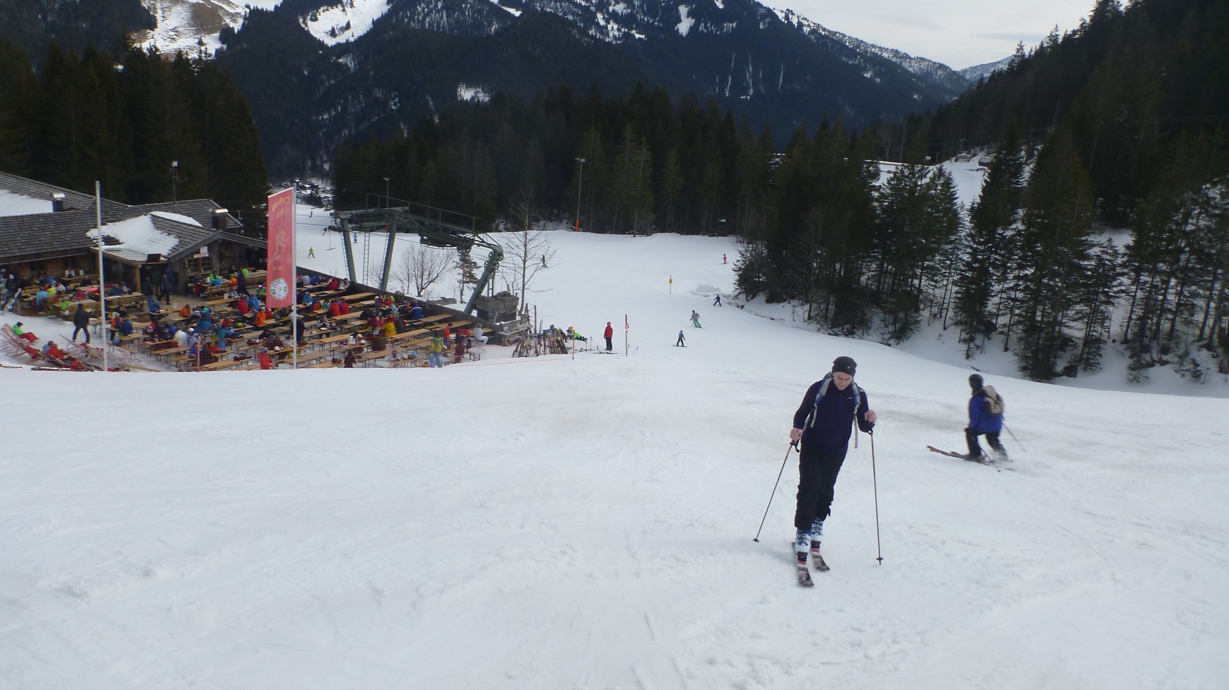 Sonstiges: Aufstieg entlang der Piste über weichen Sulzschnee, am Tiroler Stüberl vorbei zum Kessel der Waller- und Speckalm und weiter neben dem Schlepper zum Sudelfeldkopf.