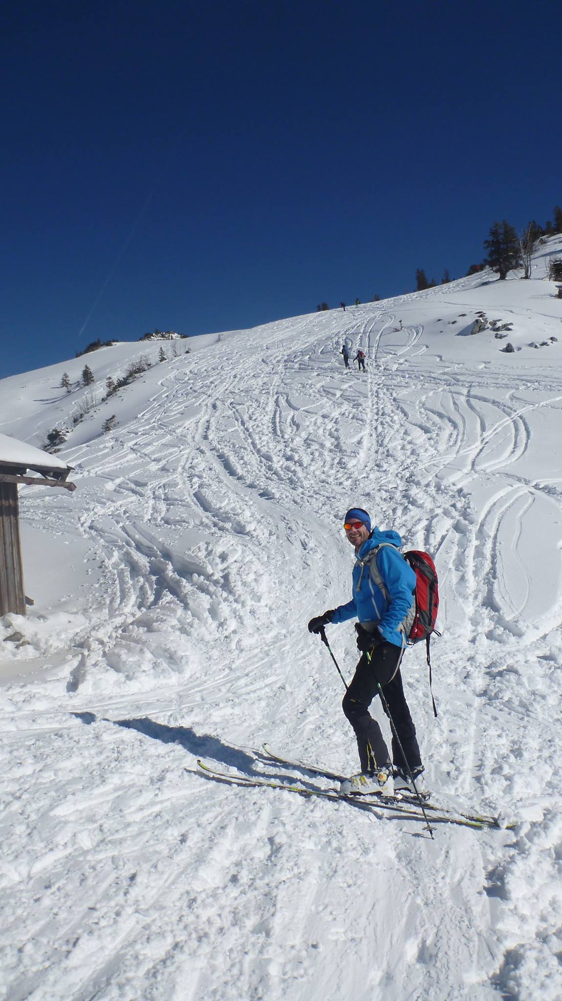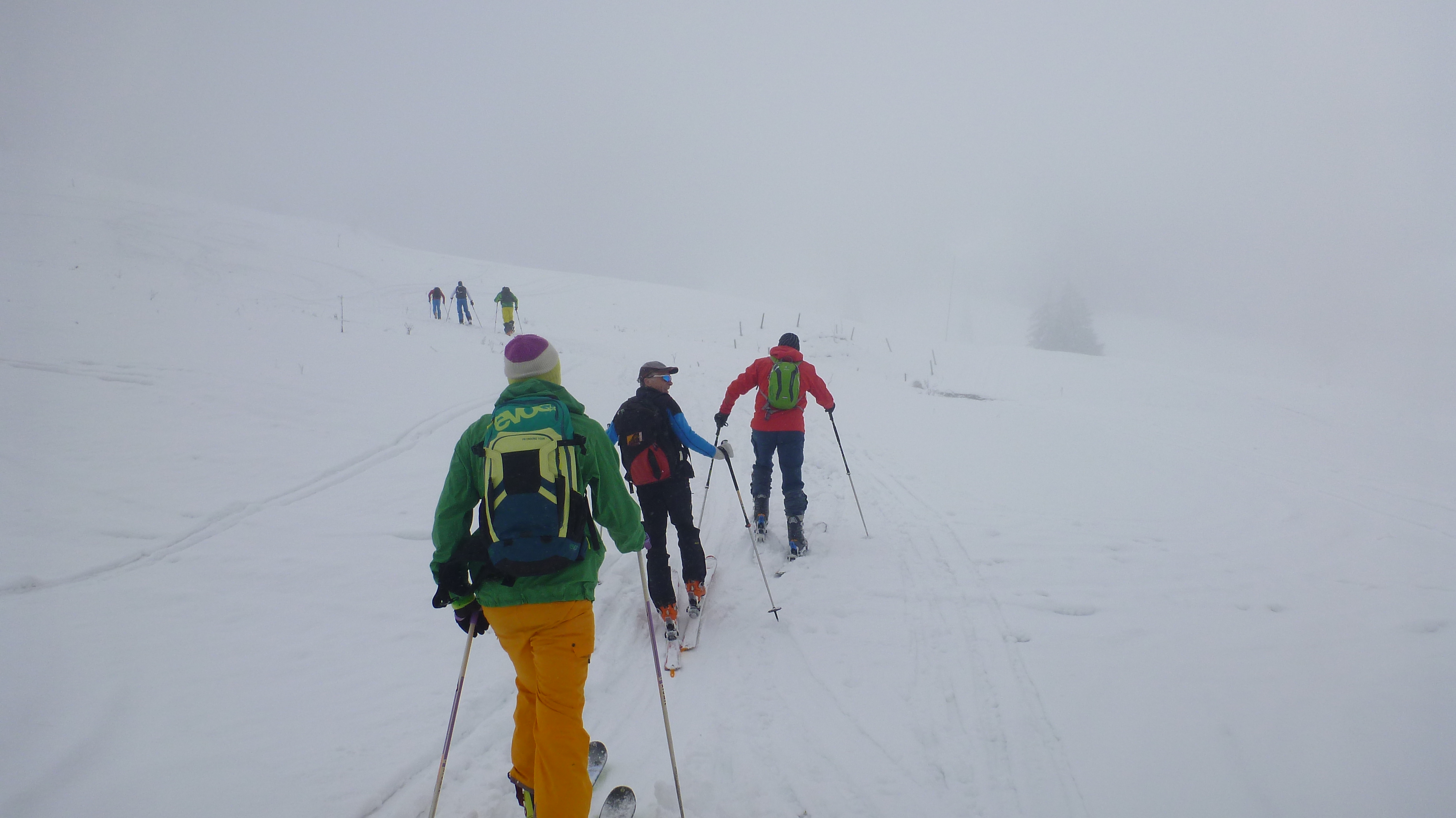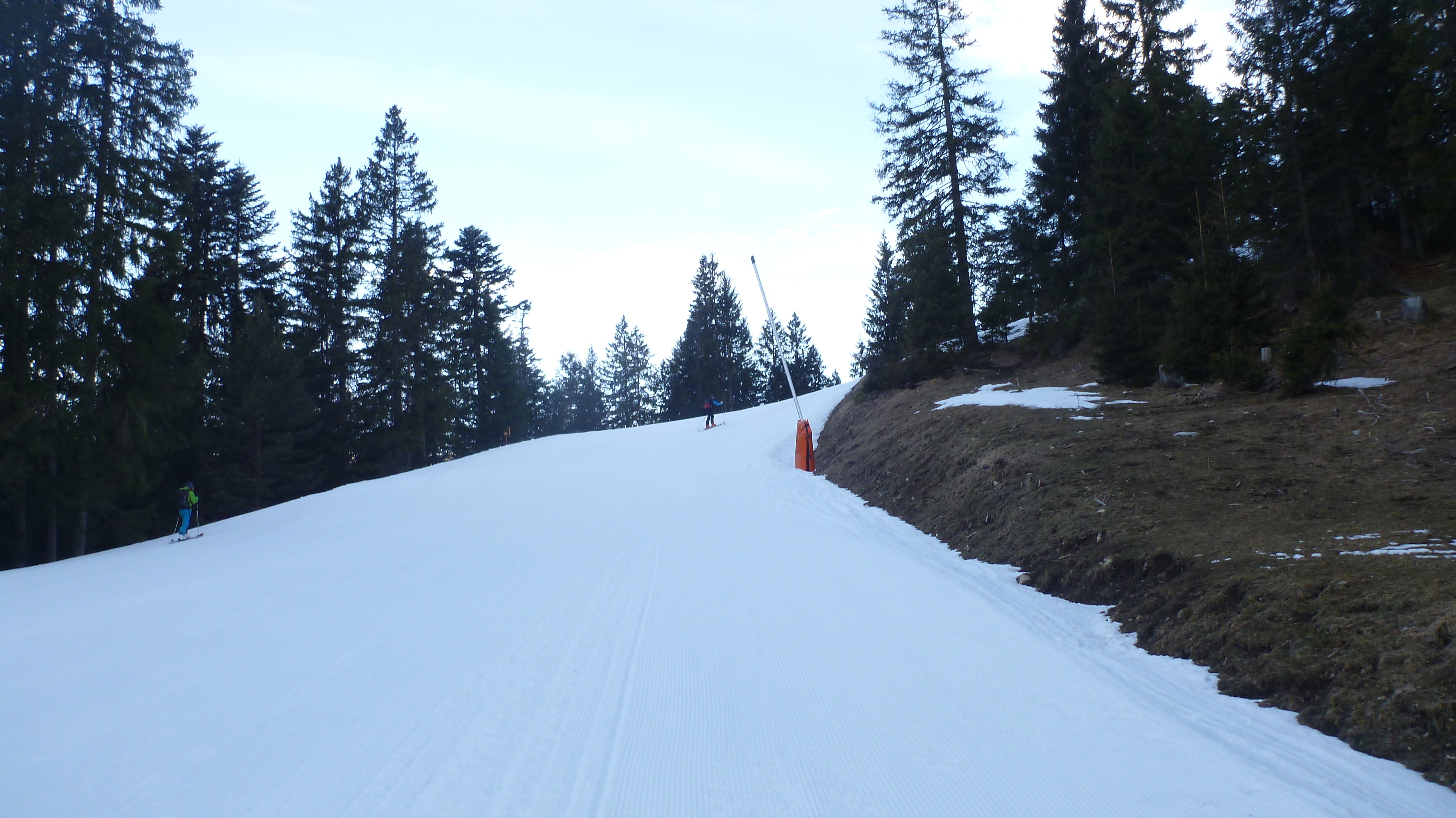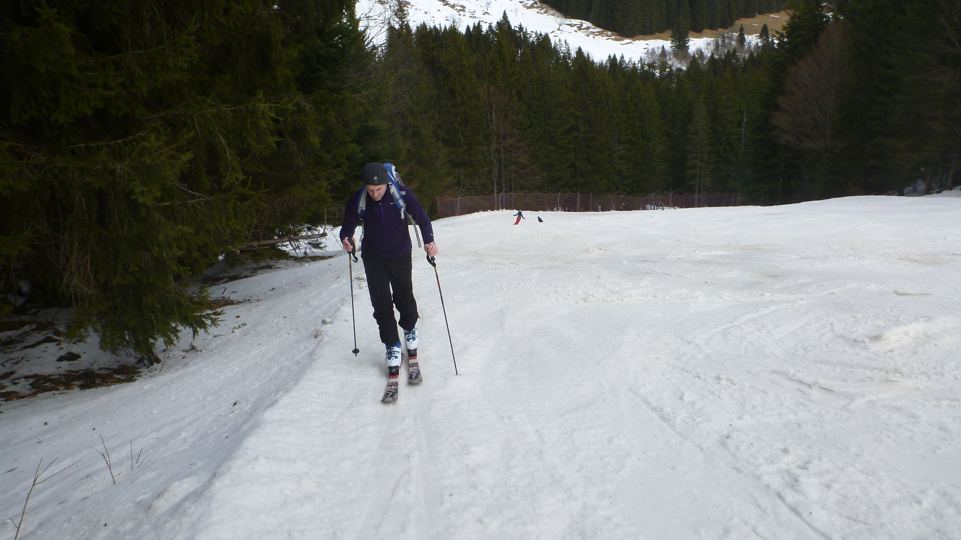 Sonstiges: Aufstieg entlang der Piste über weichen Sulzschnee, am Tiroler Stüberl vorbei zum Kessel der Waller- und Speckalm und weiter neben dem Schlepper zum Sudelfeldkopf.