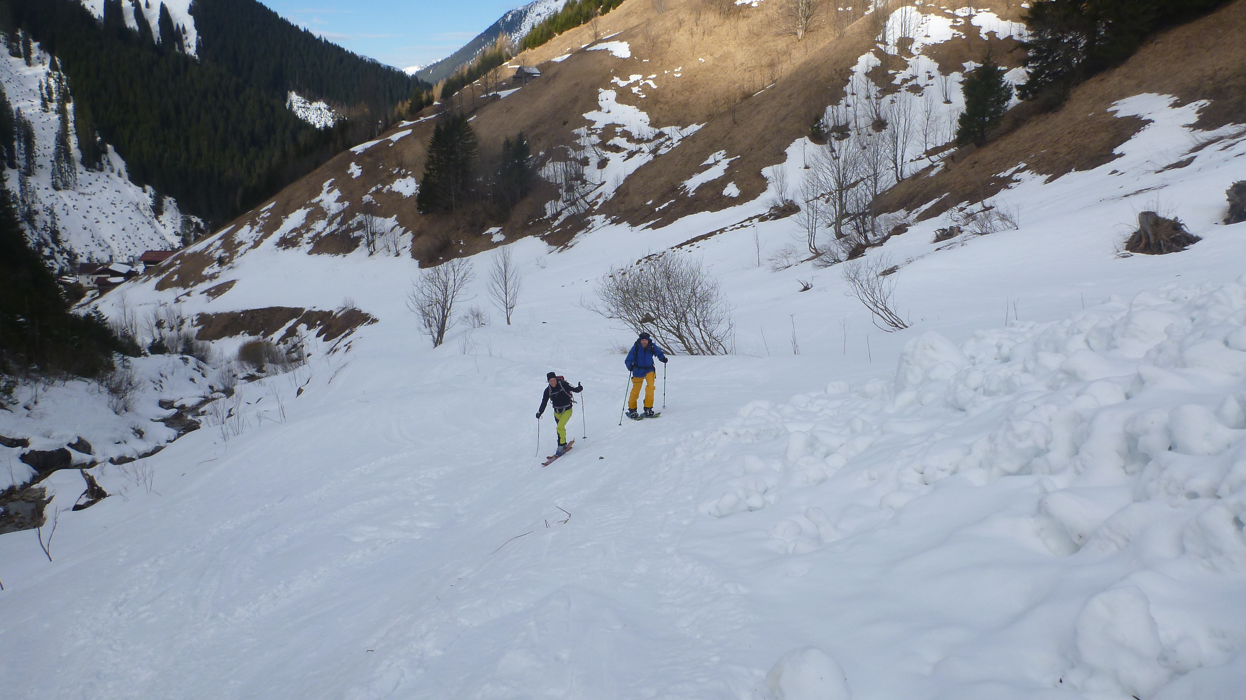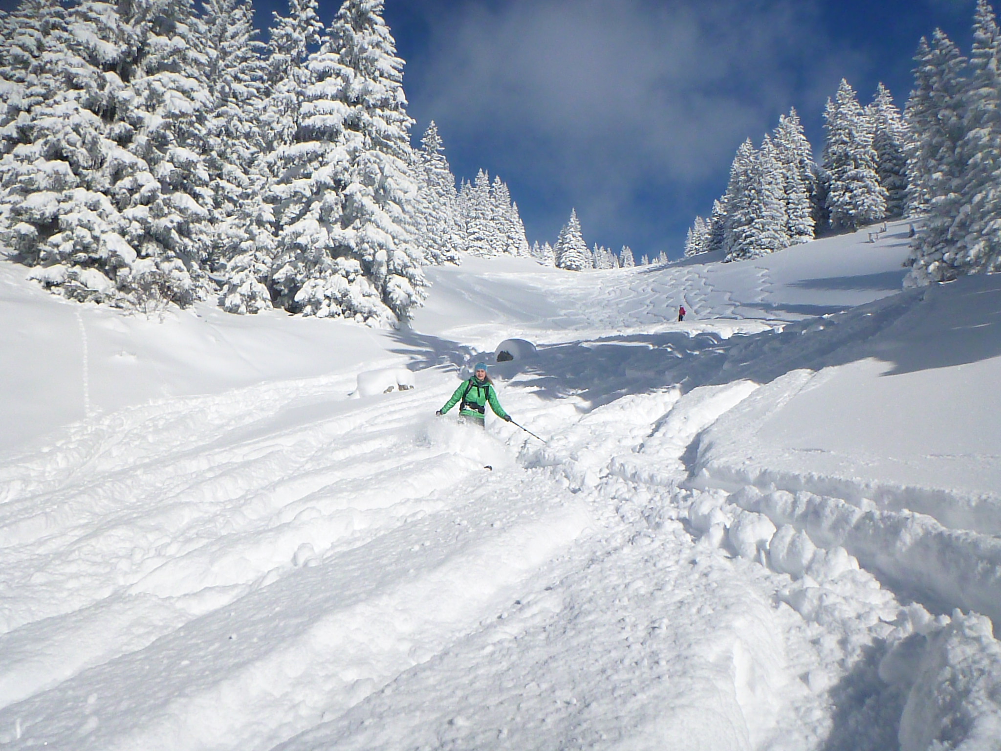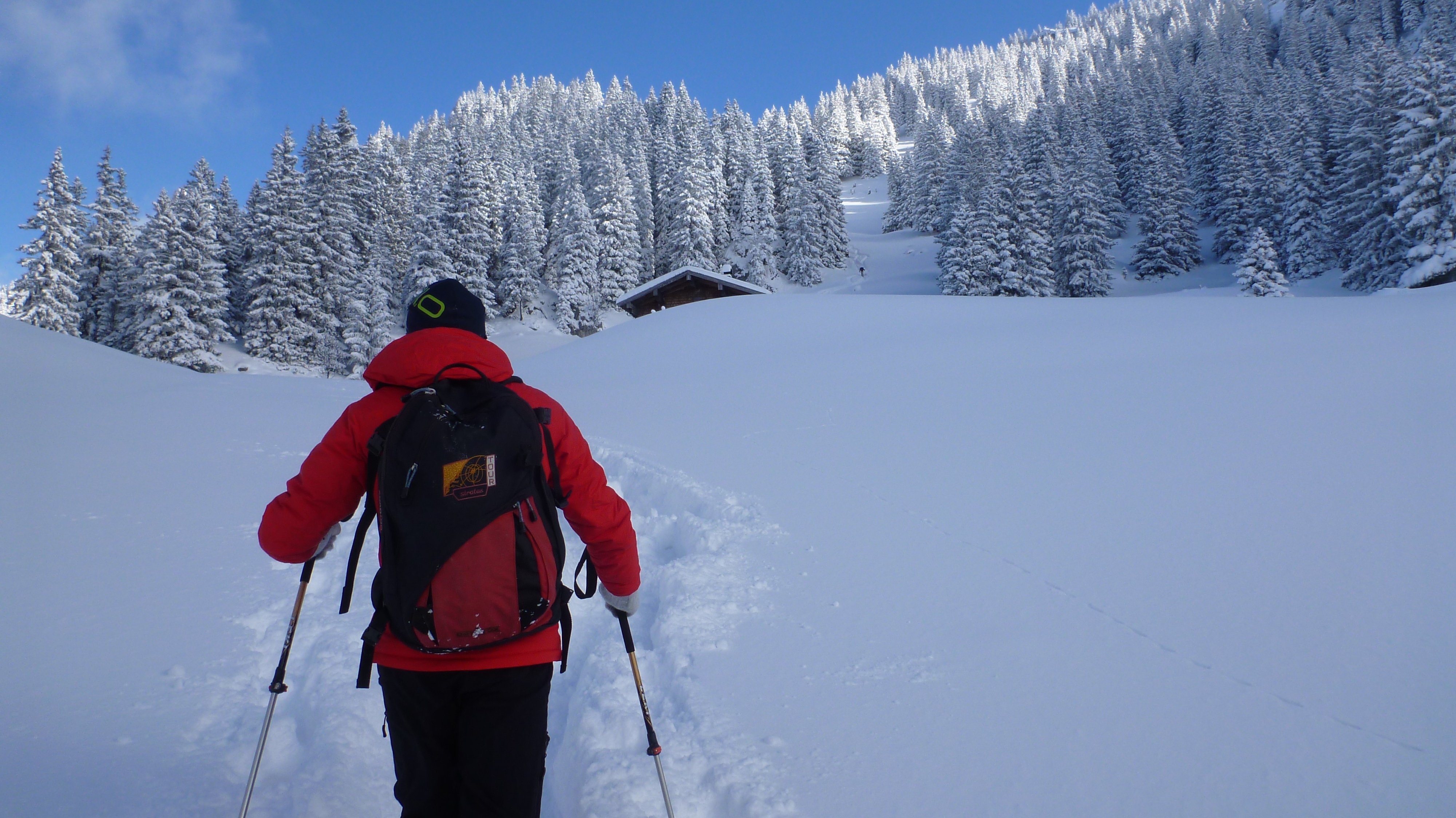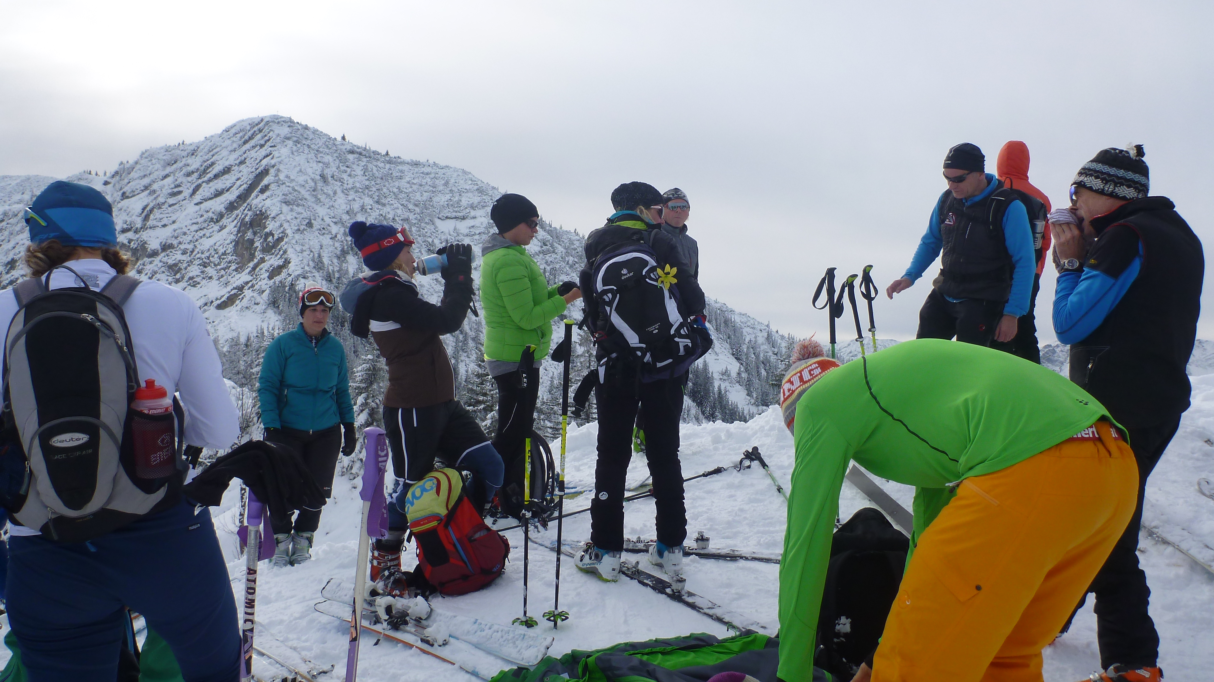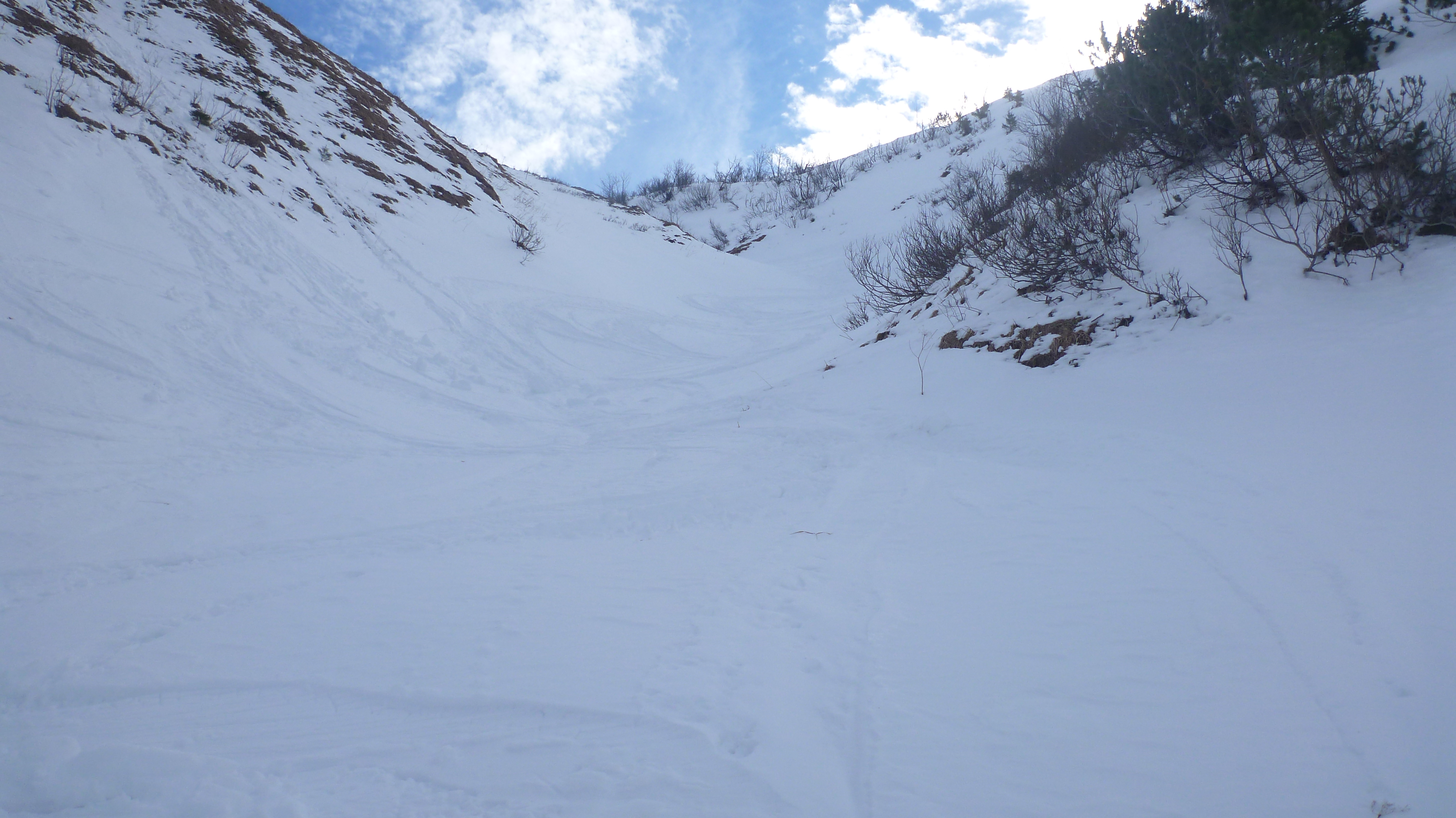 Sonstiges: Aufstieg entlang der Piste über weichen Sulzschnee, am Tiroler Stüberl vorbei zum Kessel der Waller- und Speckalm und weiter neben dem Schlepper zum Sudelfeldkopf.
