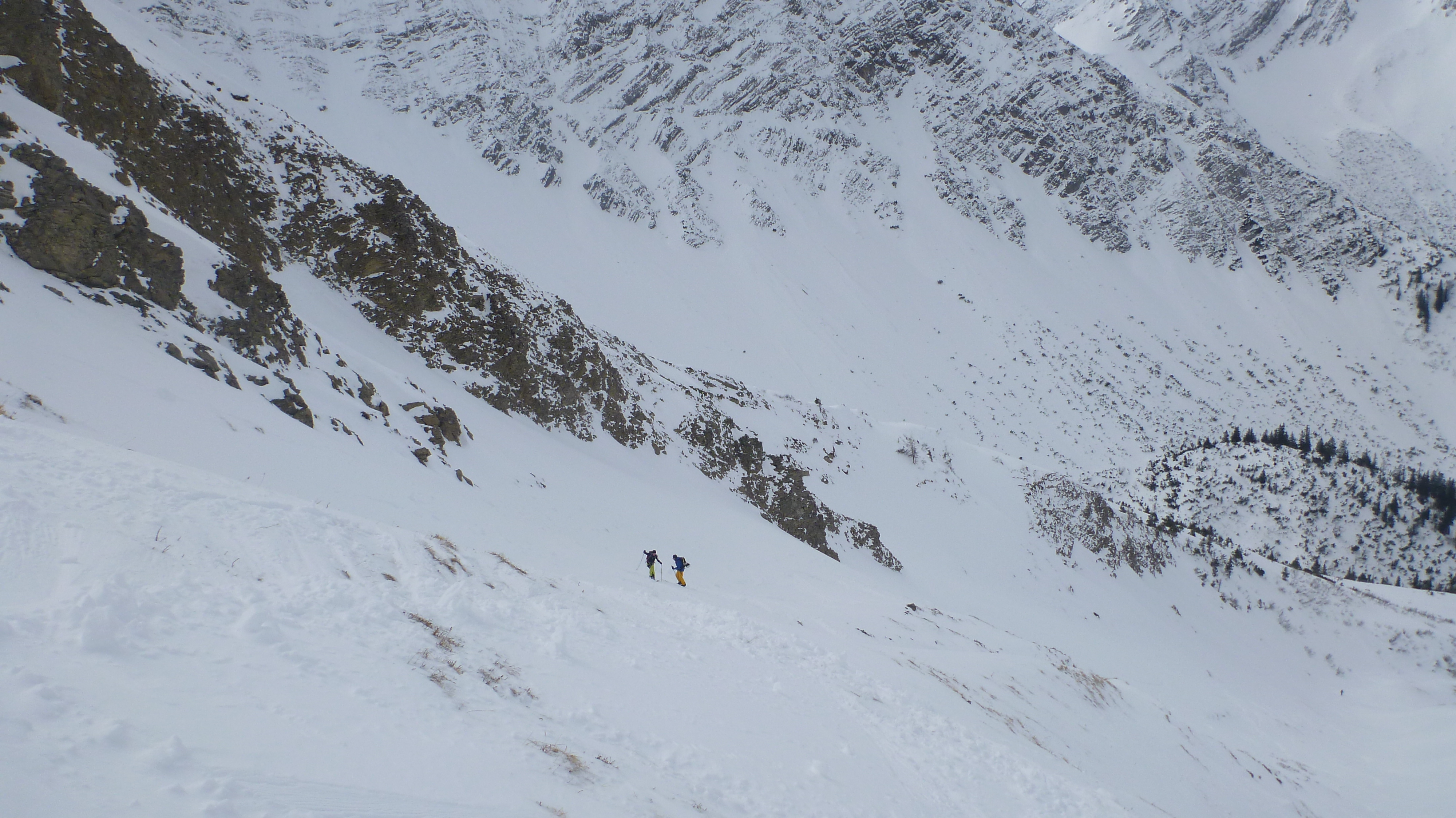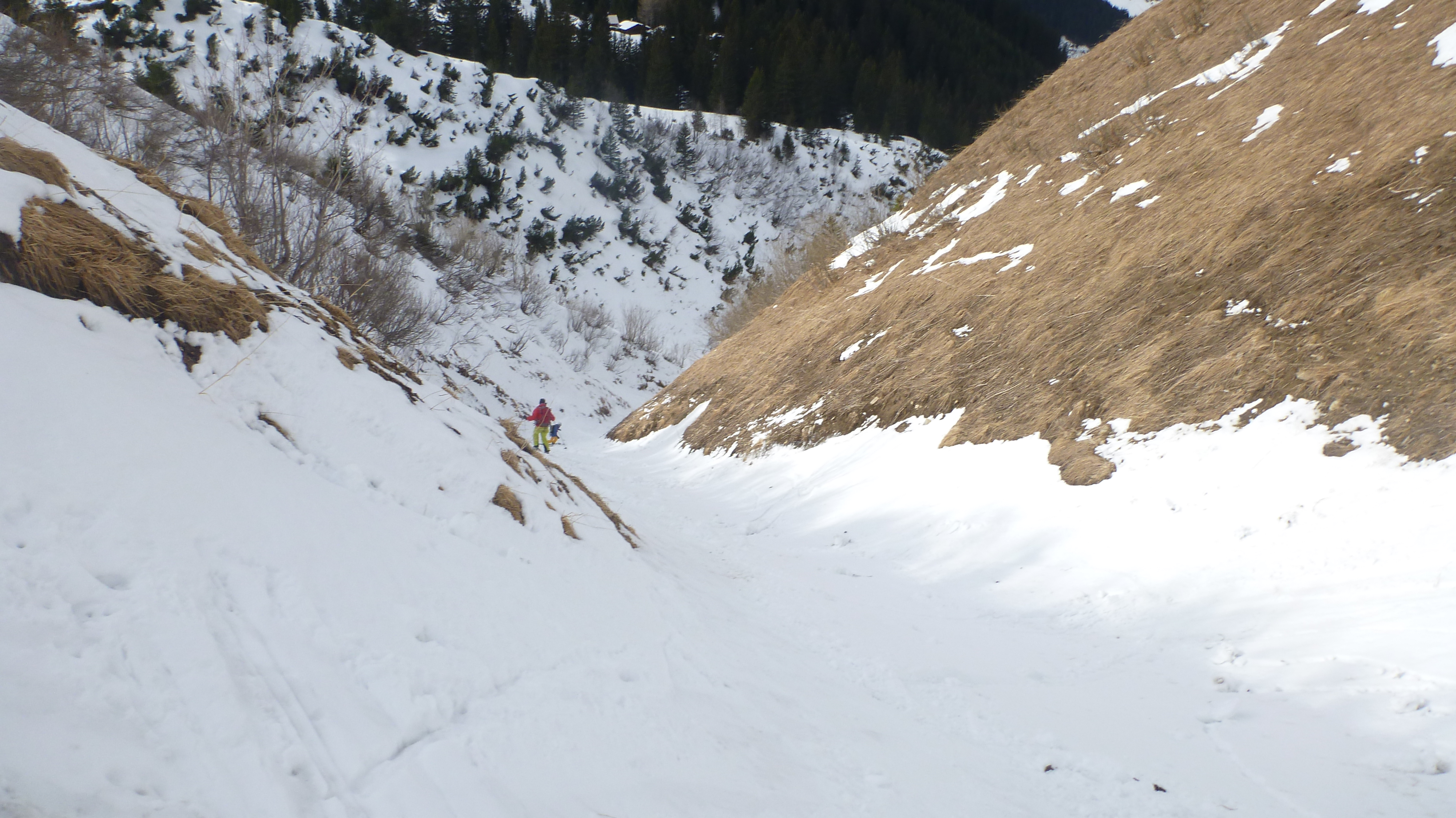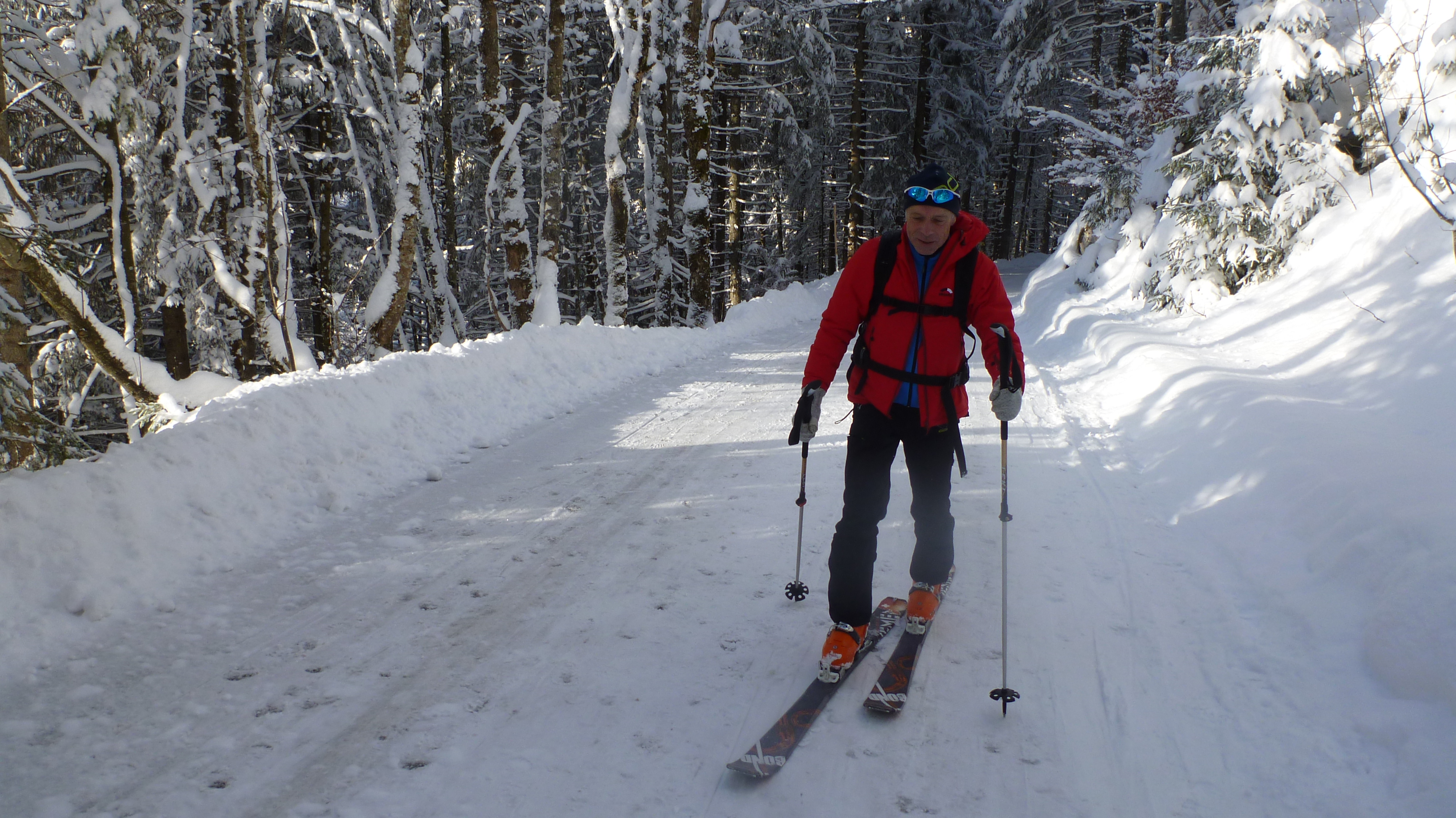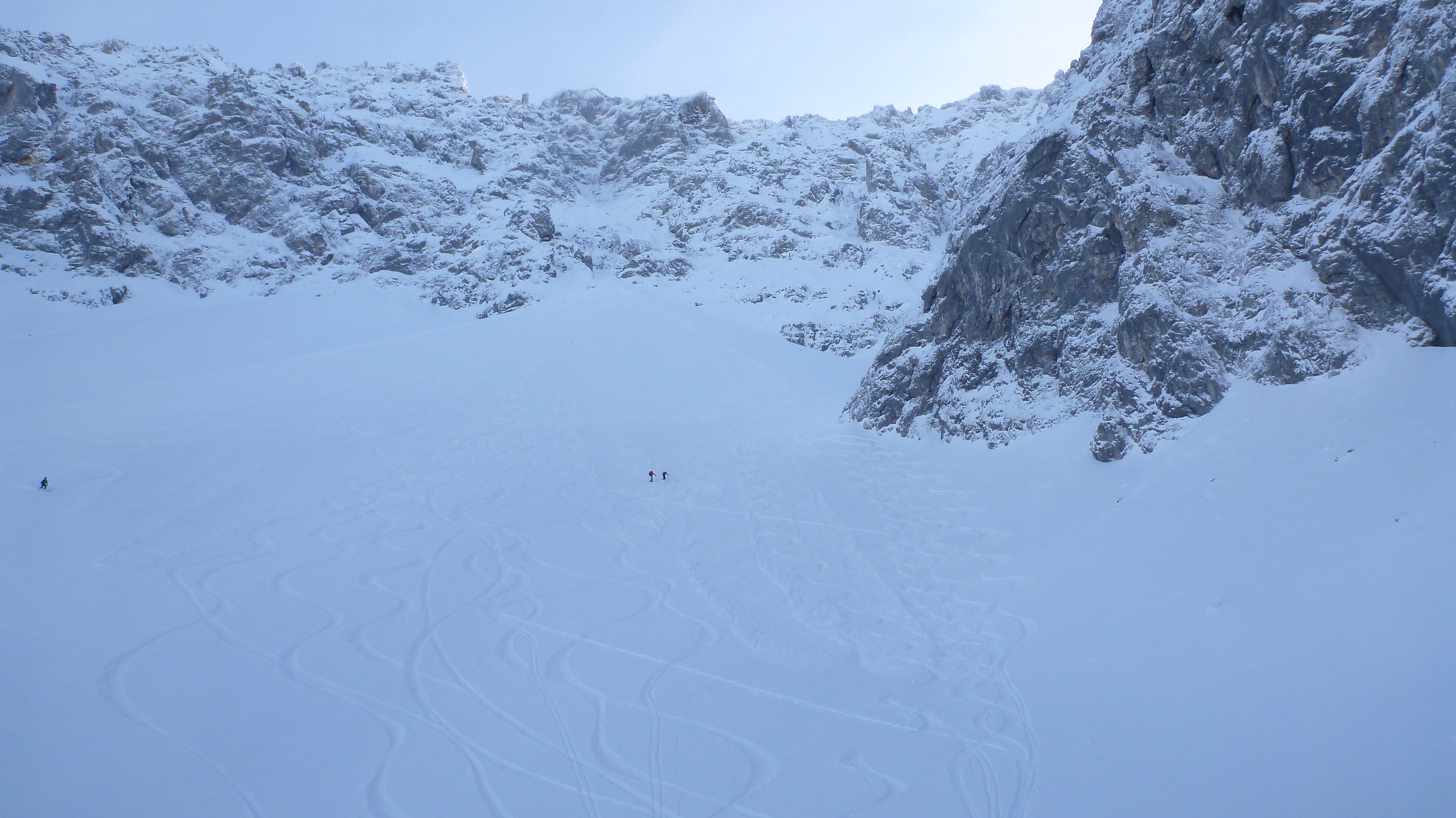Sonstiges: Aufstieg entlang der Piste über weichen Sulzschnee, am Tiroler Stüberl vorbei zum Kessel der Waller- und Speckalm und weiter neben dem Schlepper zum Sudelfeldkopf.