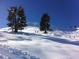 Tourenverhältnisse: hervorragend, überwiegend Pulver, im weiträumigen Gelände noch Platz für eigene Spur, große Steine in der Regel ausreichend verschneit