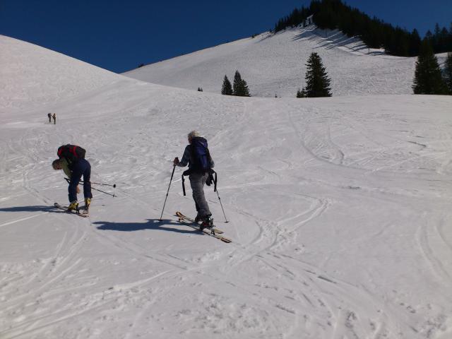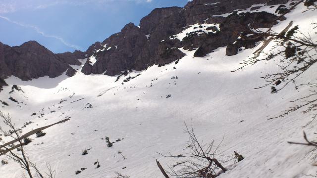 Gefahreneinschätzung: Hoch auf dem Weg durchs Älpelestal. Die Lawinenreste in denzu überquerenden Seitentälern sind hart, aber sehr dünn, sodass man in den Bach darunter durchbrechen kann. Auch die Umgehungsmöglichkeiten sind sehr mühsam, batzig und gefährlich.