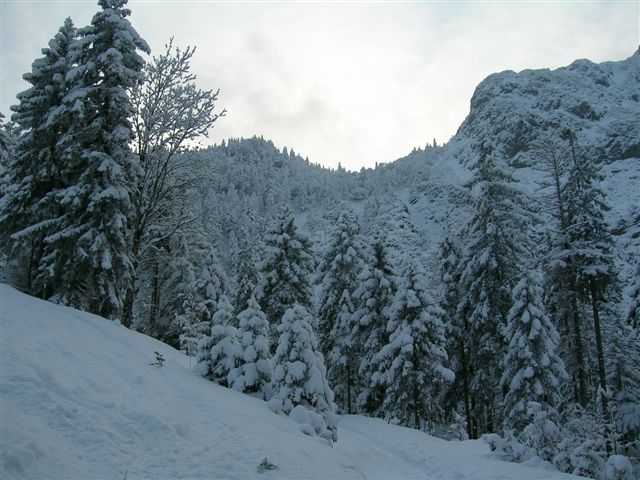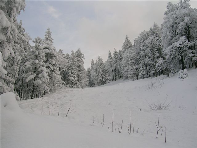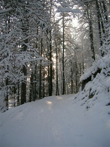 Tourenverhältnisse: heute kein Liftbetrieb, Gasthaus geschlossen (aber Eisautomat in Betrieb!) Forststrasse mit geringer Schneeauflage, zum Aufstieg o.k., für die Abfahrt fand ich es zu steinig, hab getragen. Schneeverhältnisse ganz gut ab ca. 1.000m. 10 - 20 cm Pulver auf mehr oder weniger verharschtem Altschnee. Oben neblig, bei der Abfahrt kurz vor Dunkelheit fing's heftig an zu schneien.