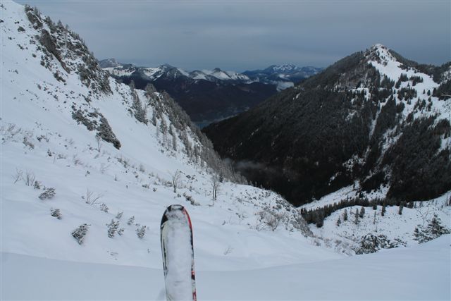 Dort auch eine recht lohnende Abfahrt, es schauen ein paar Felsen + Latschen raus, die man gut umfahren kann. Insgesamt auch hier sehr wenig Schnee.