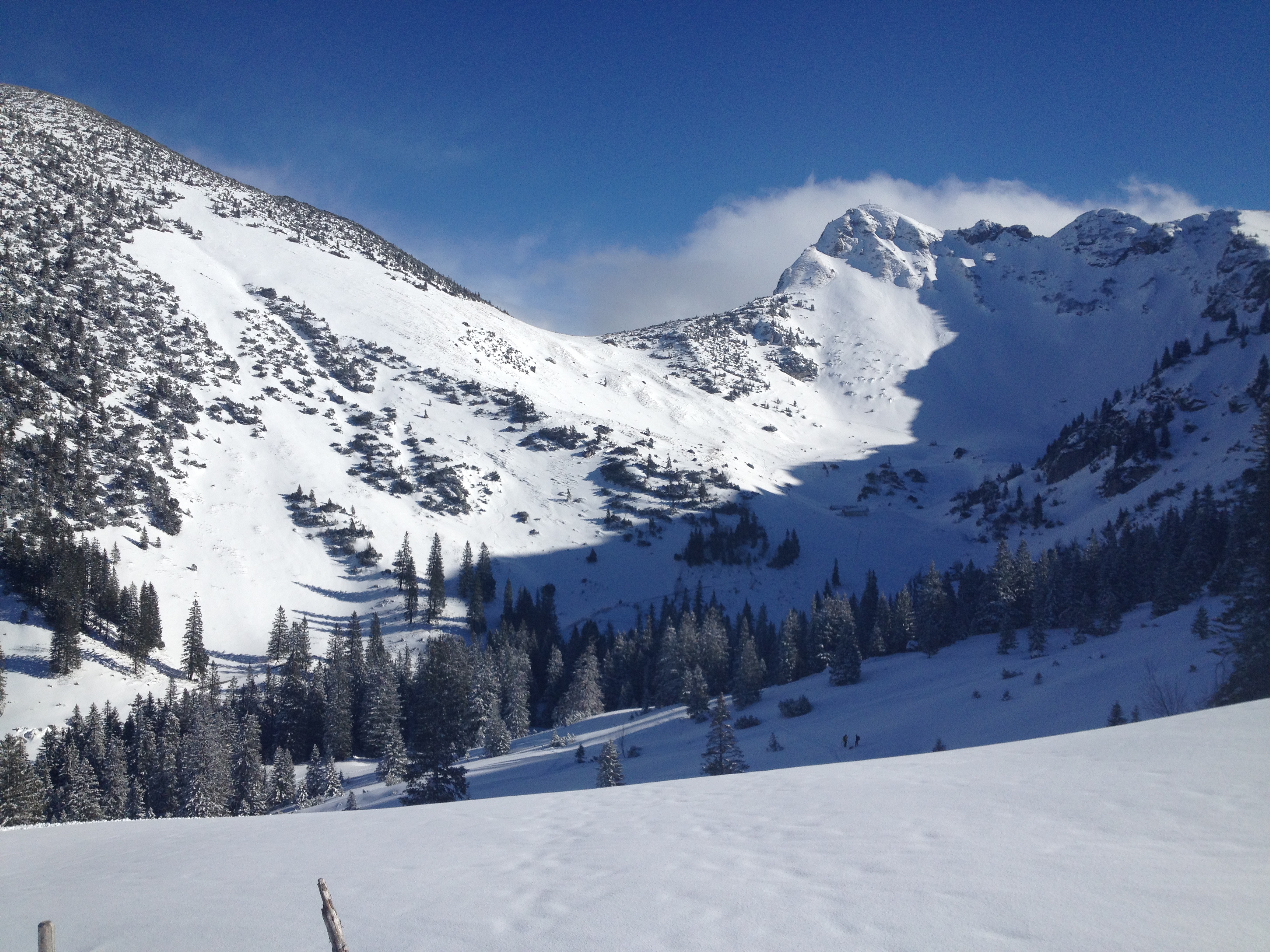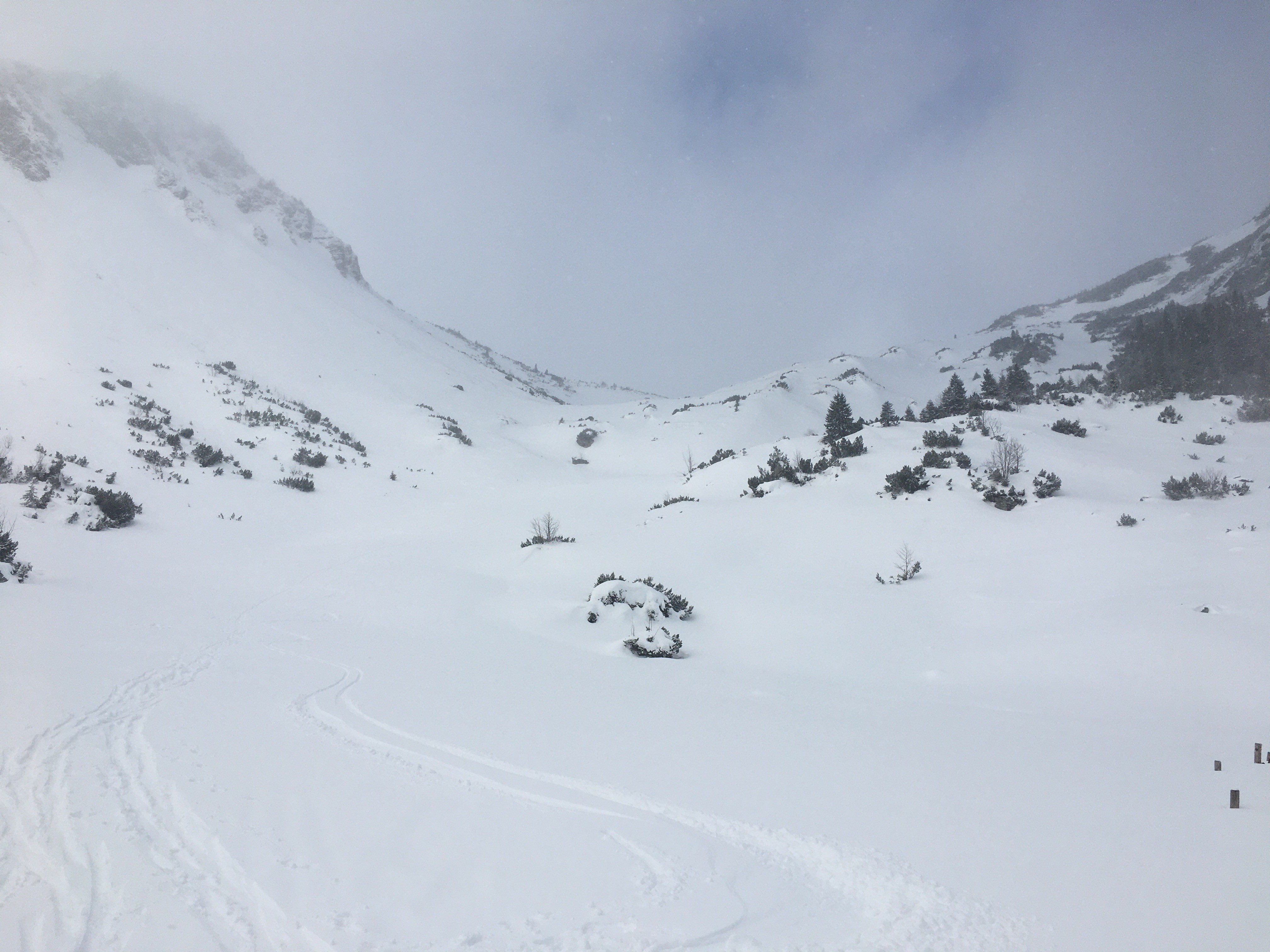 Im Brendlkar Pulverschnee auf harter Unterlage (vielleicht gut 20cm). Im weiteren Verlauf wird der Pulver geringer und man berührt ein bisschen die harte Unterlage. Insgesamt aber gut zu fahren. Latschen sind dieses Jahr sehr gut eingeschneit. Die steile Rampe vor dem Talbodden hat etwas schwereren Pulver.