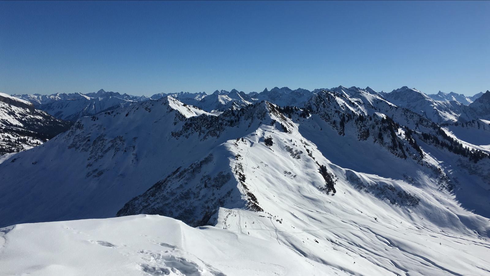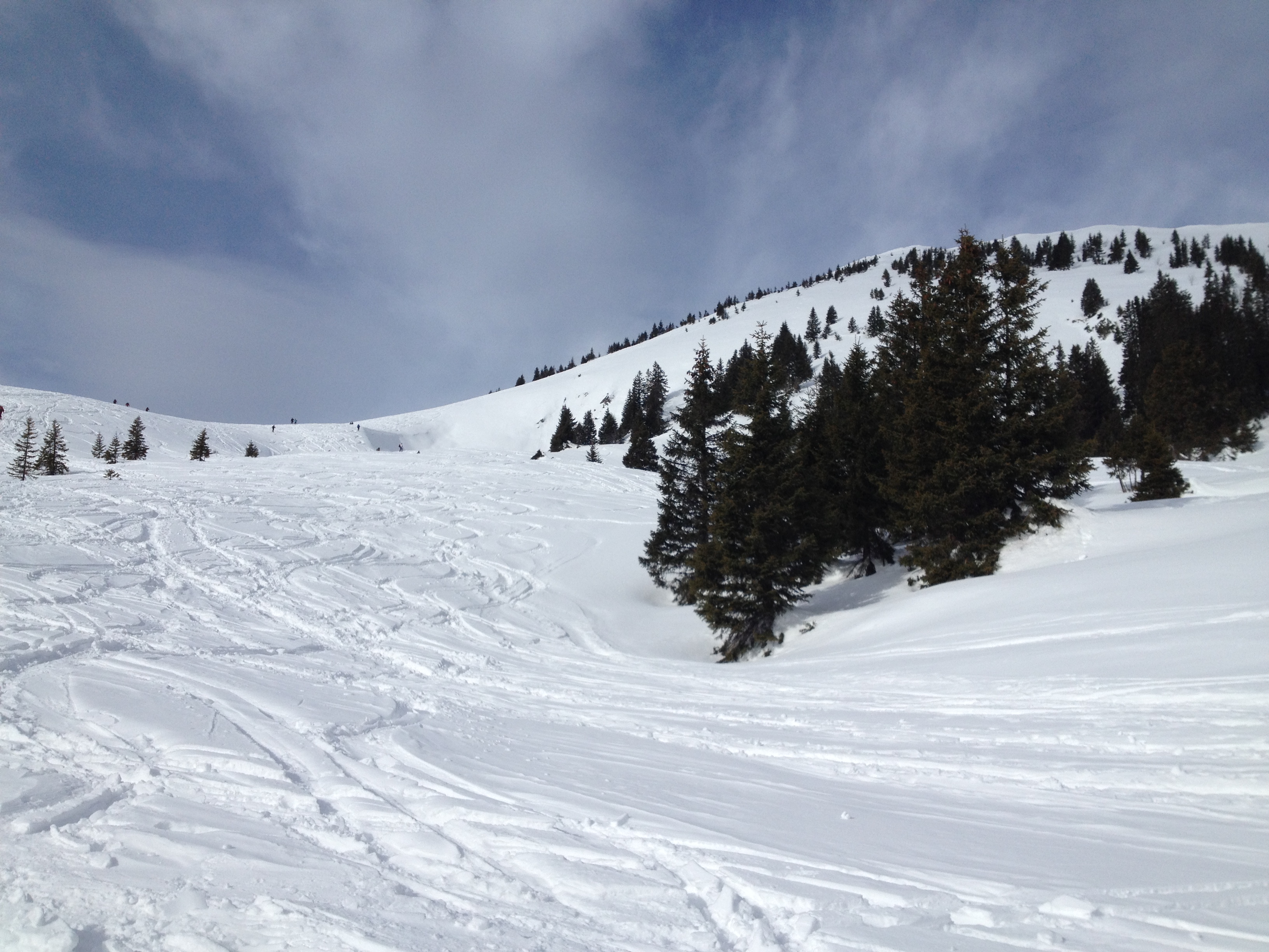 Abfahrt von der Grünsteinscharte im oberen Bereich kurz Buckelpiste, dann schöner Pulver. Nicht mehr ganz fluffig aber gut zu fahren.