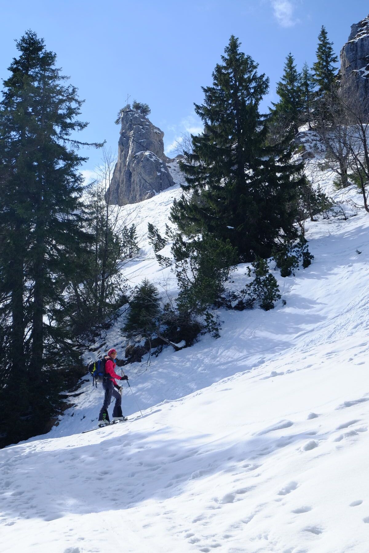 Vom PP eine Stunde tragen bis auf ca. 1350 m Höhe. Also bis ca. oberes Kar. Aufstieg bis Schindertor, dort Skidepot. Weiter durchs Tor in guter Stapfspur zur Scharte und weiter zum Gipfel. Der südseitige Gipfelanstieg war natürlich bis auf einige kurze Stellen aper.