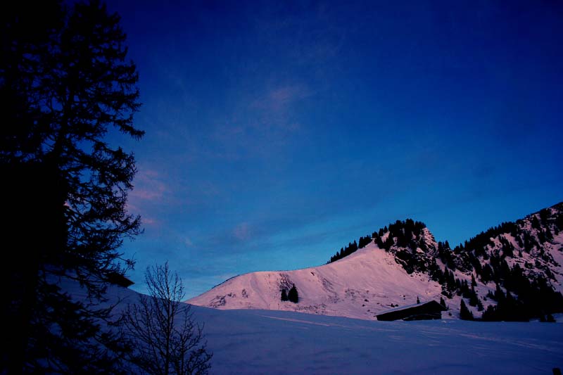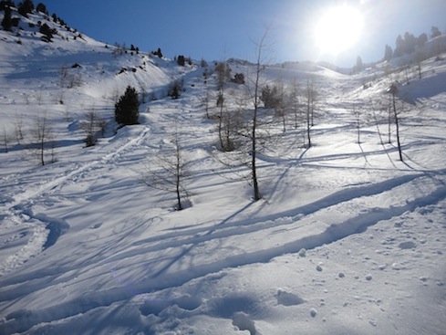Gefahreneinschätzung: derzeit sehr gering, dank der niedrigen LW-Wanrstufe (heute 1 unterhalb von 2200m). Nur wenig verfrachteter Schnee an einzelnen Hängen, durchweg gut gesetzter Schnee auch an den Steilhängen. Idealer Verhältnisse, solange kein Neu- und/oder Triebschnee hinzukommt.