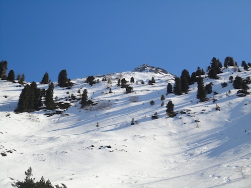 Tourenverhältnisse: Prinzipiell sollte es schon noch ein paar mal schneien, bevor man diese Tour wiederholt. Auf dem Grat zwischen Benzingspitze und Jägerkamp hat der Wind den kompletten Schnee verweht. Derzeit nur empfehlenswert mit "Geröllskiern". Durch den kalten Wind auf dem Grat ist die Schneedecke gefroren und brüchig. Im waldstück liegt genügend Schnee, der aber feucht und schwer ist. Bisweilen schauen auch hier die Steine raus...