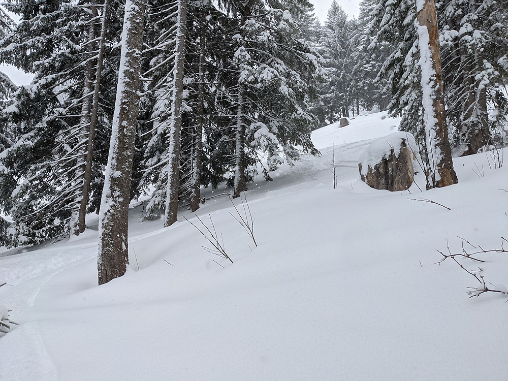 Somit sind wir direkt am Wanderweg zur Firstalm hoch, Freudenreich-Sattel abgefellt und ganz gut abgefahren.