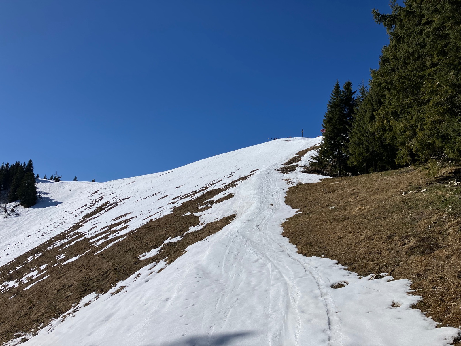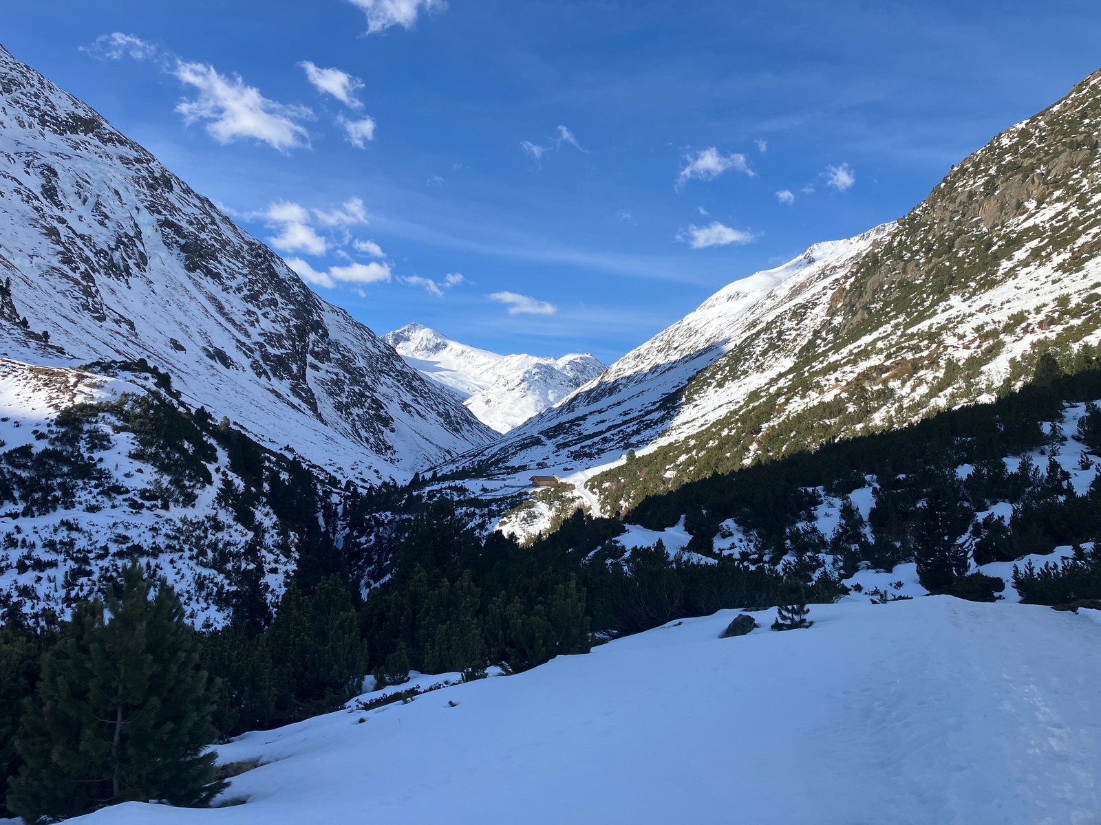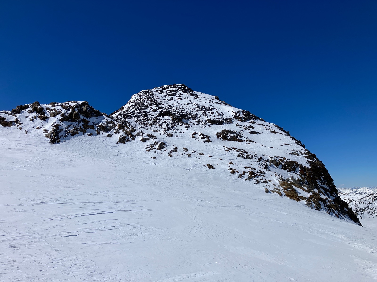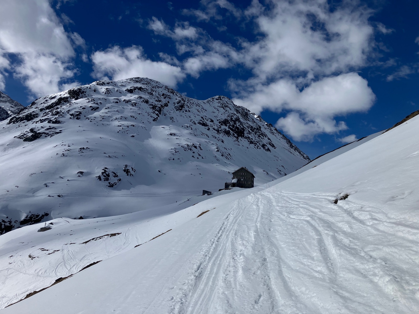 Start leider erst kurz vor 7:30 Uhr etwas vor dem Berninapass nach kalter und klarer Nacht. War dennoch zu spät, was auch der Tatsache geschuldet ist, dass ich die Tour bei den derzeitigen Verhältnissen unterschätzt habe. Zunächst muss man - noch durchgehend schneebedeckt - bis zum Beginn der eigentlichen Tour recht flach ansteigen (über den zugefrorenen Lago Bianco würde ich um diese Jahreszeit nicht gehen). Dann geht es bis zu einem im Gelände gut sichtbaren Sattel auf ca. 2.500 m. Ab dort gibt es drei Aufstiegsmöglichkeiten: (1) Direkt zur steilen Gletscherzunge - so ist es beim Skitourenguru eingetragen und so bin ich gegangen, (2) rechts haltend über ein System von Rippen - wohl gerade noch ausreichend Schnee und (3) links ausholend ein weiter Bogen in Richtung Forcula dal Caral. Variante (1) wird mindestens so steil, wie es von unten aussieht und erwies sich als mit Skiern (+ den obligatorischen Harscheisen) angesichts von Steilheit und kurz Blankeis ziemlich hart. Man kann das machen, aber dann empfehle ich unbedingt gleich unten die Steigeisen anzuziehen und erst wieder oben am Gletscher, wo dieser flach wird, diese auszuziehen. Sinnvoll sind auch Stahlsteigeisen, nicht nur Leichtsteigeisen - wie gesagt hatte es am Sonntag in diesem schneearmen Winter eine kurze Blankeisstelle, die gerade noch so zu umgehen war. Variante (2) haben zwei nachfolgende Tourengeher gemacht - ging wohl mit Skiern, aber mit längerer Querung oberhalb eines Felswandls. Variante (3) war meine Abfahrt und ist die einzige entspannte Variante, aber deutlich länger - wenn ich das vorher gewusst hätte, wäre meine Entscheidung für den Aufstieg dennoch so ausgefallen.
