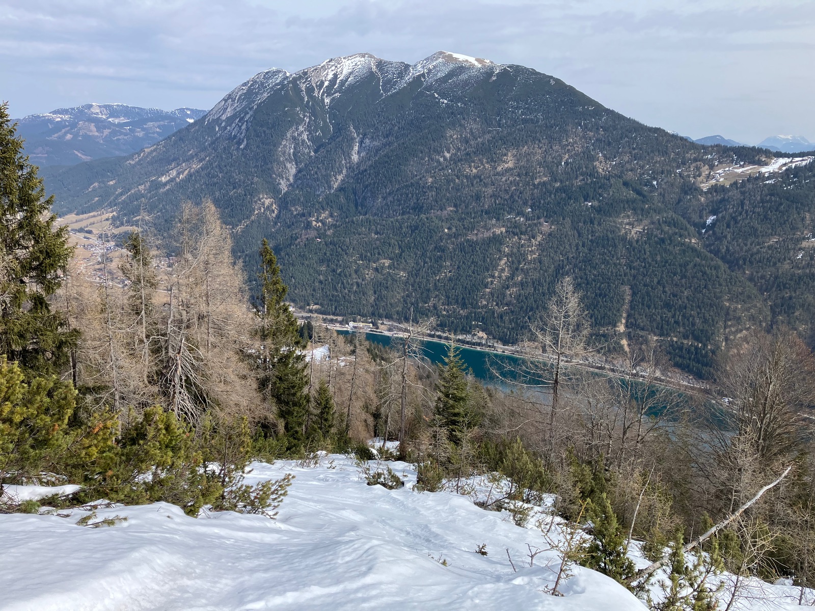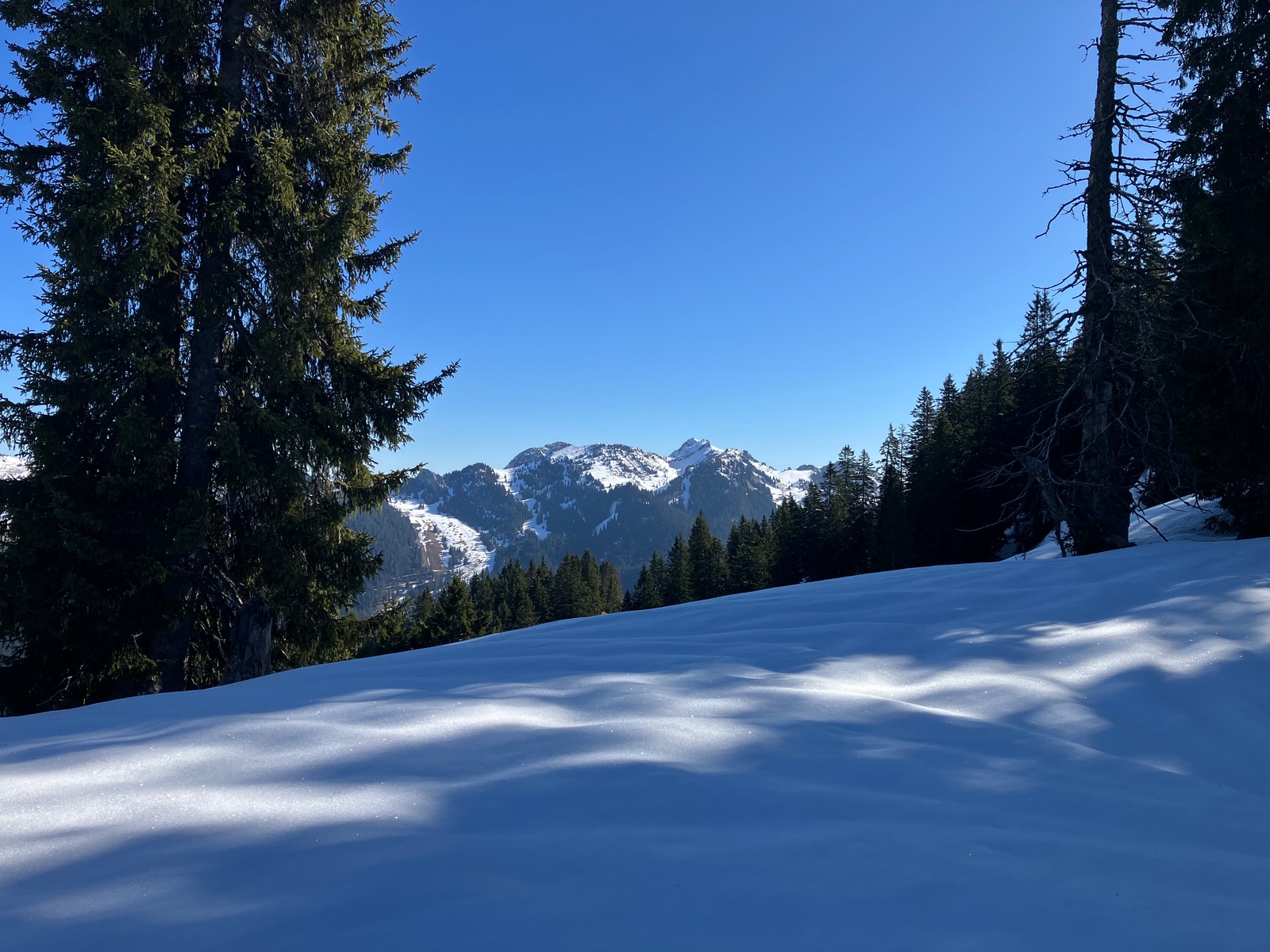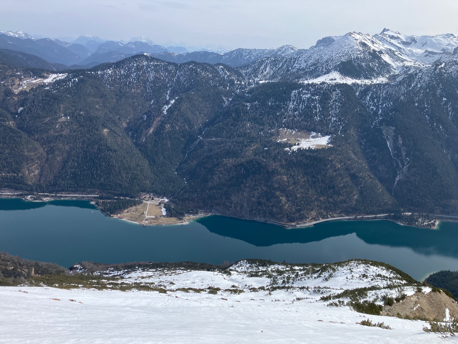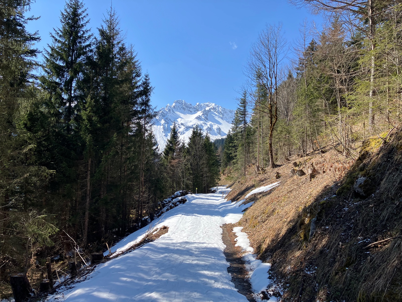 Start leider erst kurz vor 7:30 Uhr etwas vor dem Berninapass nach kalter und klarer Nacht. War dennoch zu spät, was auch der Tatsache geschuldet ist, dass ich die Tour bei den derzeitigen Verhältnissen unterschätzt habe. Zunächst muss man - noch durchgehend schneebedeckt - bis zum Beginn der eigentlichen Tour recht flach ansteigen (über den zugefrorenen Lago Bianco würde ich um diese Jahreszeit nicht gehen). Dann geht es bis zu einem im Gelände gut sichtbaren Sattel auf ca. 2.500 m. Ab dort gibt es drei Aufstiegsmöglichkeiten: (1) Direkt zur steilen Gletscherzunge - so ist es beim Skitourenguru eingetragen und so bin ich gegangen, (2) rechts haltend über ein System von Rippen - wohl gerade noch ausreichend Schnee und (3) links ausholend ein weiter Bogen in Richtung Forcula dal Caral. Variante (1) wird mindestens so steil, wie es von unten aussieht und erwies sich als mit Skiern (+ den obligatorischen Harscheisen) angesichts von Steilheit und kurz Blankeis ziemlich hart. Man kann das machen, aber dann empfehle ich unbedingt gleich unten die Steigeisen anzuziehen und erst wieder oben am Gletscher, wo dieser flach wird, diese auszuziehen. Sinnvoll sind auch Stahlsteigeisen, nicht nur Leichtsteigeisen - wie gesagt hatte es am Sonntag in diesem schneearmen Winter eine kurze Blankeisstelle, die gerade noch so zu umgehen war. Variante (2) haben zwei nachfolgende Tourengeher gemacht - ging wohl mit Skiern, aber mit längerer Querung oberhalb eines Felswandls. Variante (3) war meine Abfahrt und ist die einzige entspannte Variante, aber deutlich länger - wenn ich das vorher gewusst hätte, wäre meine Entscheidung für den Aufstieg dennoch so ausgefallen.