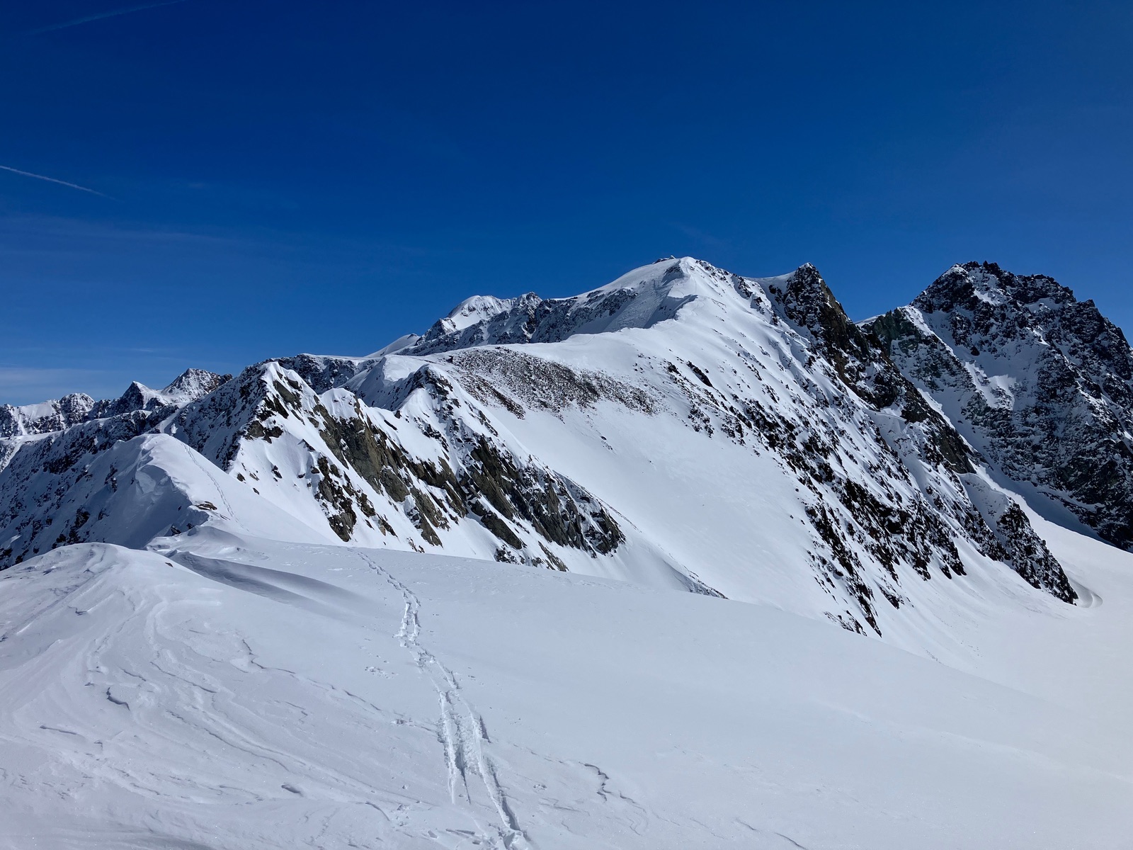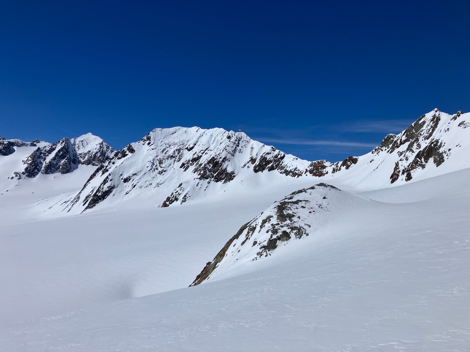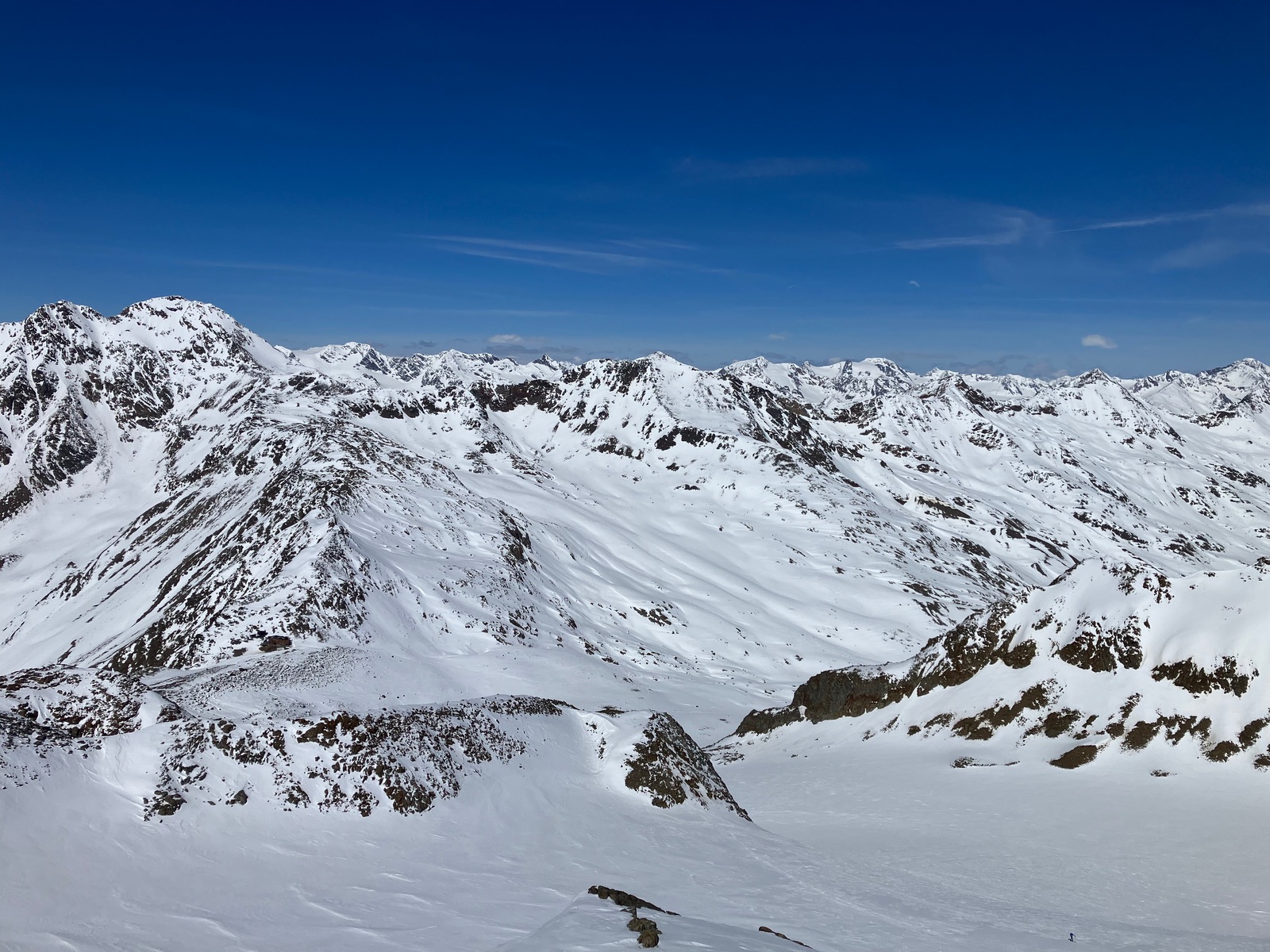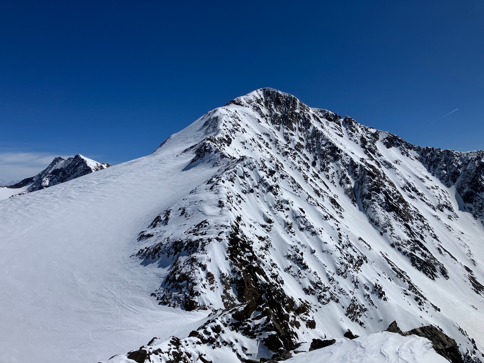 Insgesamt haben ich die Tour bei den derzeitigen Bedingungen als deutlich strenger empfunden, als ich das nach vereinzelten Internetberichten angenommen hätte. Auch hat so die Zeitangabe beim Skitourenguru für mich nicht gepasst - ich denke, das ist gerechnet, wenn man (fast) alles mit Skiern gehen kann. Für die Tour ist m.E. die volle alpinistische Ausrüstung (Pickel, Steigeisen, Harscheisen, ggf. Gletscherzeug) sinnvoll. Das Wandl selber ist vermutlich nur mit Körpersicherung absicherbar.
