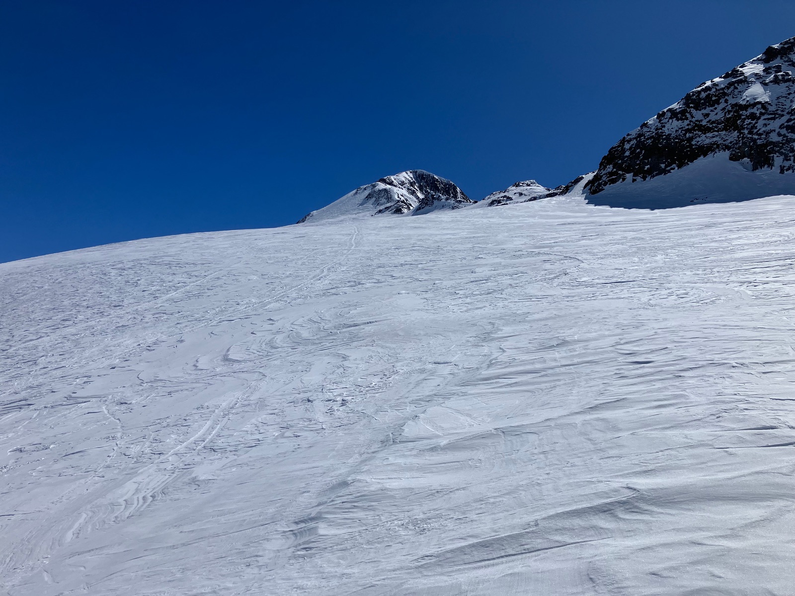 Die Abfahrt / Abstieg vom Piz Cambrena weist dann die oben genannten kniffeligen Stellen auf, wobei sich die eigentlich Ostflanke gut abfahren lässt. Entspannt ist es aber wirklich erst, wenn man wieder zurück am Gletscher ist. Am Sonntag selbst gegen frühen Vormittag trotz Ostexposition noch gut - meistens wird man aber früher dran sein müssen. Und ein früherer Aufstieg hätte auch den Vorteil gehabt, nicht solange in der segenden Sonne zu sein.