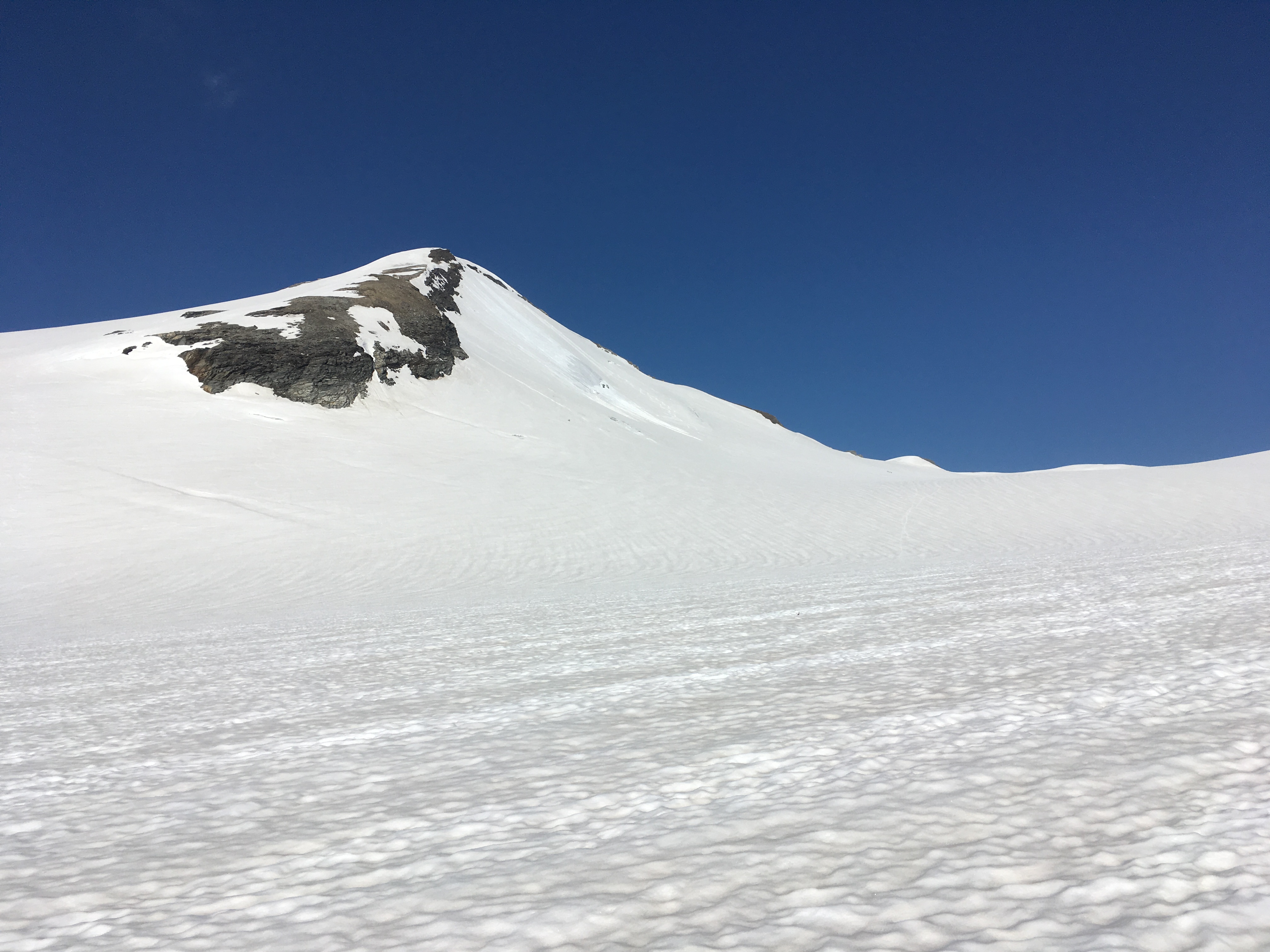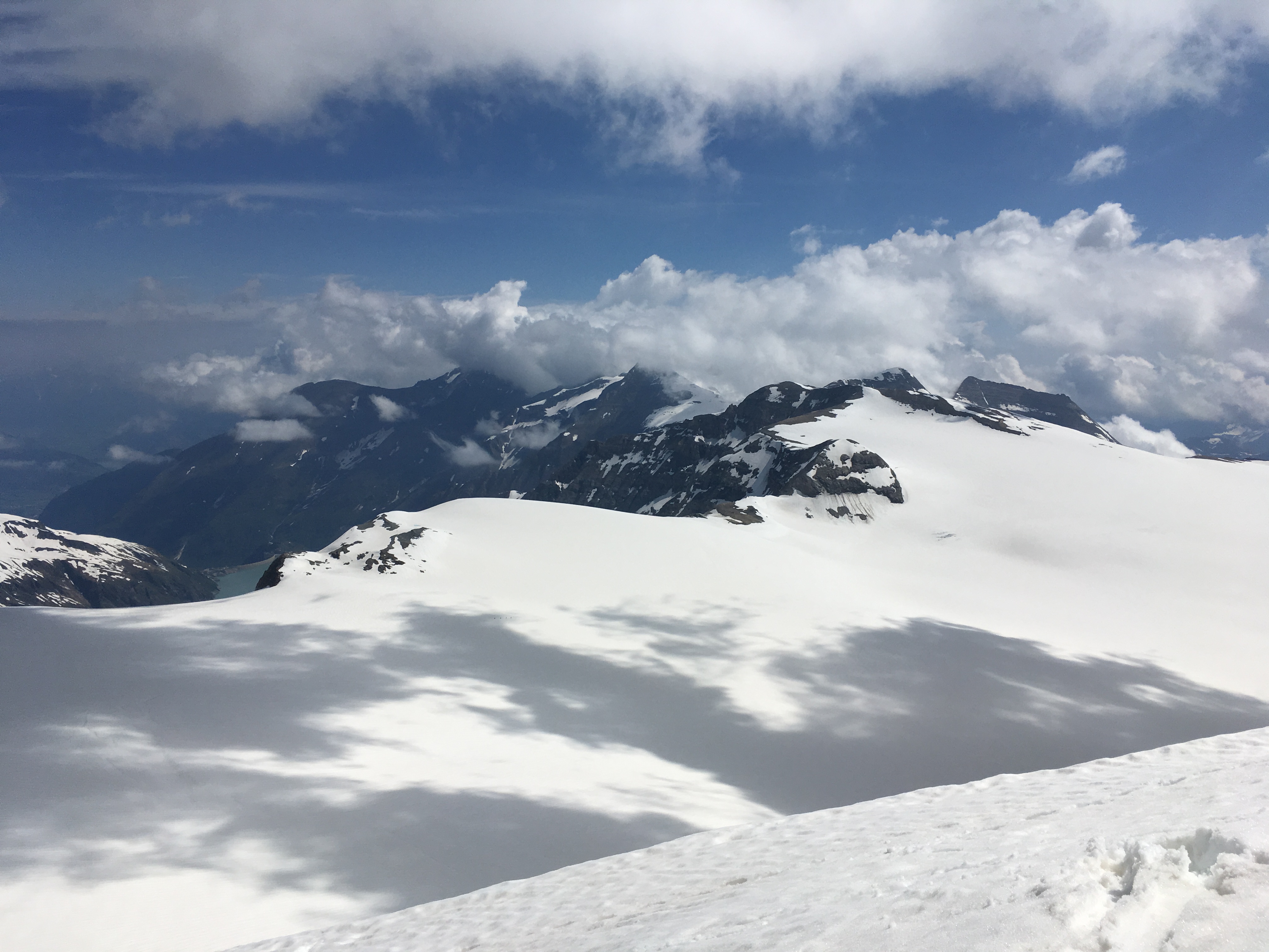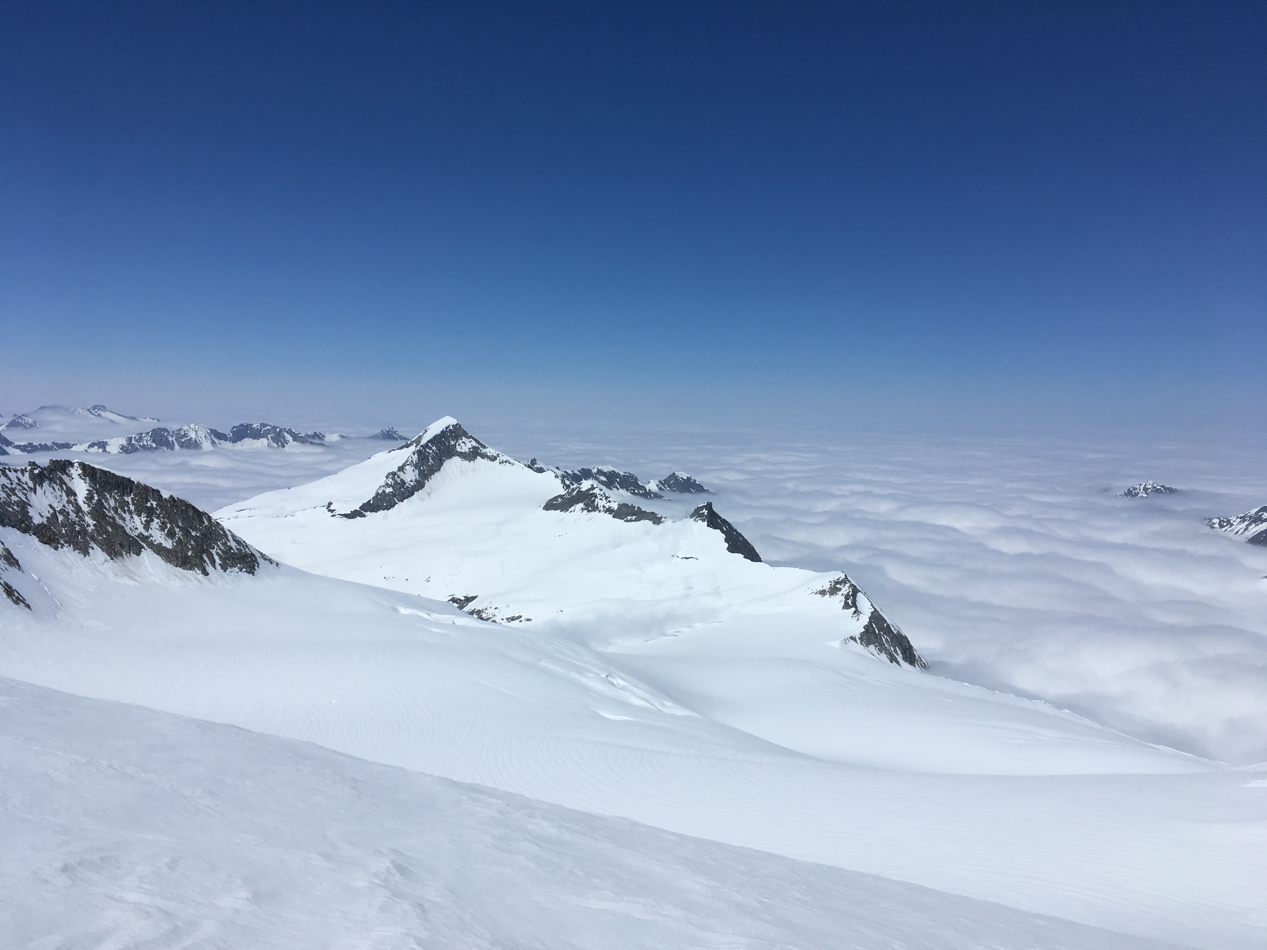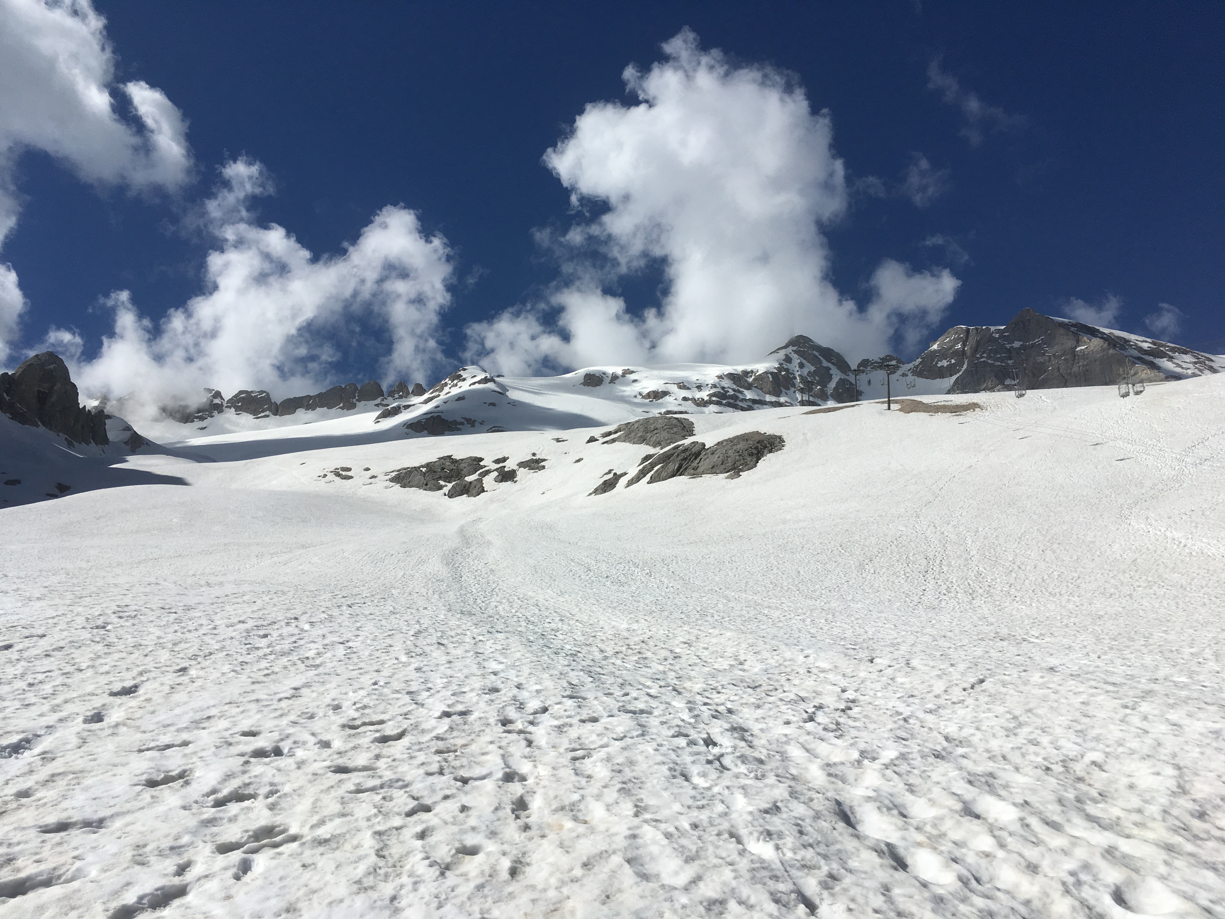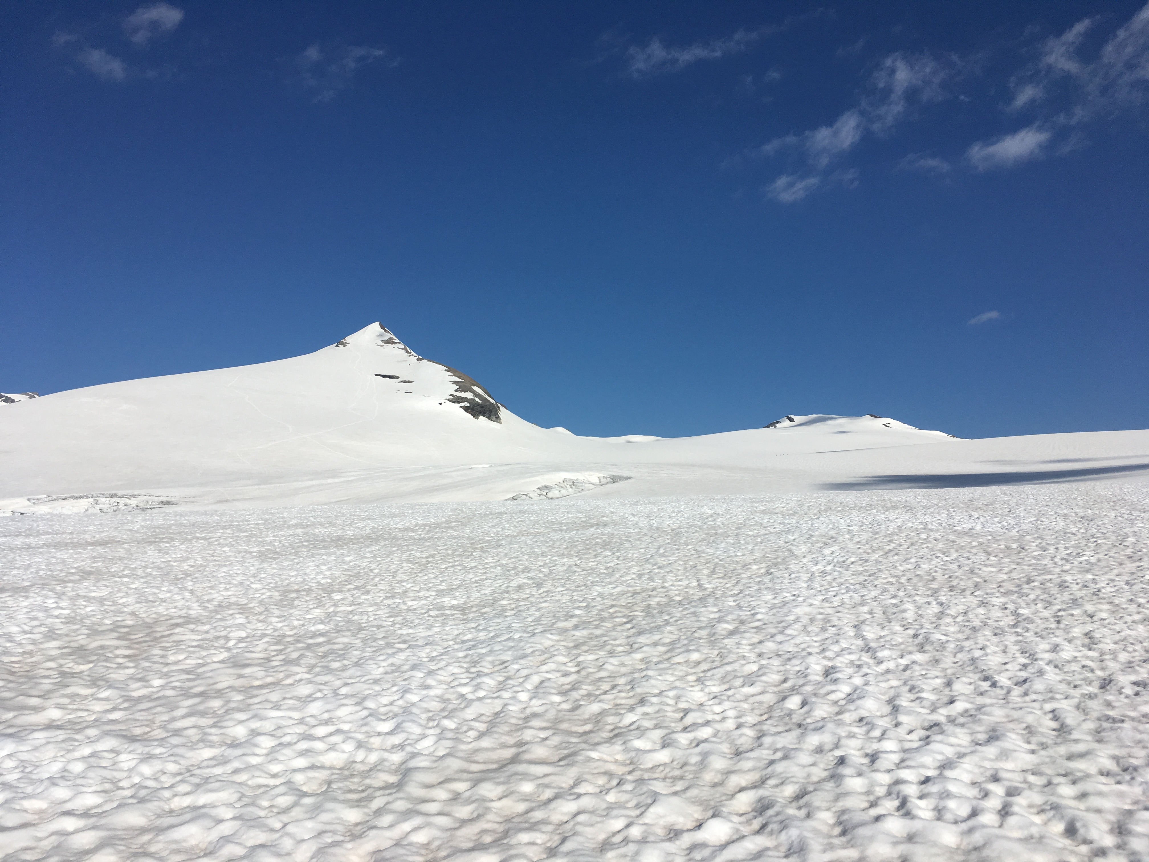 Die Abfahrt (über Normalroute von der S-O-Seite) bot bremsenden Schnee, am Oberen Pasterzenboden schieben nötig, unten Sommerschnee.