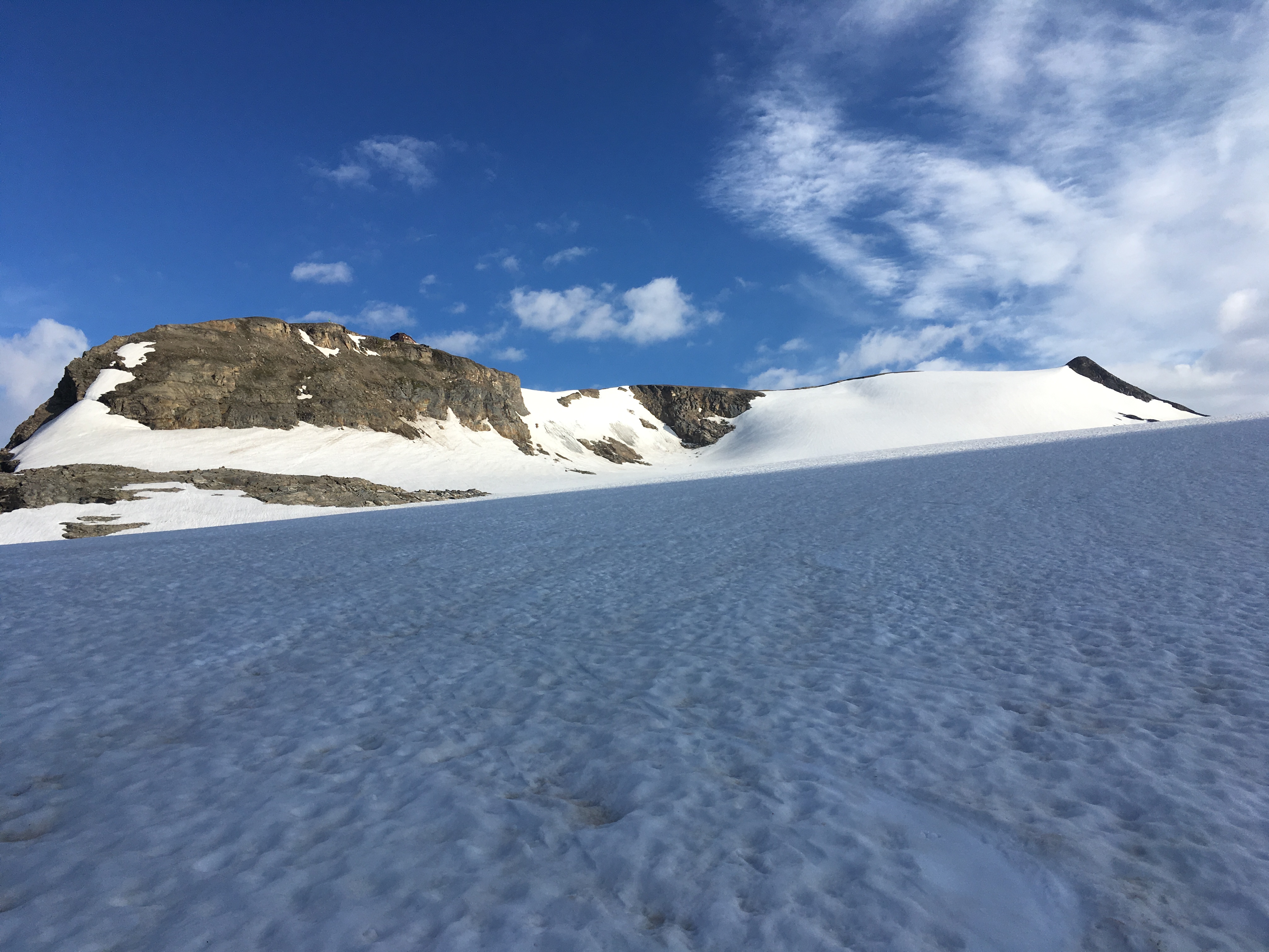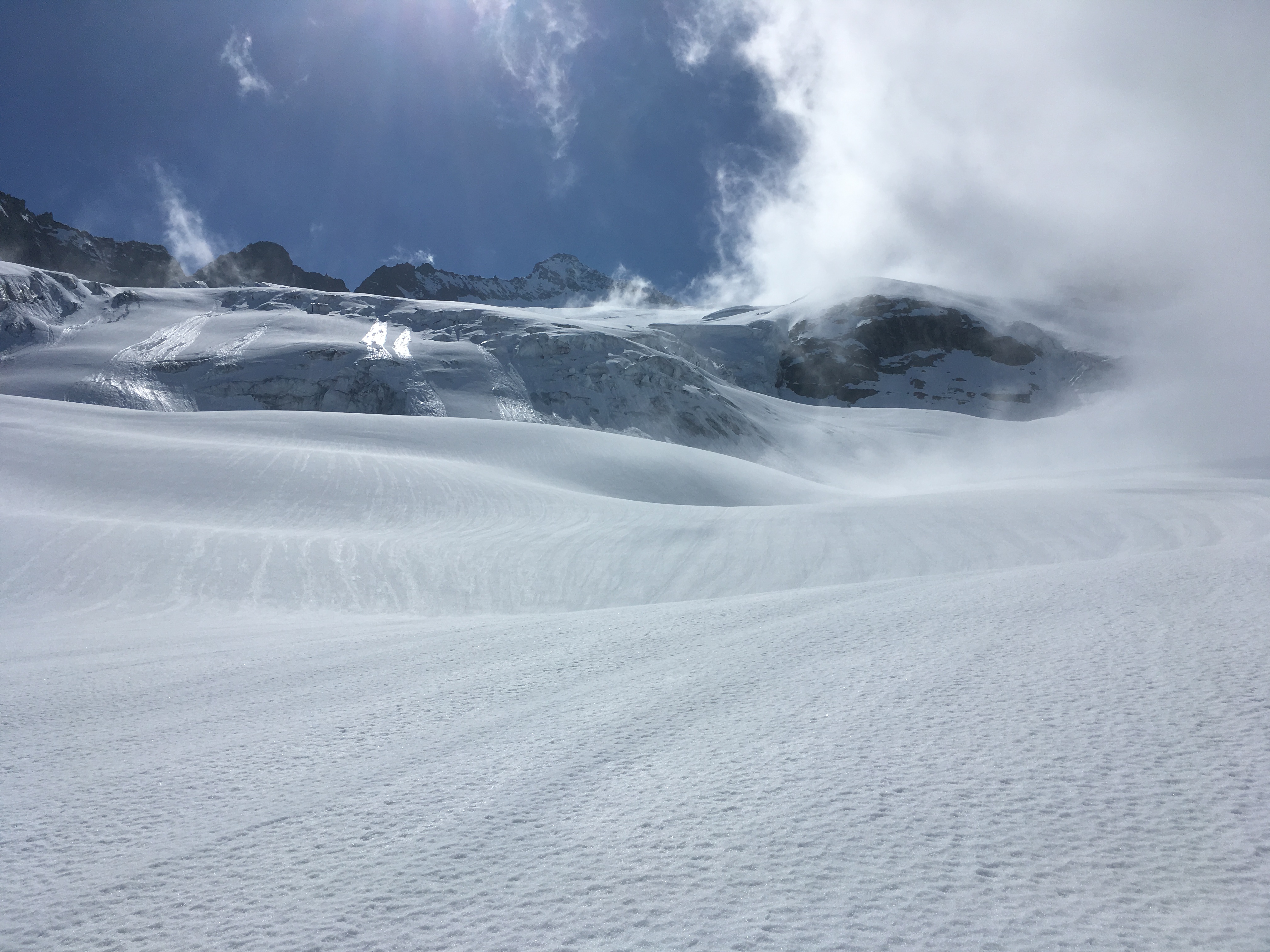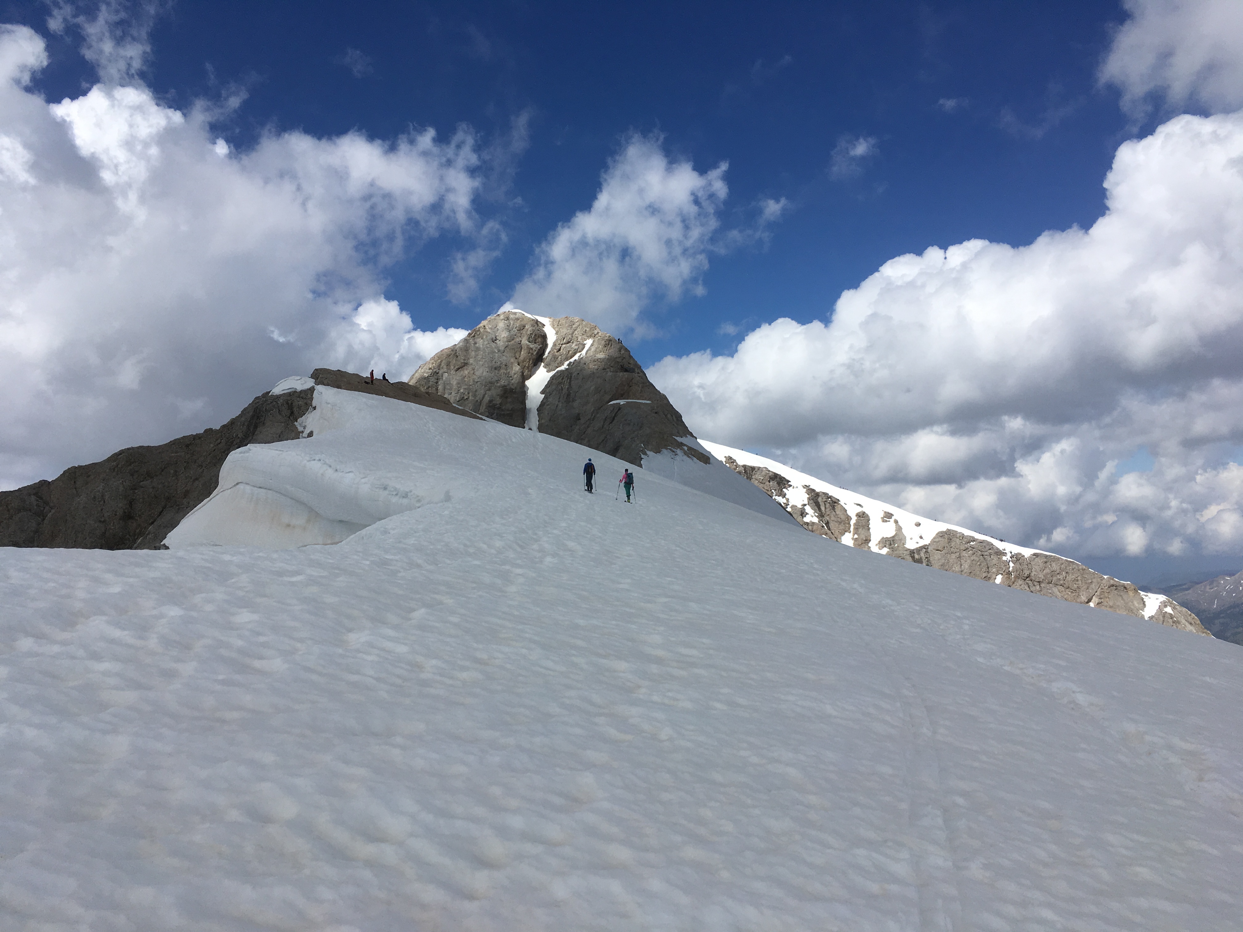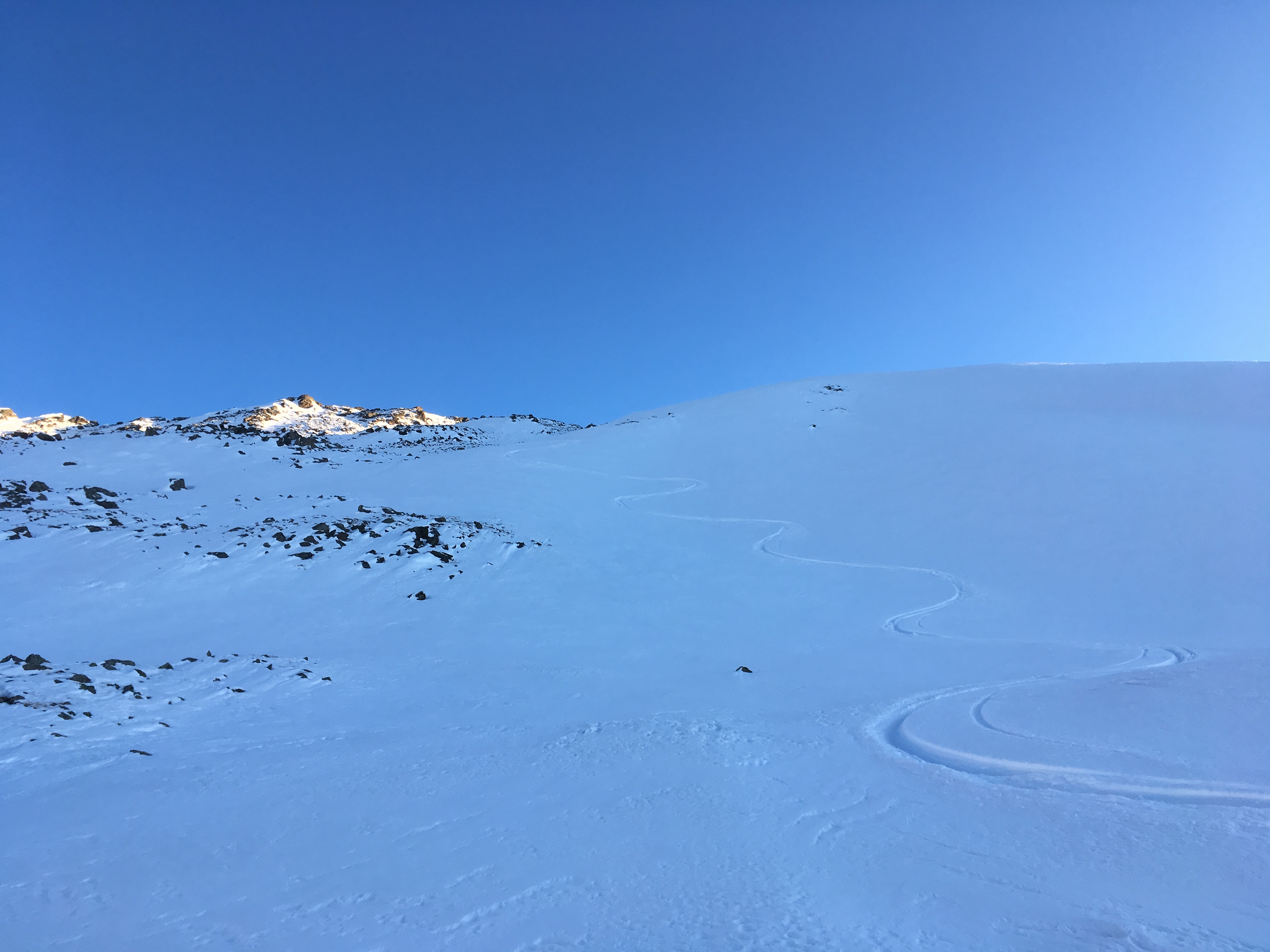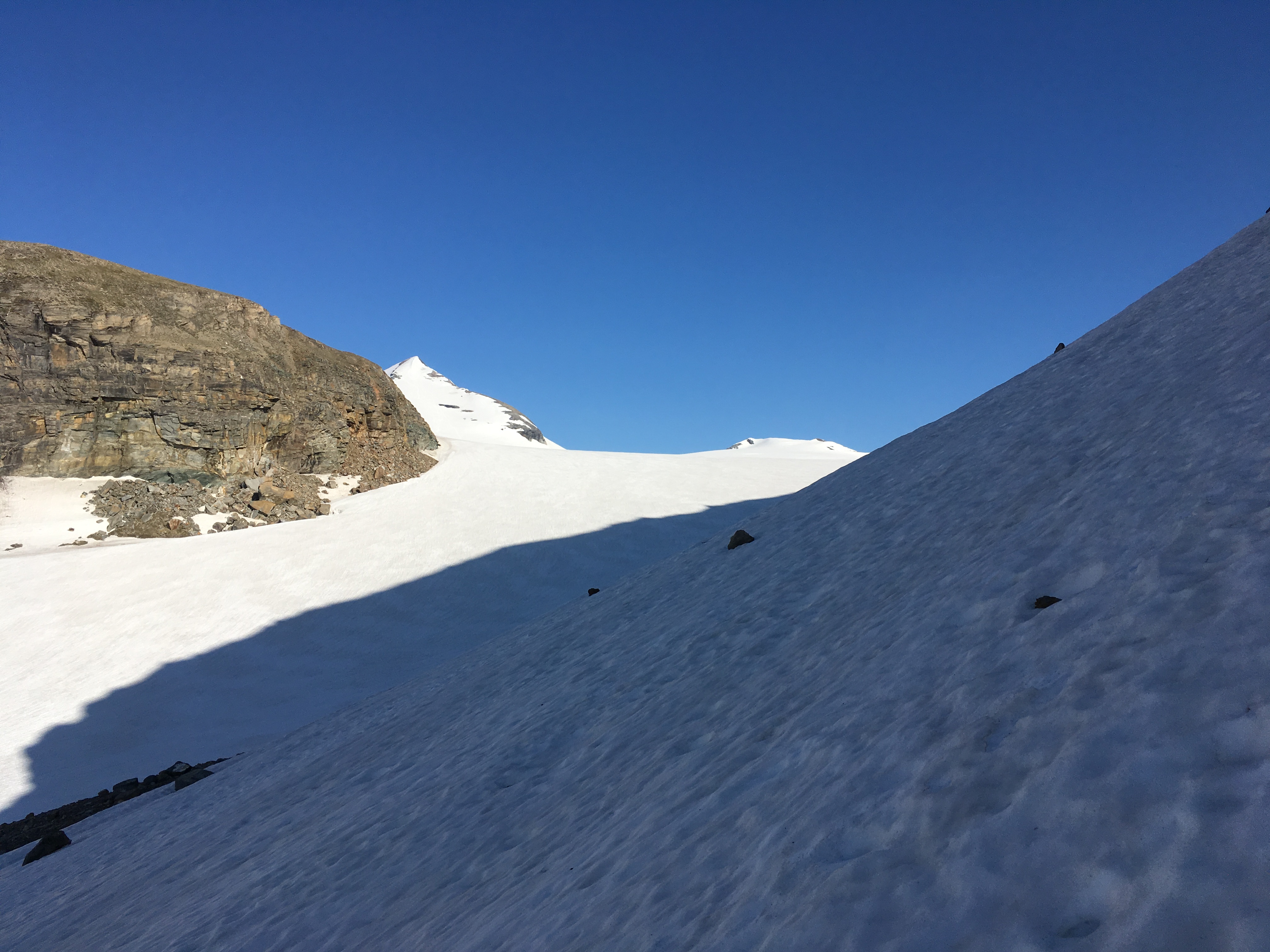 Die Abfahrt (über Normalroute von der S-O-Seite) bot bremsenden Schnee, am Oberen Pasterzenboden schieben nötig, unten Sommerschnee.