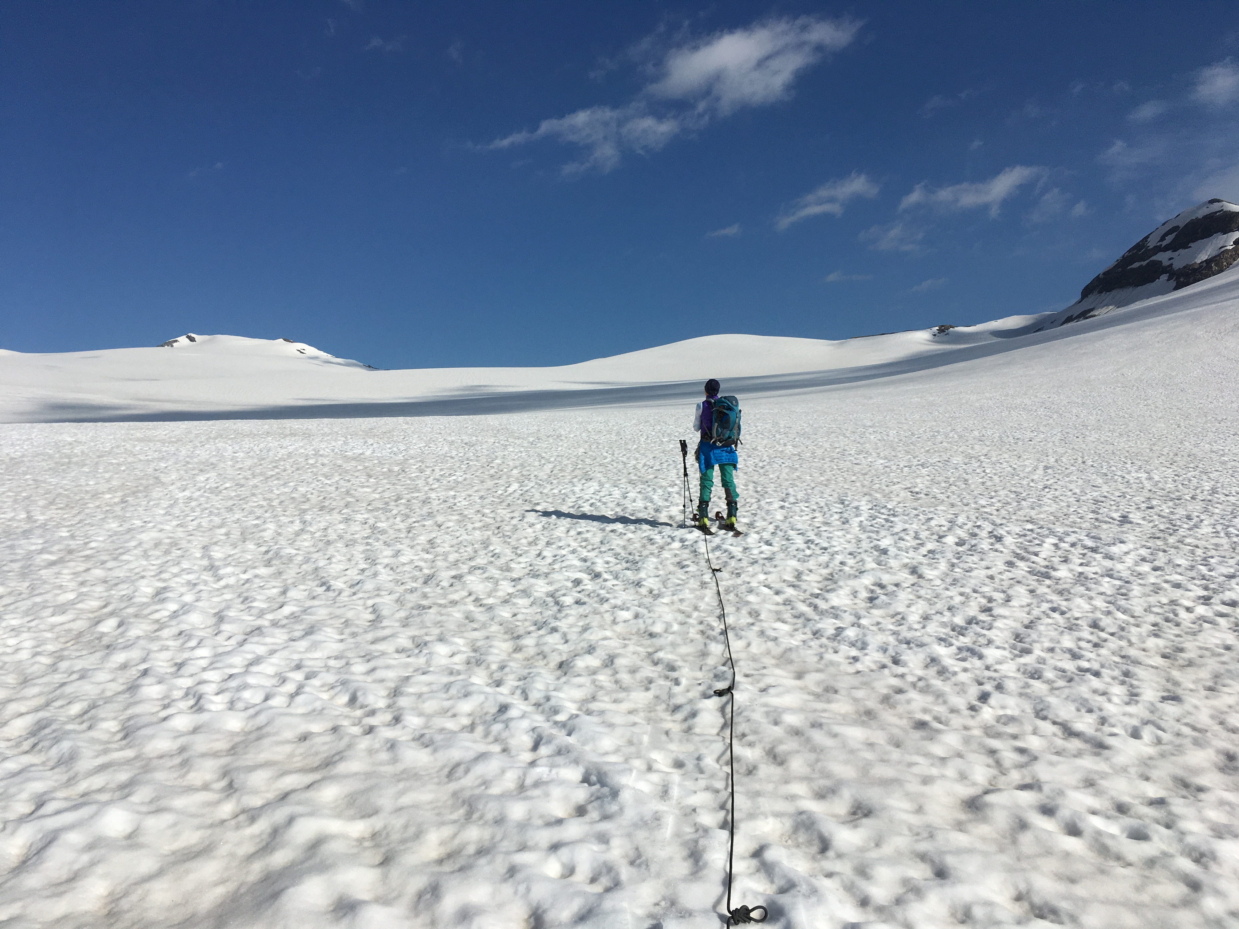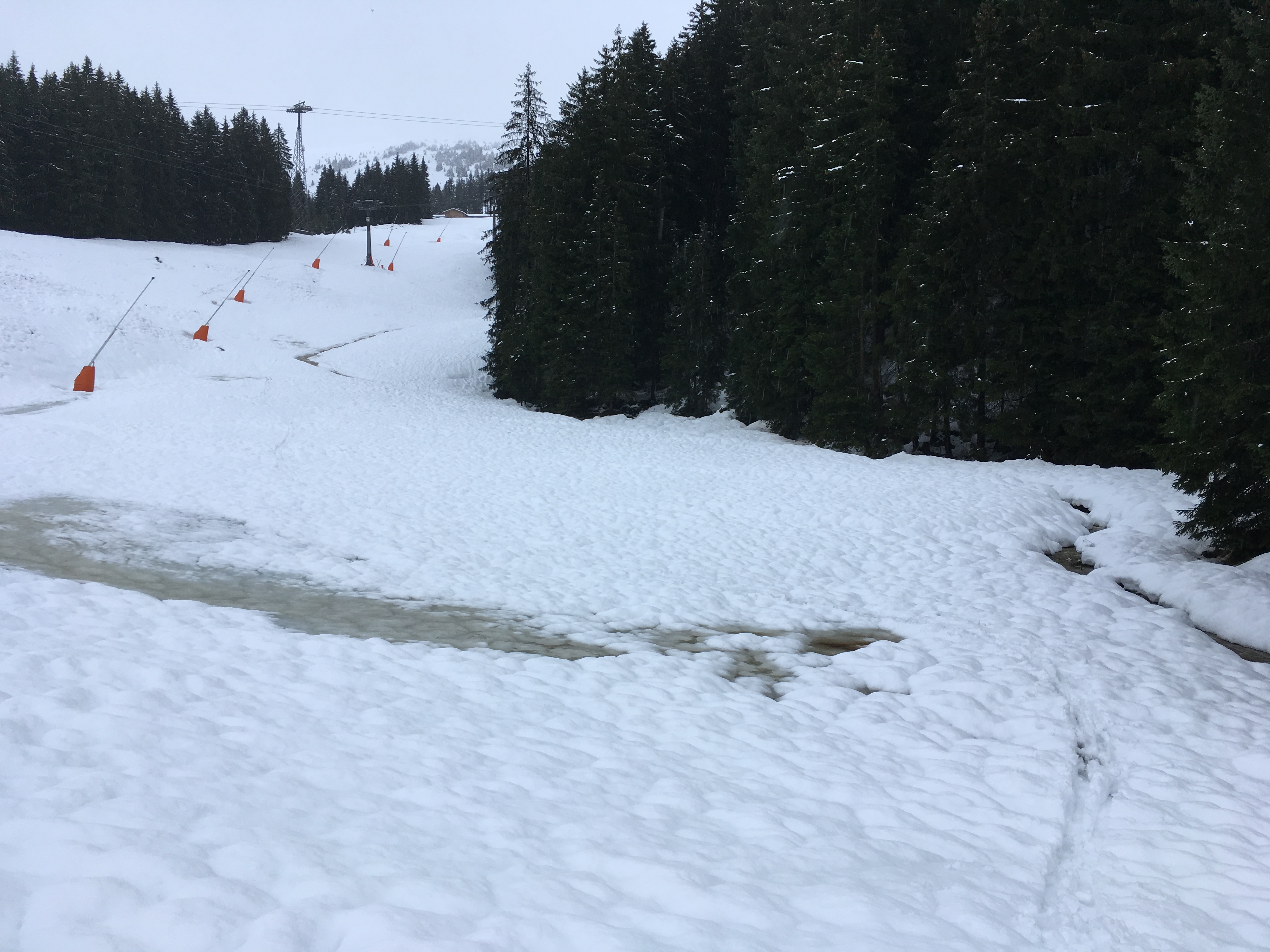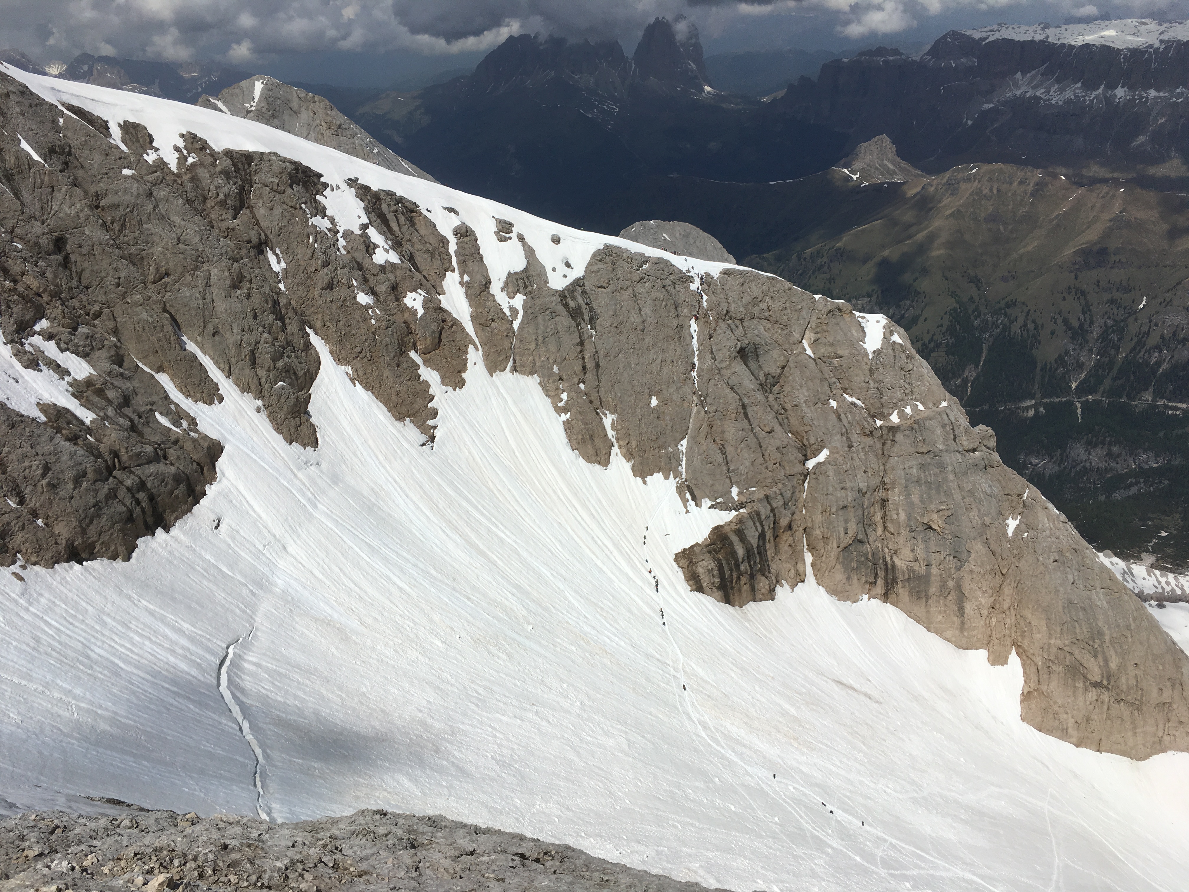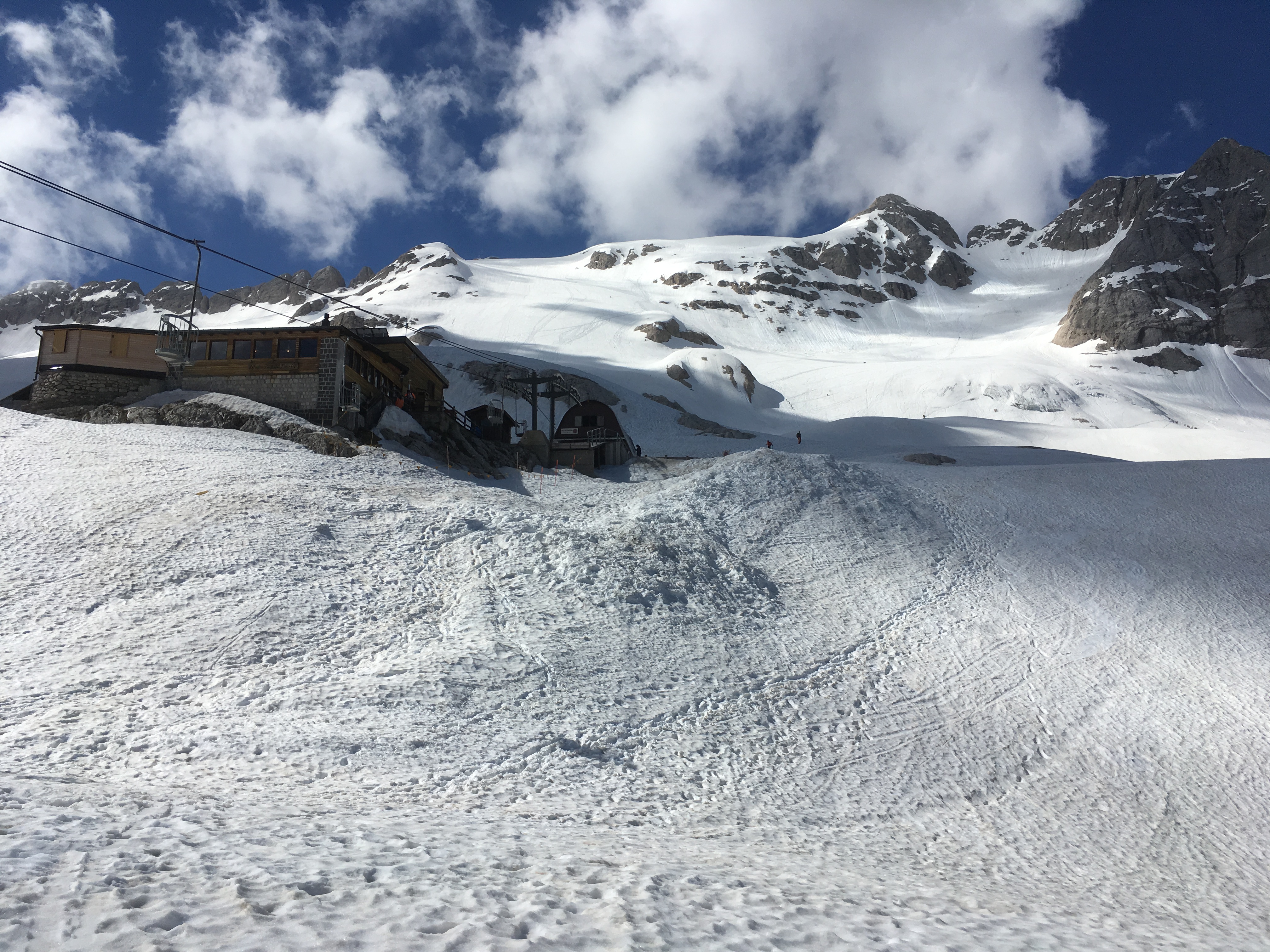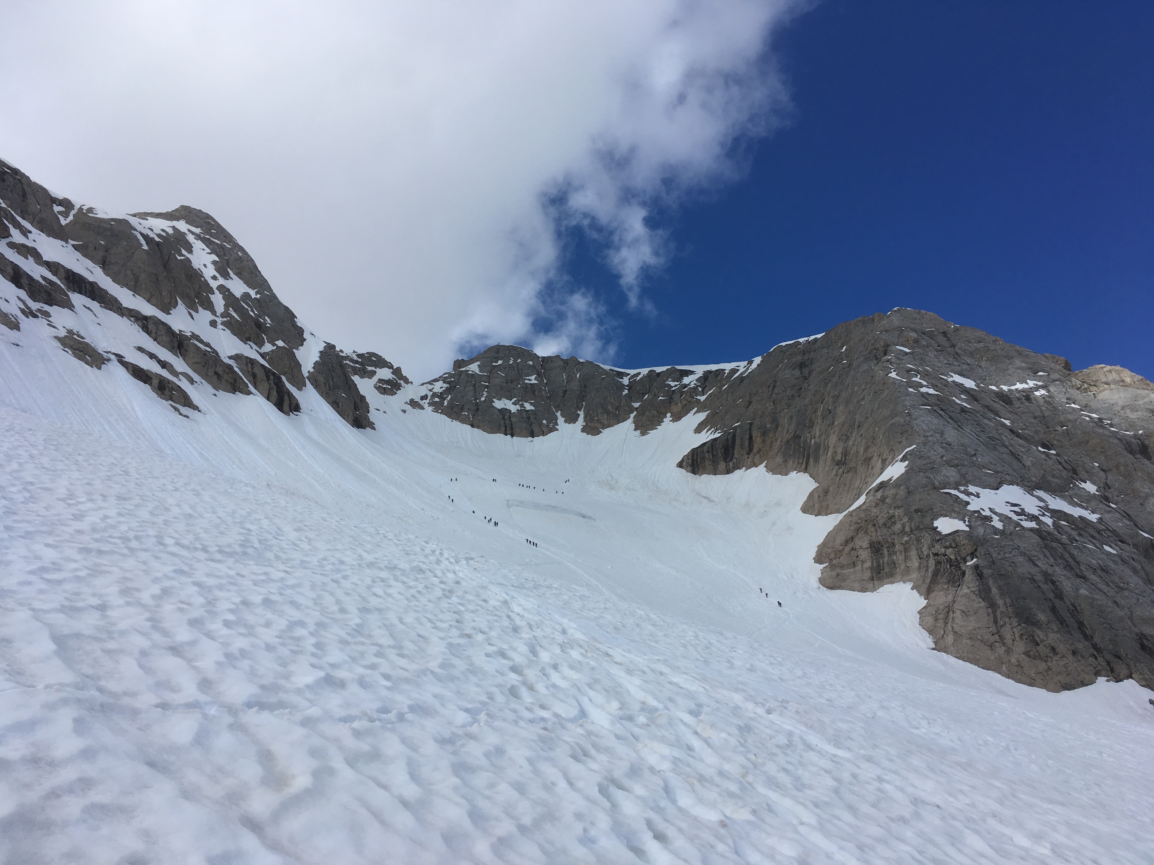 Die Abfahrt (über Normalroute von der S-O-Seite) bot bremsenden Schnee, am Oberen Pasterzenboden schieben nötig, unten Sommerschnee.