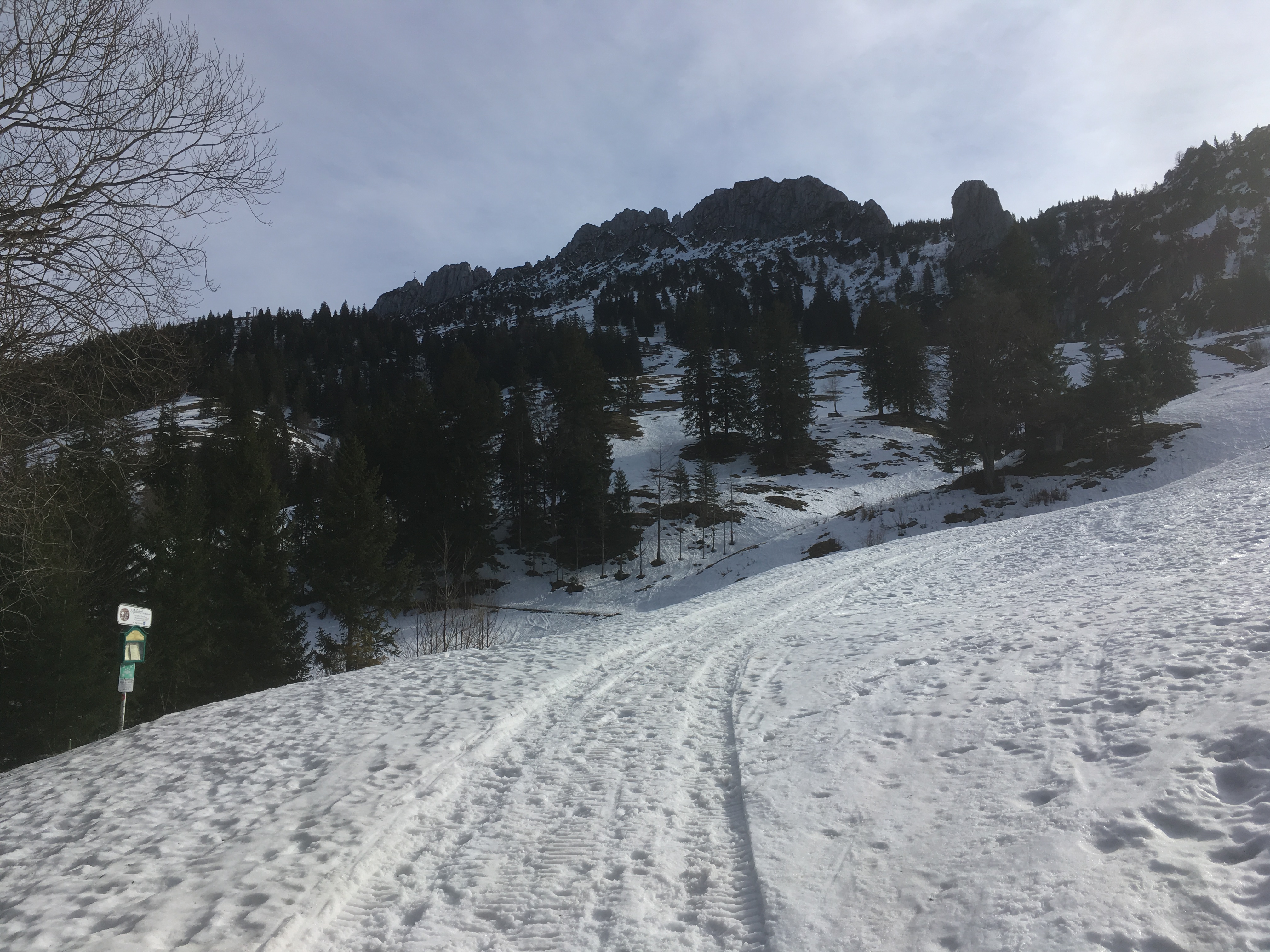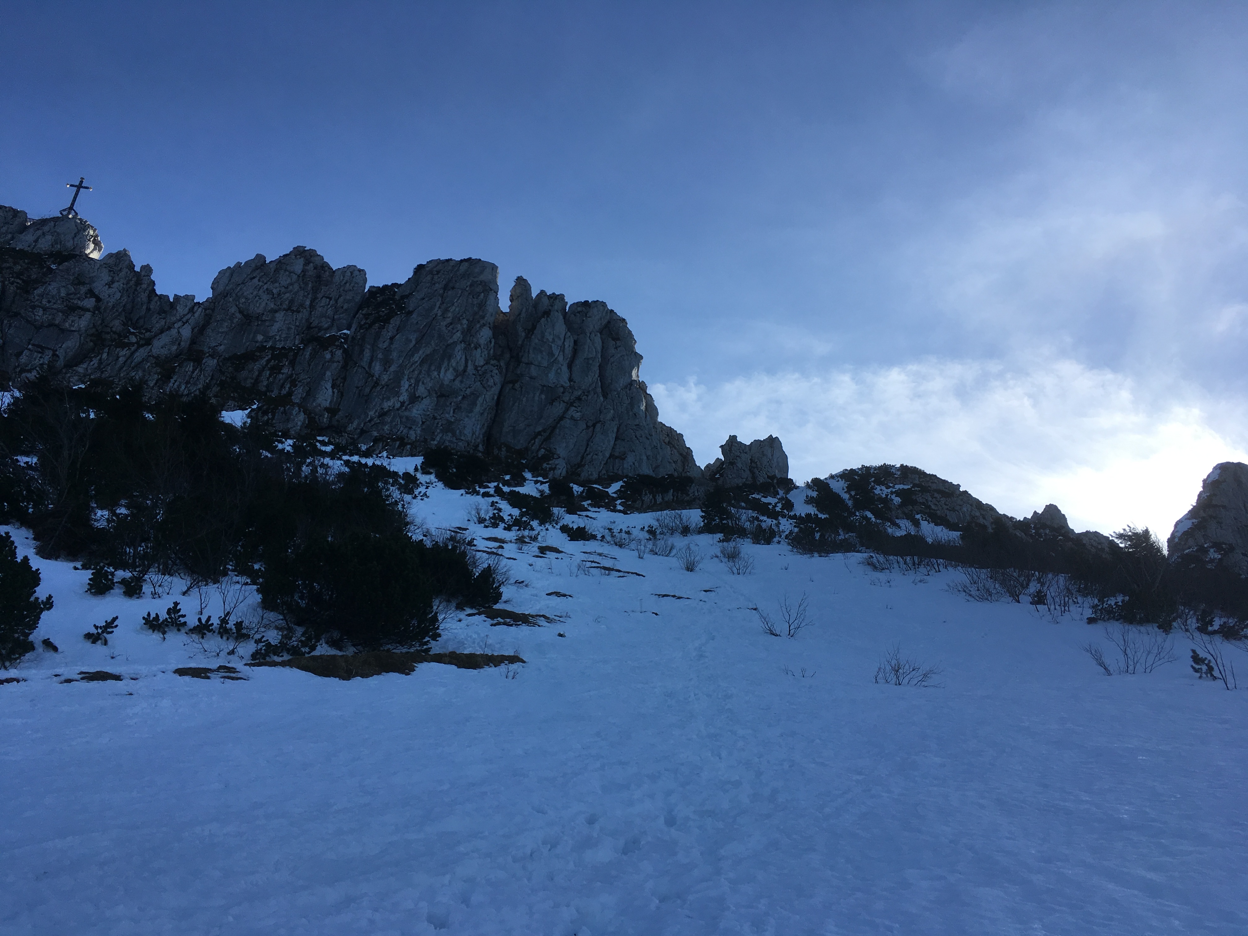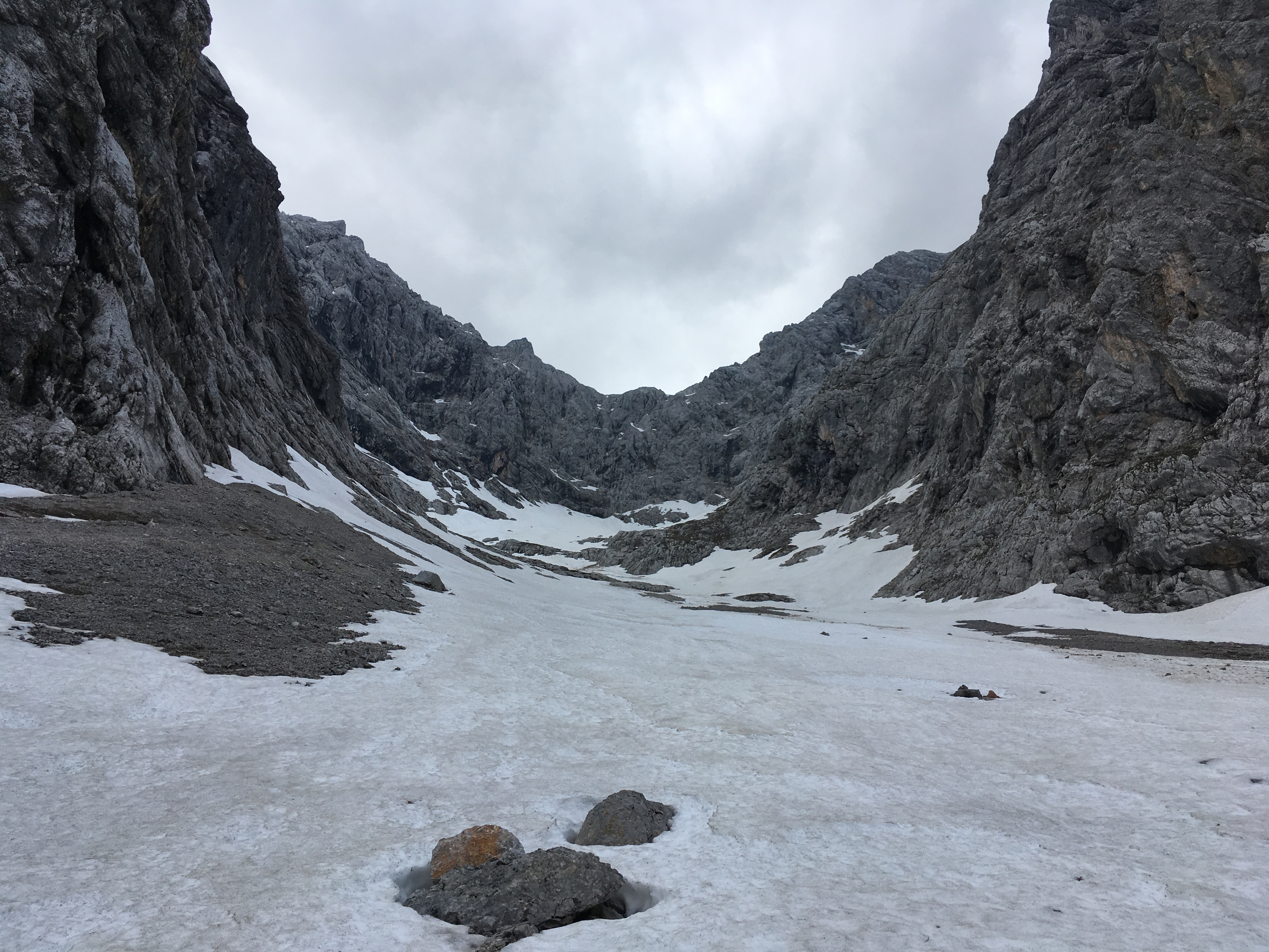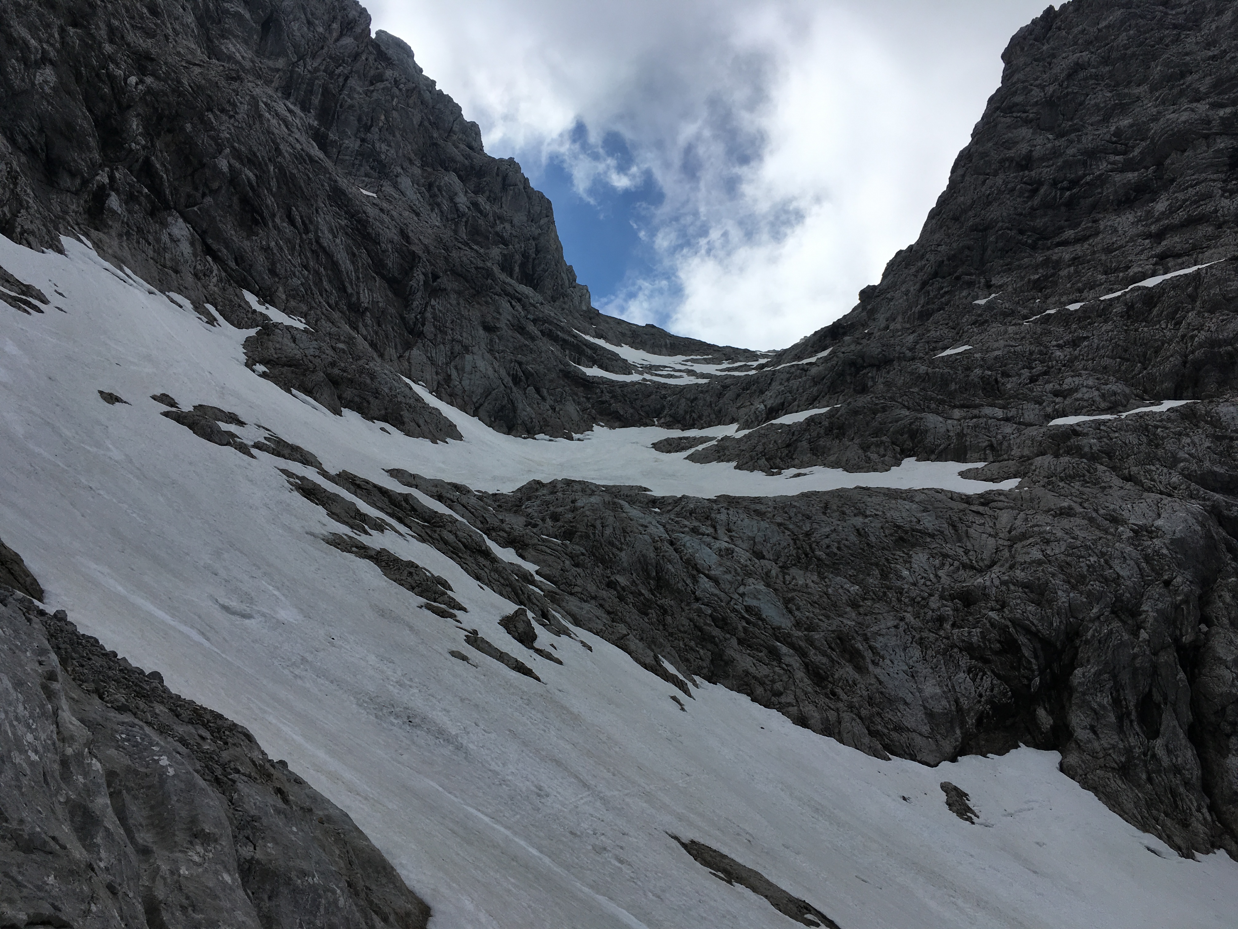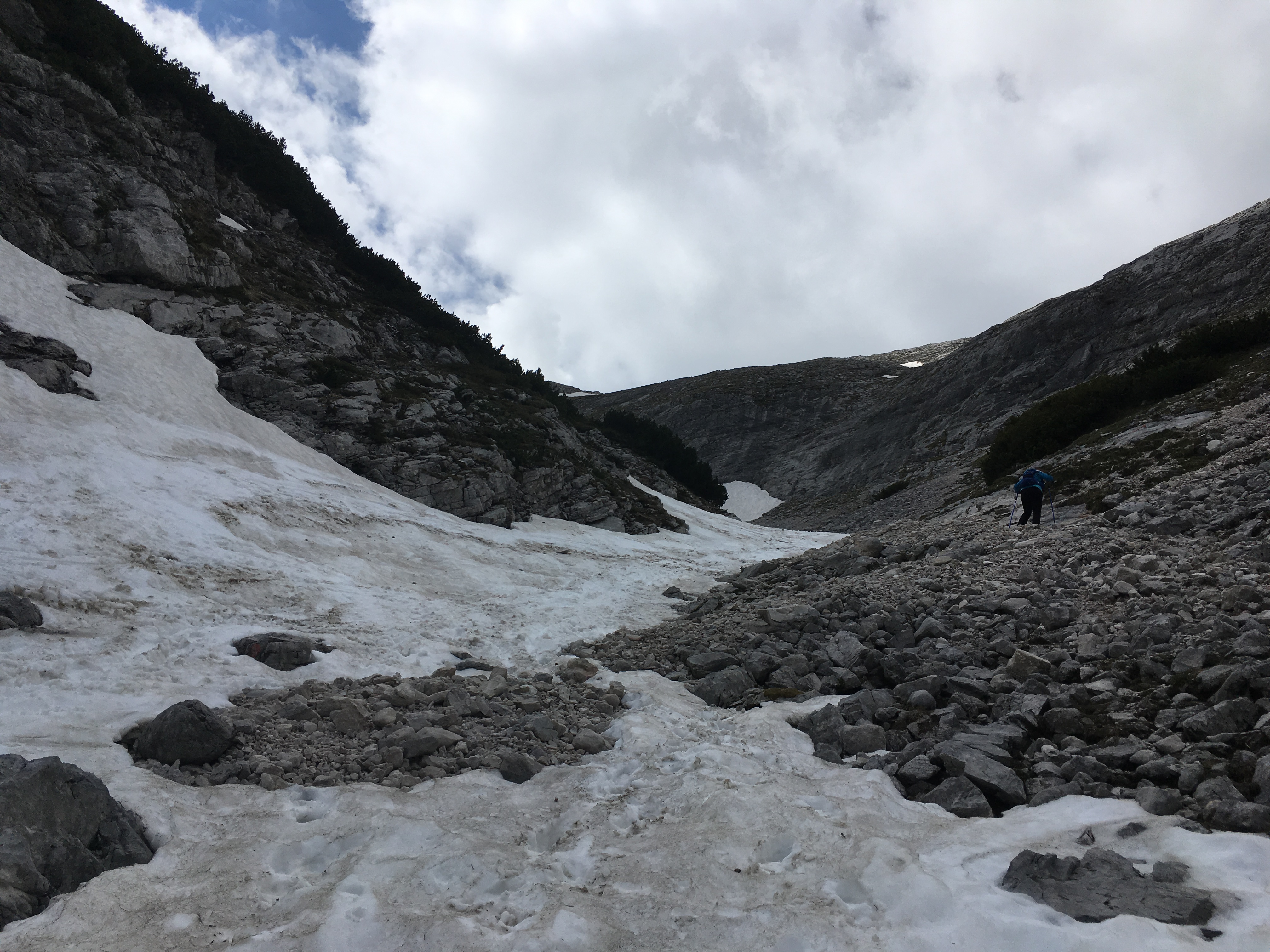 Typisches Gelände I im ersten Teil des Mainzer Höhenwegs: Eine Kombination aus Schneefeldern und Felsstufen: