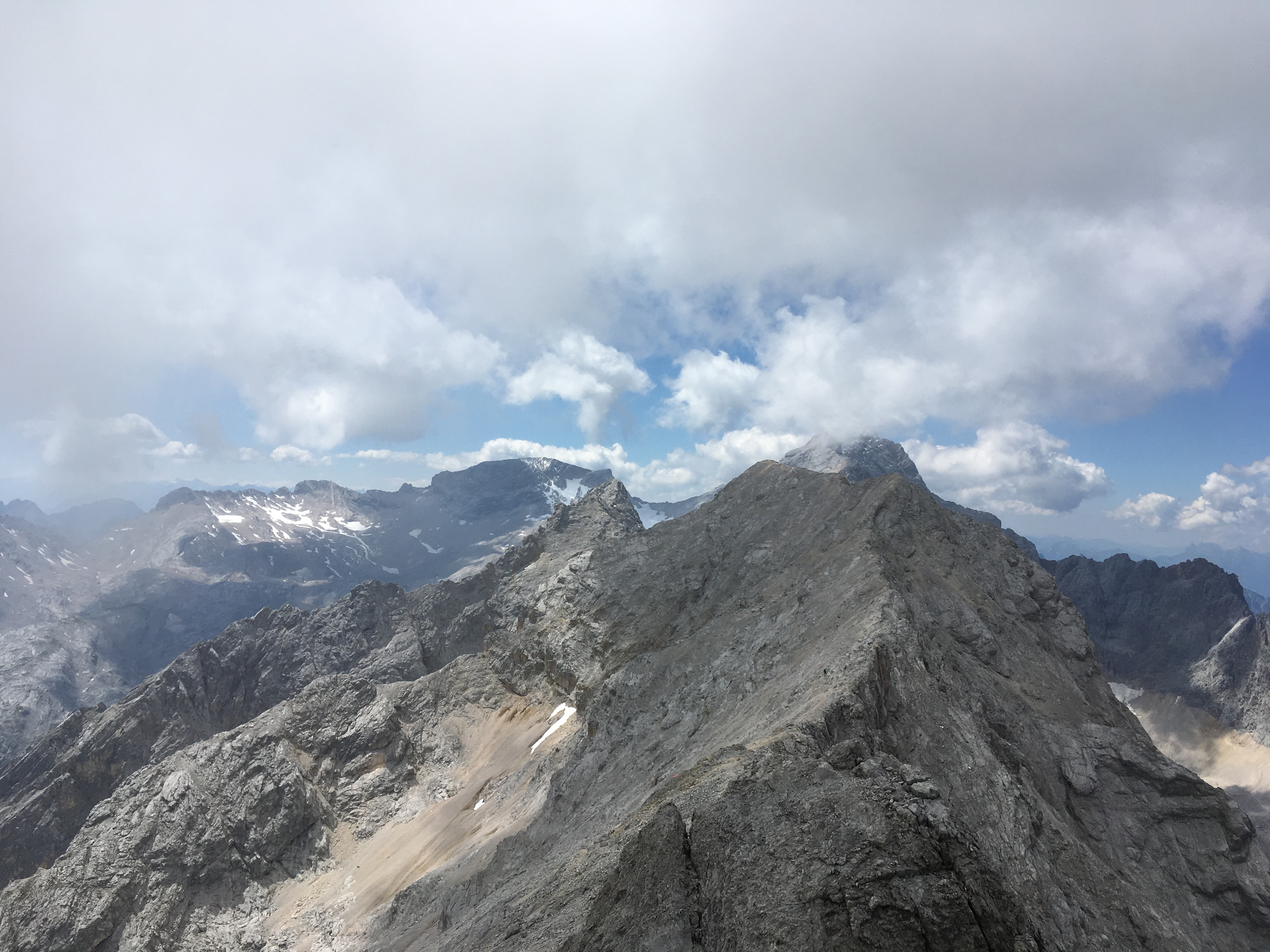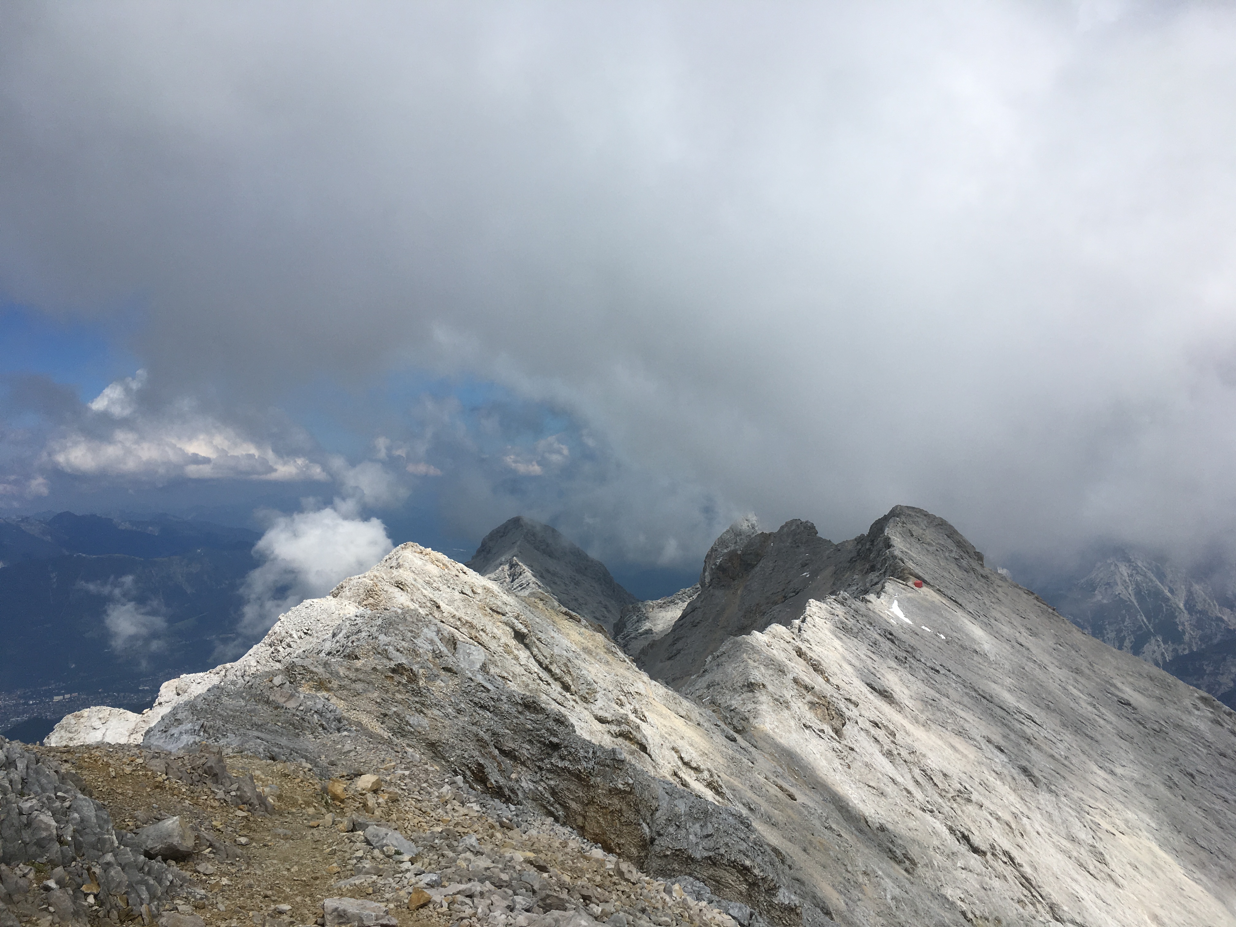 Hinweis (3): Die Zeiten in den Internetbeschreibungen und auch vor Ort sind m.E. für geübte Bergsteiger (und andere sollten die Route trotz der Bezeichnung "Höhenweg" besser nicht machen) nicht realistisch im Sinne von viel zu lang. Man liest von 10 - 12 h von Hütte zu Hütte ohne Pause. Das wäre ja ein ganzer Bergtag, wenn Pausen eingerechnet werden. Allerdings geht sich die Route bei weitem nicht so schnell, wie man es rein nach der Karte vermuten würde: Ein ständiges Auf und Ab sowie viel brüchiges Gelände kosten Zeit, die grandiose Aussicht sowieso. Ich war gestern hitzebedingt und konditionell angeschlagen recht langsam unterwegs und habe ca. 11 h ab Huben hin und zurück inklusive längerer Pausen gebraucht (nur am Ende mit hohen Tempo wegen aufziehenden Schlechtwetters). Der Abschnitt Weißmaurachjoch bis Abstieg ins Pollestal ca. 4 h 15 min mit langen Pausen. Wer gut drauf ist, schafft das bestimmt schneller - aber man muss ja auch wieder ins Tal, also Kraftreserve halten - und wer wollte schon bei der Aussicht es schnell "durchreißen"? Den Abstecher zum Puitkogel werden aber wahrscheinlich nur äußerst Trainierte schaffen, war für mich gestern leider nicht drinnen.