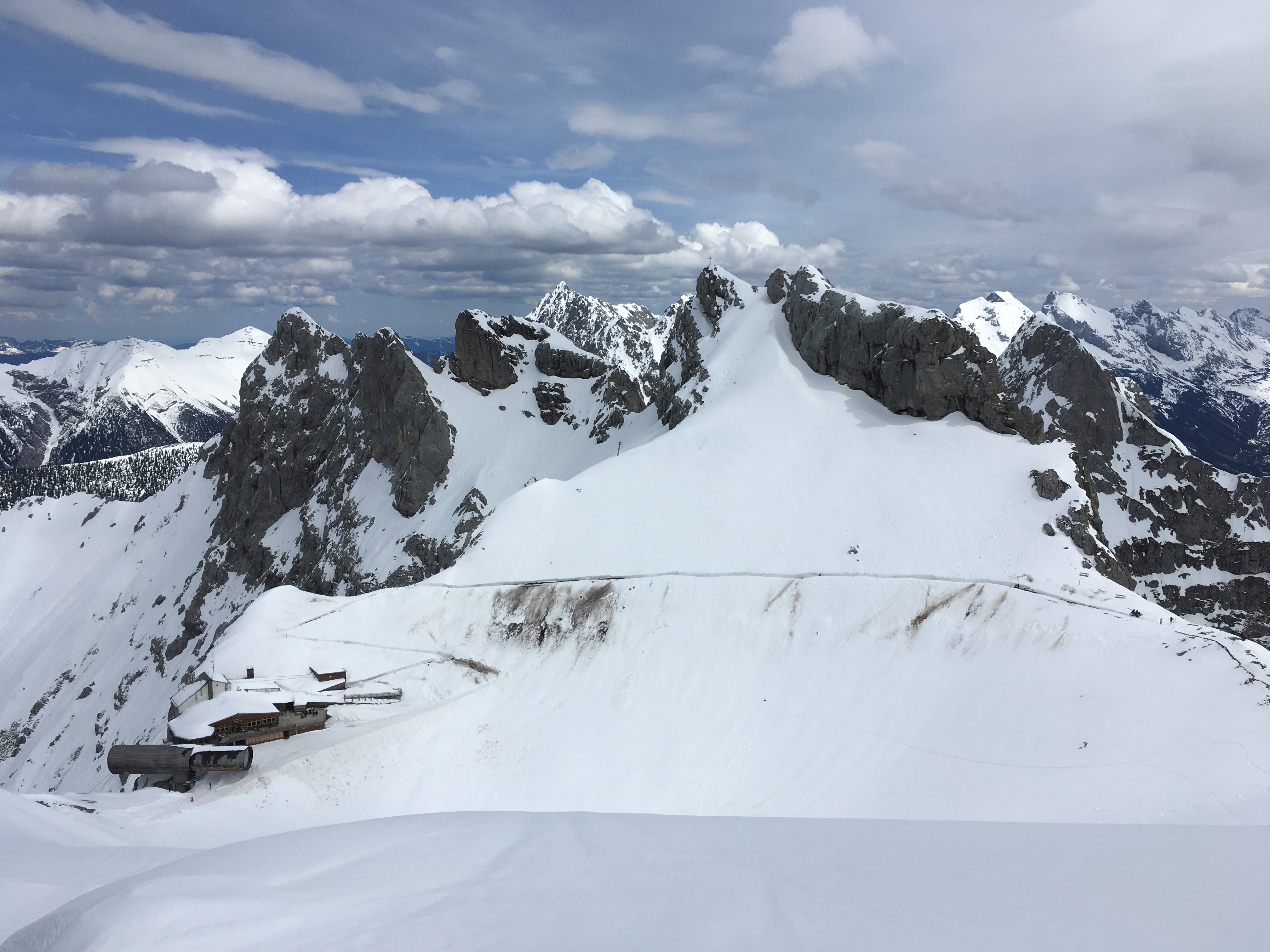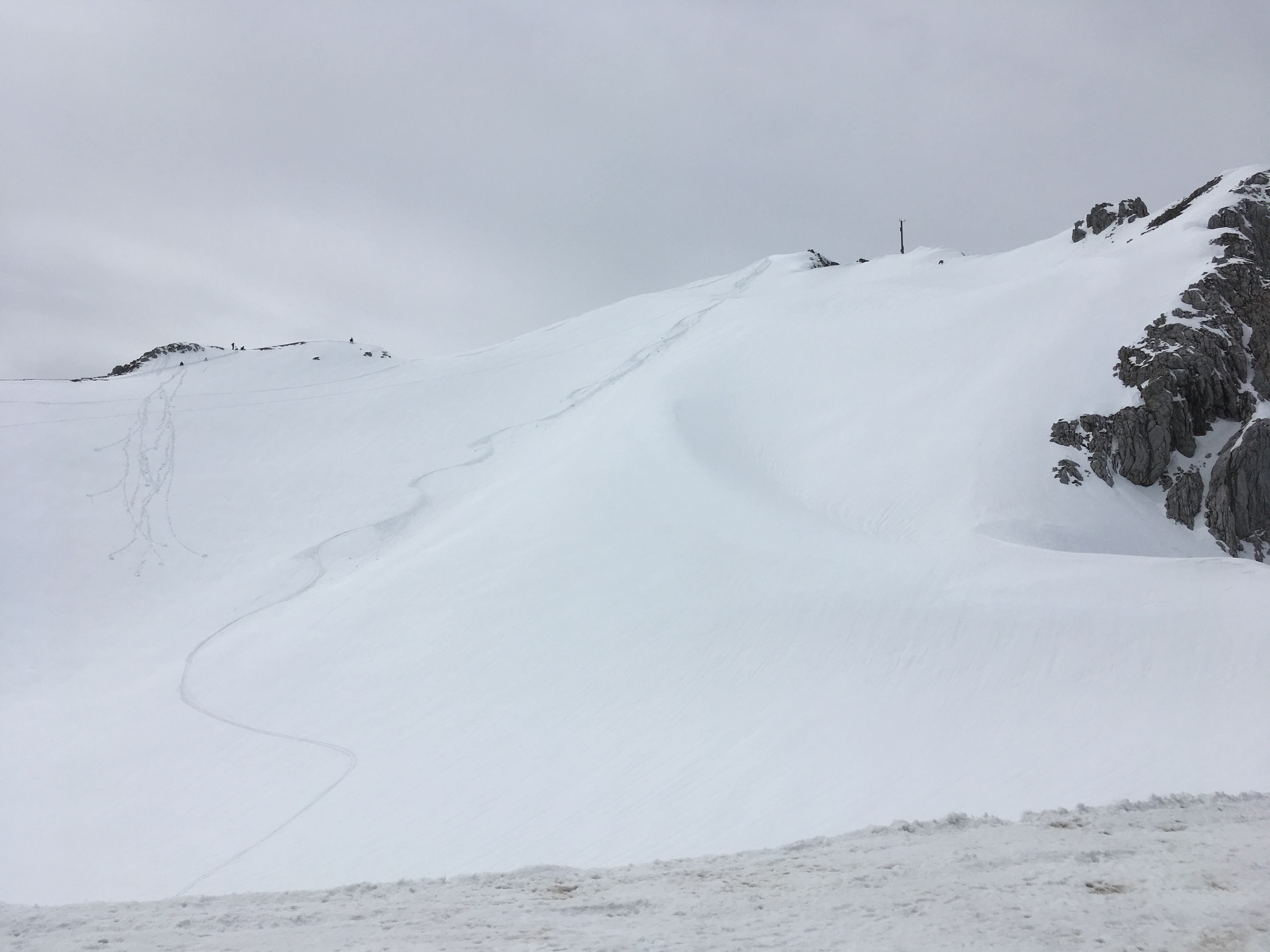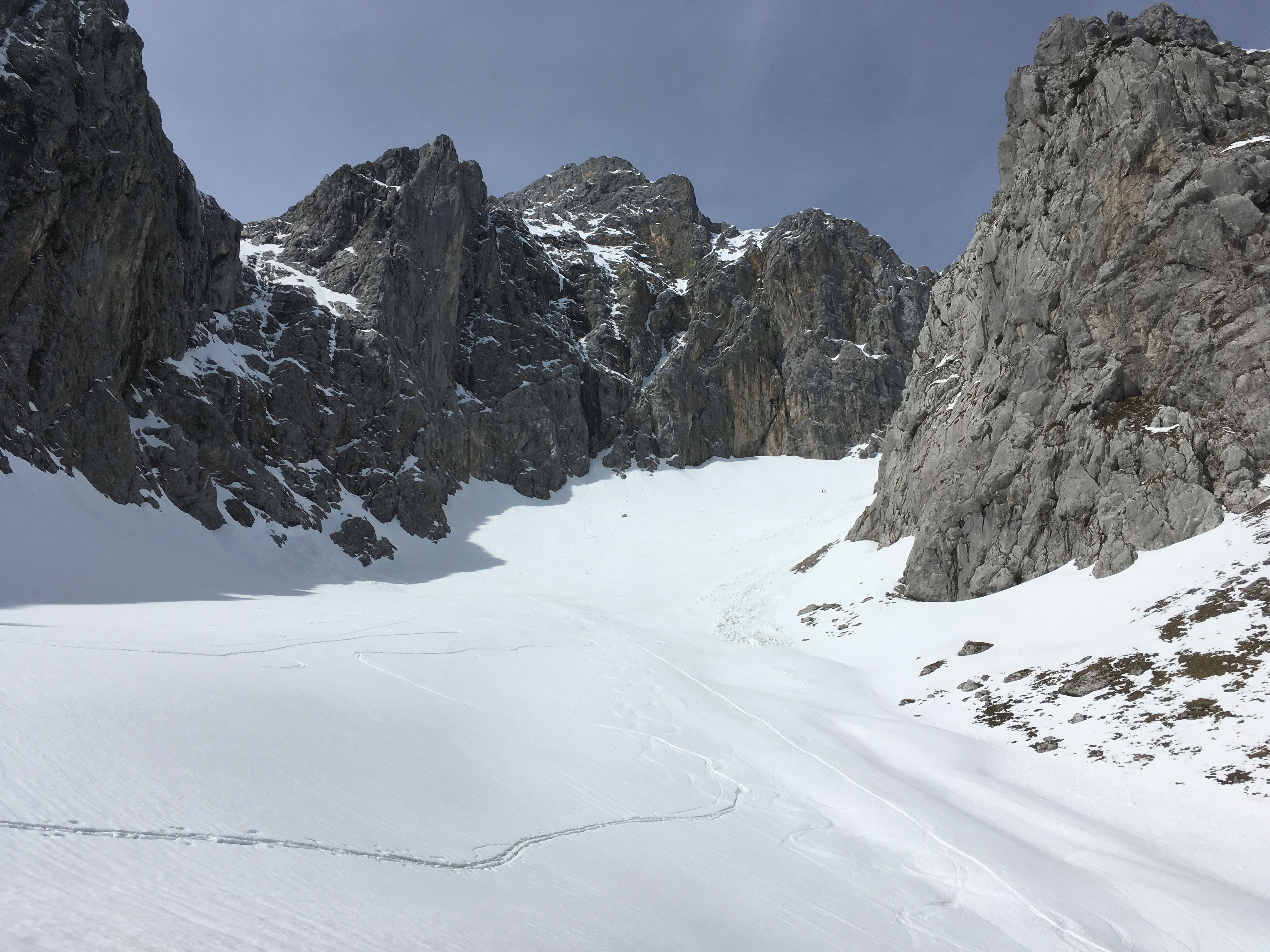 Tourenverhältnisse: um 12 Uhr westseitig Firn, ostseitig und südseitig wäre frühere Abfahrt sinnvoll; in der Westrinne viel Dreckschnee und herabgefallene Steine