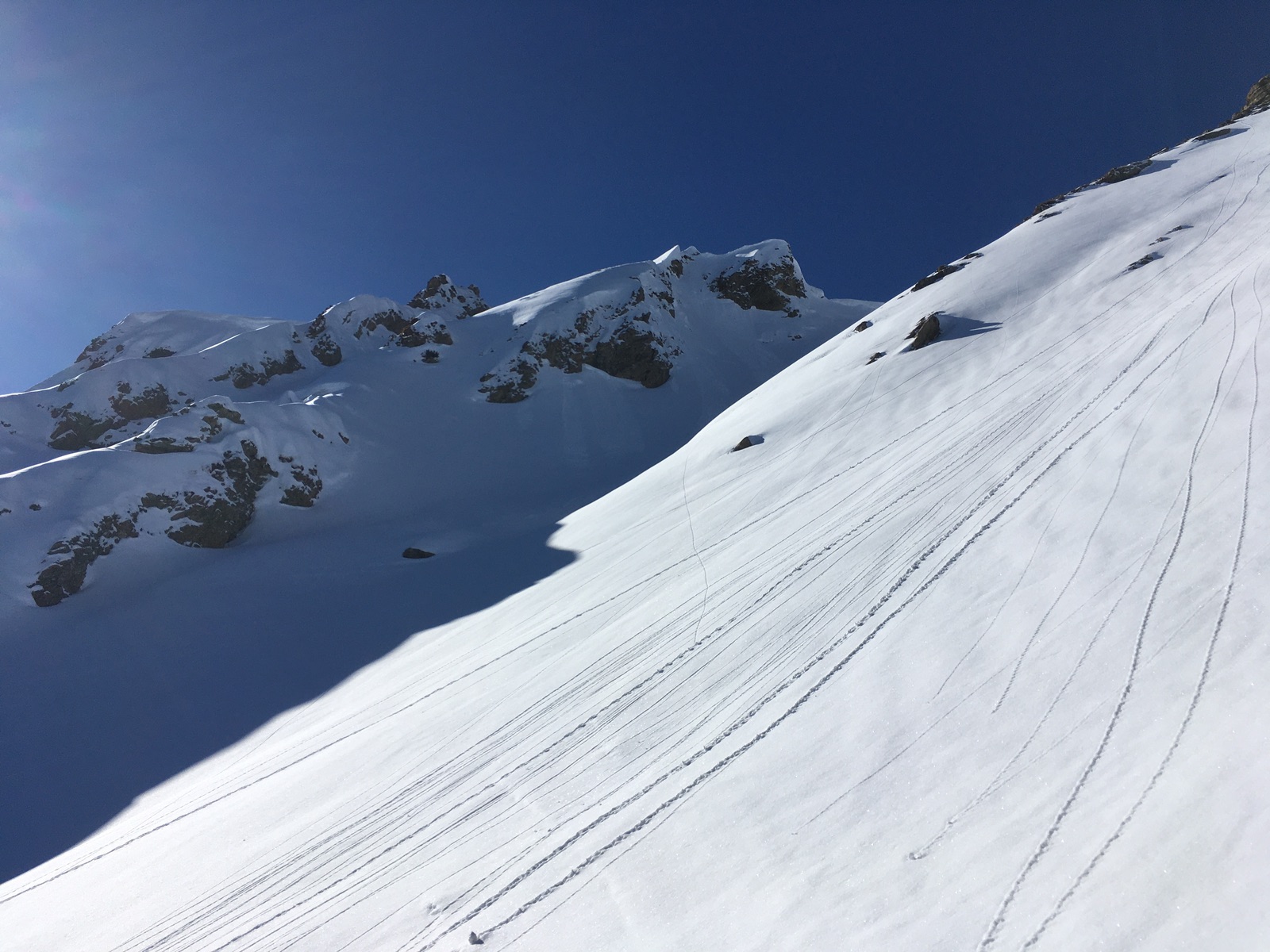 Gestern konnte ich die eigentlich für das vergangene Wochenende geplante Skirunde Tannheim - Vilsalpsee - Geierköpfle - Schochenspitze - Neunerköpfle nachholen. Der Liftbetrieb in Tannheim ist bis auf einen Tallift eingestellt und die Saison gefühlt auch insgesamt vorbei (kaum mehr was los). Dabei liegt auf der Loipe von Tannheim zum Vilsalpsee bis auf wenige apere Stellen noch ausreichend Schnee. Auch vom Vilsalpsee hoch zum Traualpsee geht es mit Skiern durchgehend hoch (für die Abfahrt wäre es vom Gelände her aber nicht skifahrerfreundlich). Gestern alles zu spuren. Am Geierköpfle ist ein Teil des Hangs als Grundlawine abgegangen, deshalb muss man etwas nach links ausweichen. Abfahrt hier schön aufgefirnt.