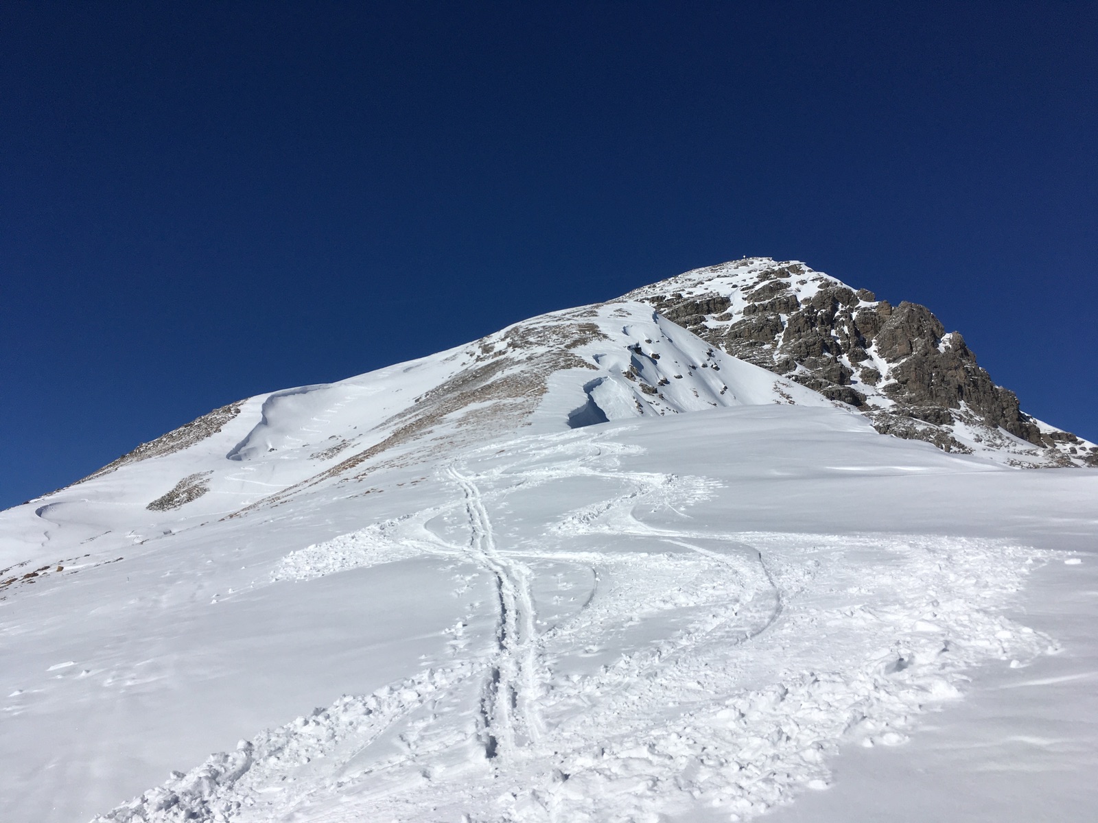 Nach der Zwischenabfahrt bis kurz vor den Traualpsee kommt der (lange) Rückweg: Die kurze Steilstufe unter der Landsberger Hütte war noch nicht eingestapft und ziemlich mühsam, Snowlines waren angenehm (zwei Gedenktafeln mahnen auch zur Vorsicht). Zur Schochenspitze ging es dann gerade so bis knapp unter den Gipfel mit Skiern. Abfahrt über die Gappenfeldscharte und unter der Sulzspitze zur Strindenscharte - auf dem Almweg hier einige ganz kurze apere Stellen. Nach der Strindenscharte empfiehlt es sich nicht, zu versuchen, die Hänge möglichst hoch zu queren - führt nur in steiles Gelände und am Ende muss man doch fast bis zur Oberen Strindenalpe abfahren. Letzter Fellaufstieg dann zum Neunerköpfle und nachmittagliche Abfahrt auf der Talabfahrt des Skigebiets, die sogar in einem Streifen noch einmal präpariert wurde nach Liftschluss (vielen Dank dafür; aber warum wird das Skigebiet bei einer solchen Schneelage vorzeitig geschlossen?).
