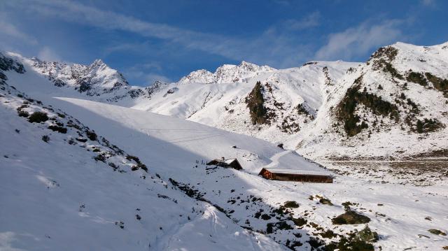 Prognose: die Piste zur Rauththütte hat schon an einigen Stellen recht wenig Schnee, nicht den südlicheren Ziehweg des Aufstiegs abfahren (Steine)