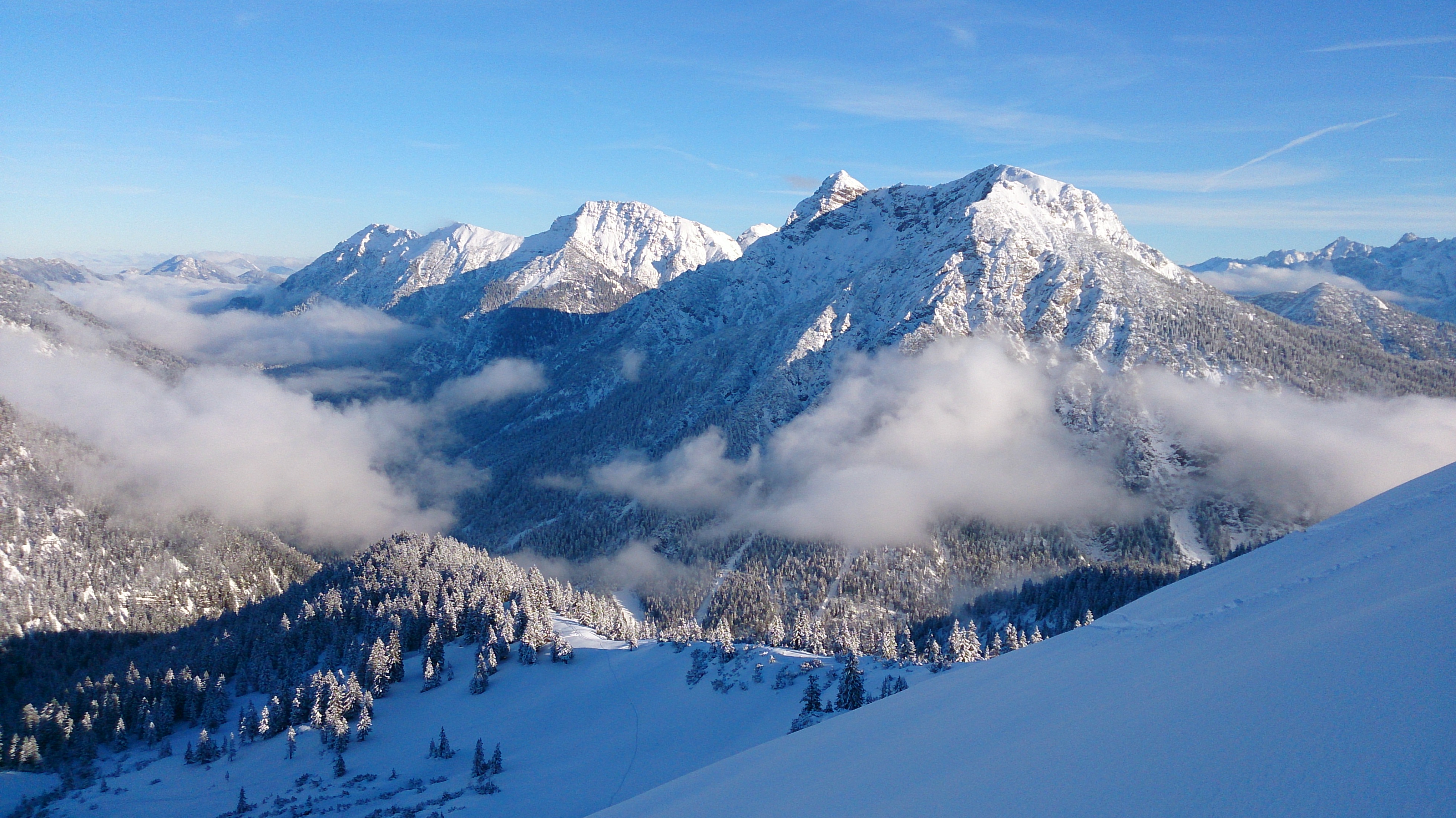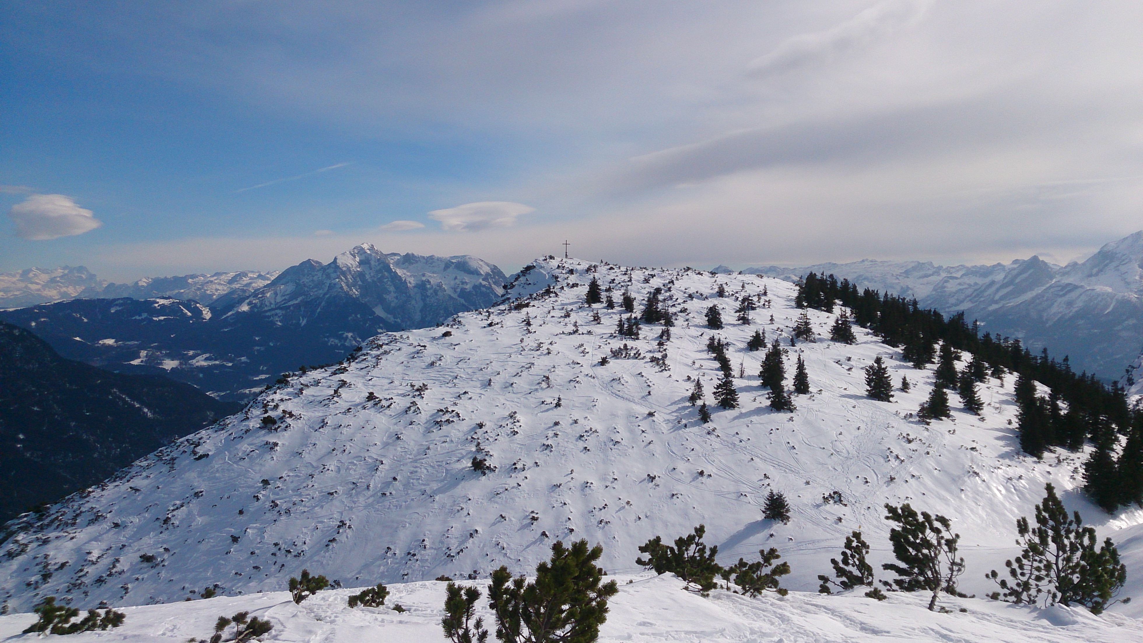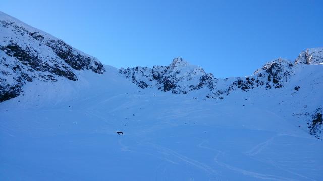 Also weiter hoch, bis auf 1.800 m auf einem Rücken lawinensicher. Danach bis ca. 2.000 m steiler, aber teilweise kupiert und latschenbewachsen, zudem schon recht eingefahren. Anschließend gibt es noch eine Querung und man steht dann auf einem recht markanten Absatz der Ostflanke der Hohen Munde auf gut 2.100 m.