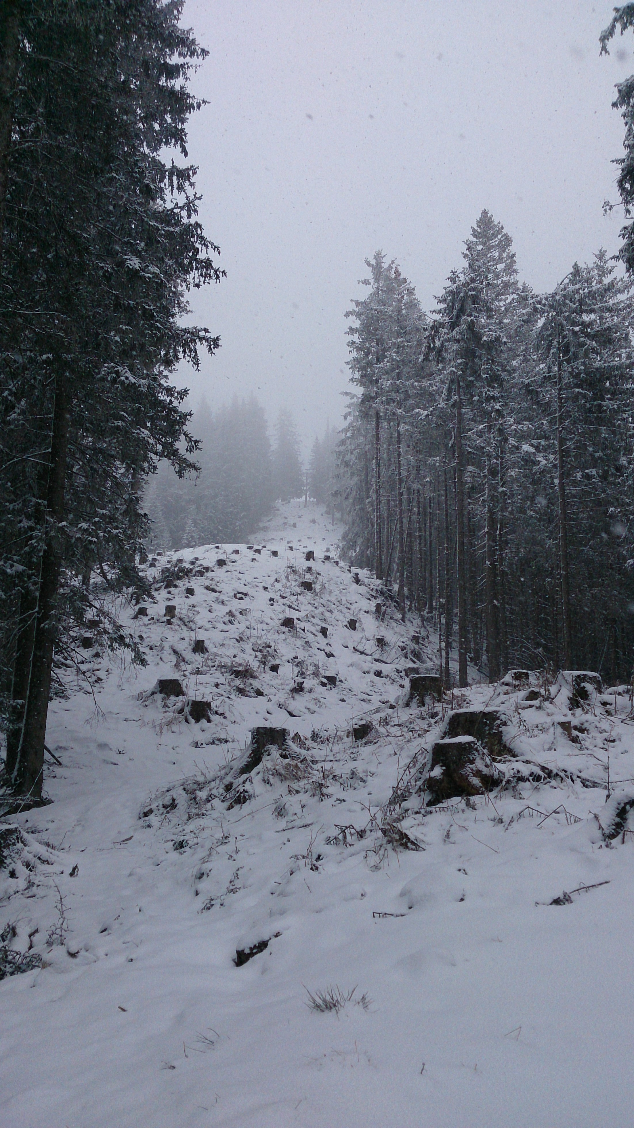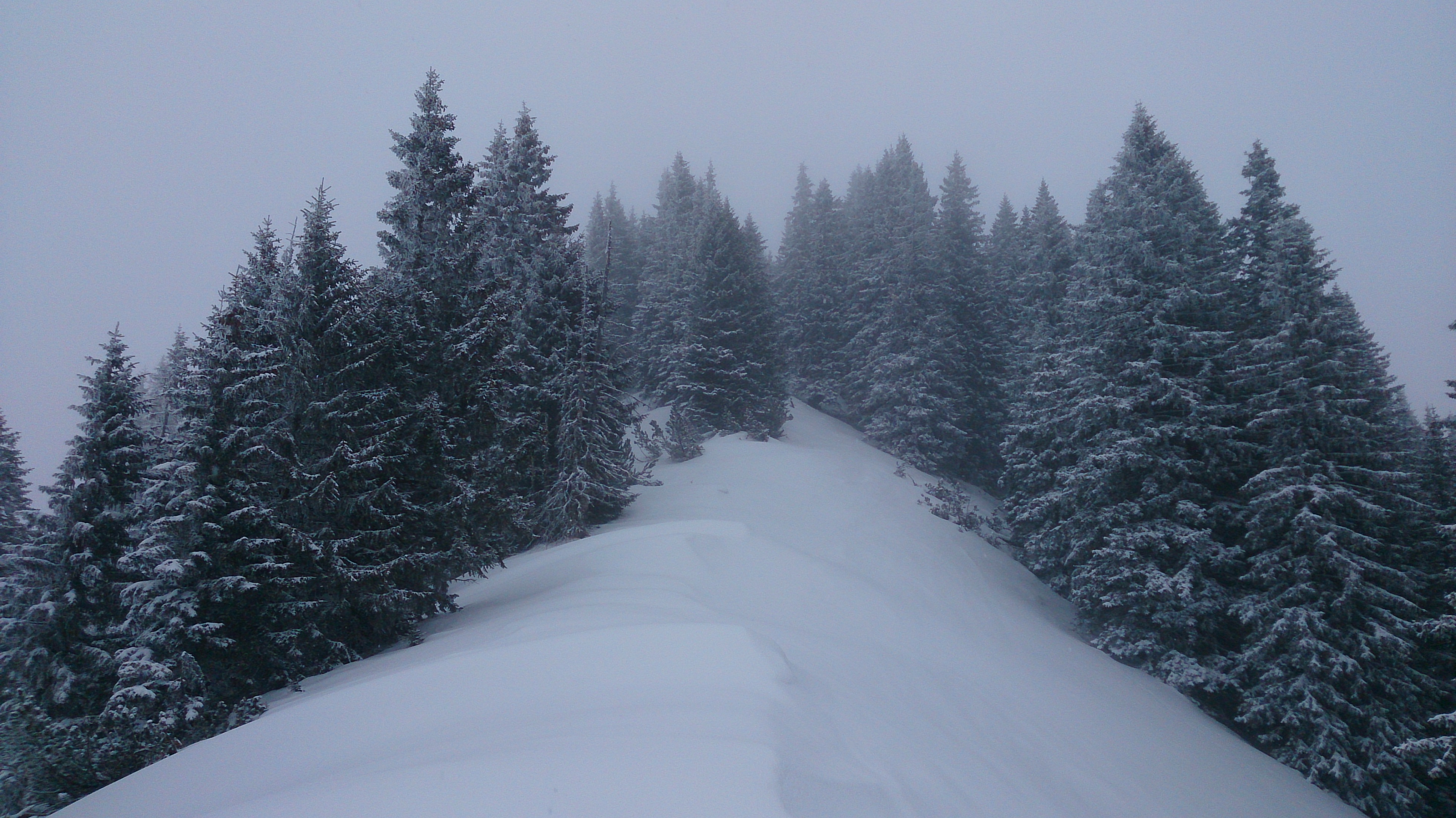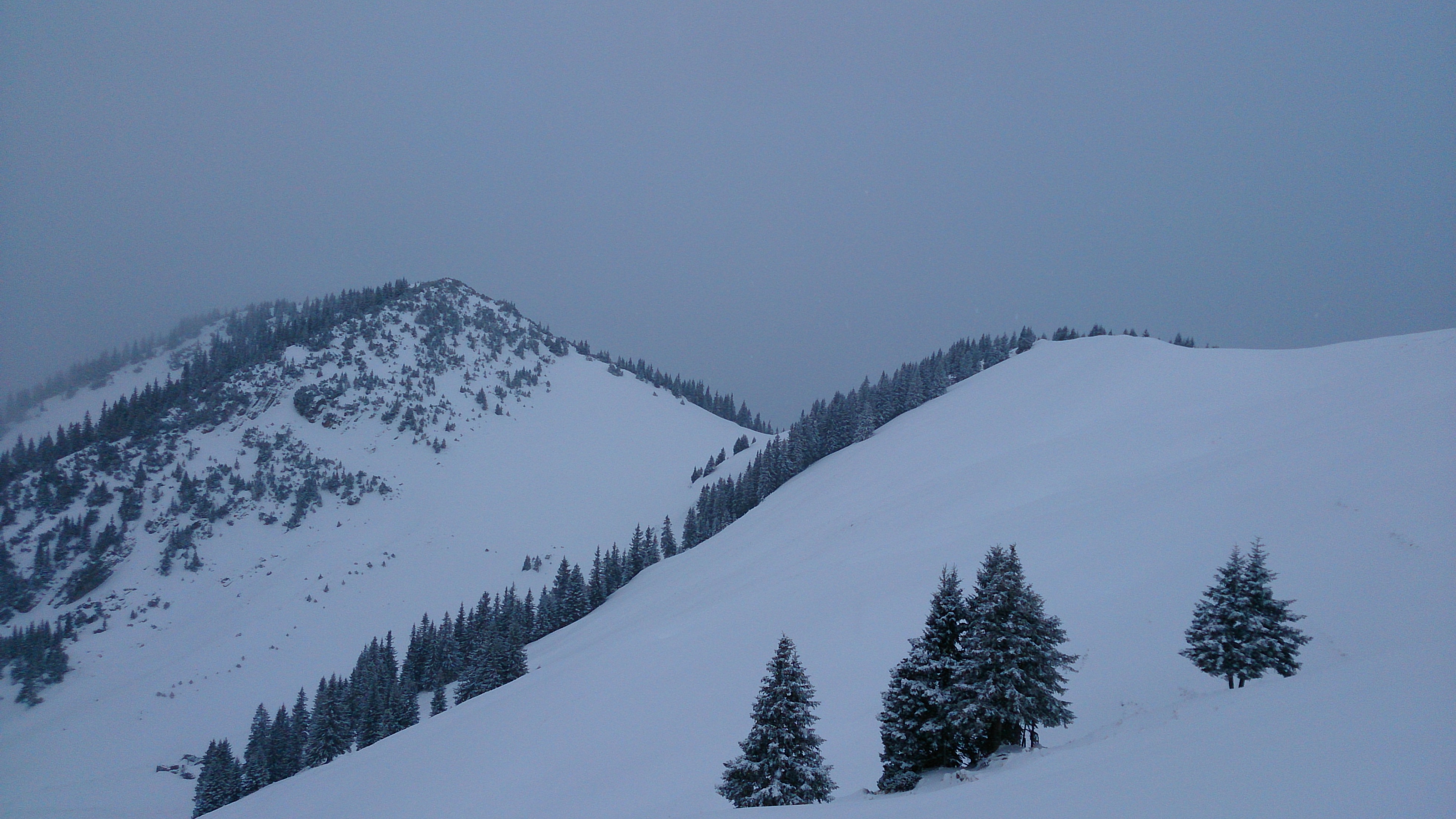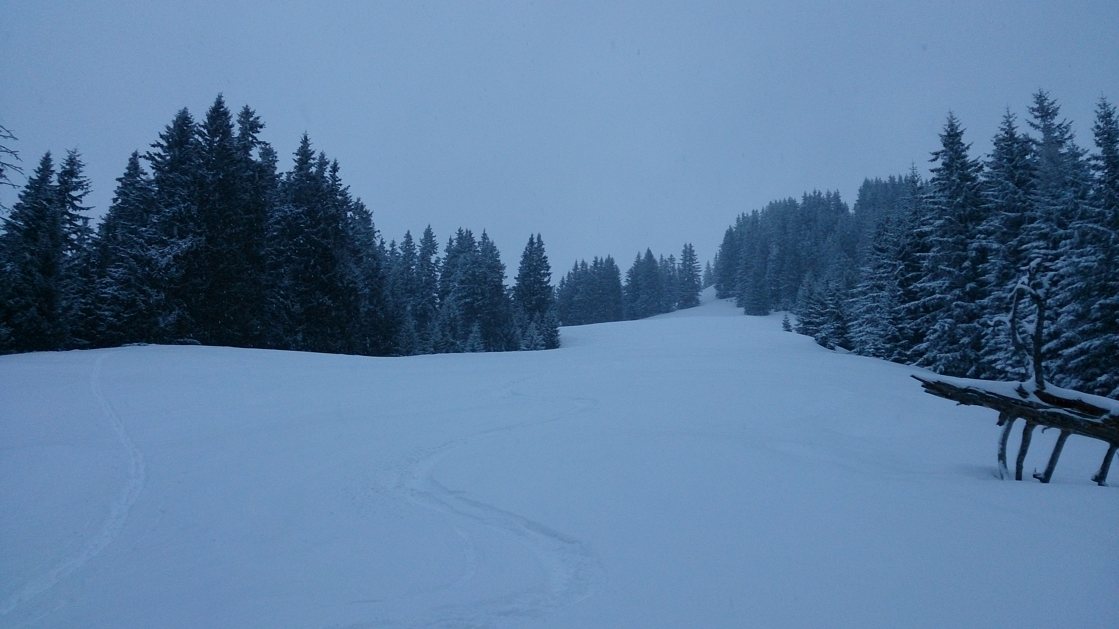 Das Wetter und die Sicht (anfangs noch recht gut) verschlechterten sich dann auch schnell, und so fuhr ich im Pulver (schon etwas schwer, unten zerfahren) zur Hütte und nach Einkehr dann im Regen die Piste hinab.