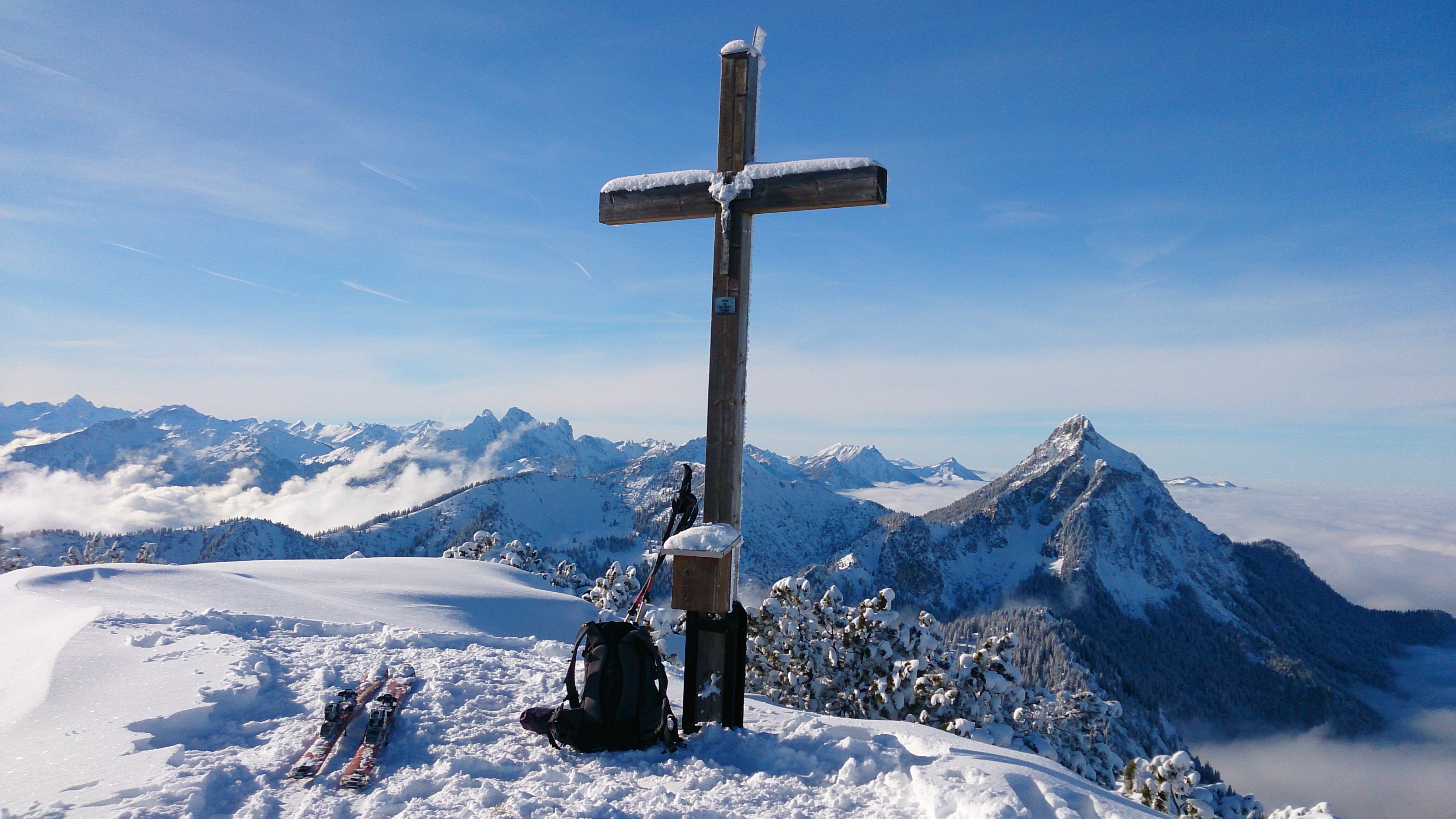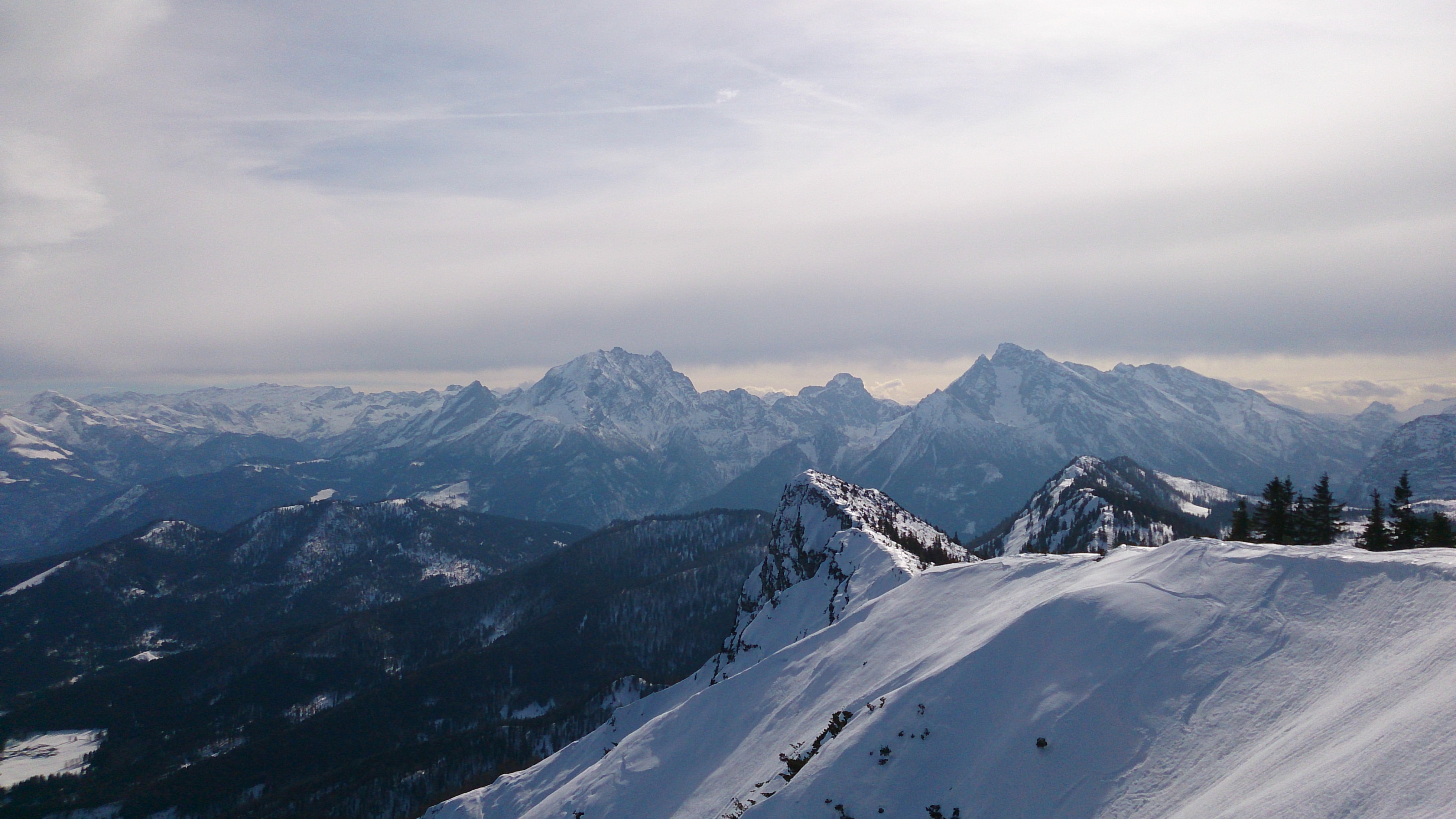 Tourenverhältnisse: unten pistenmäßig eingefahren, oben Pulver; der Regen und Sturm dürfte aber später gekommen sein