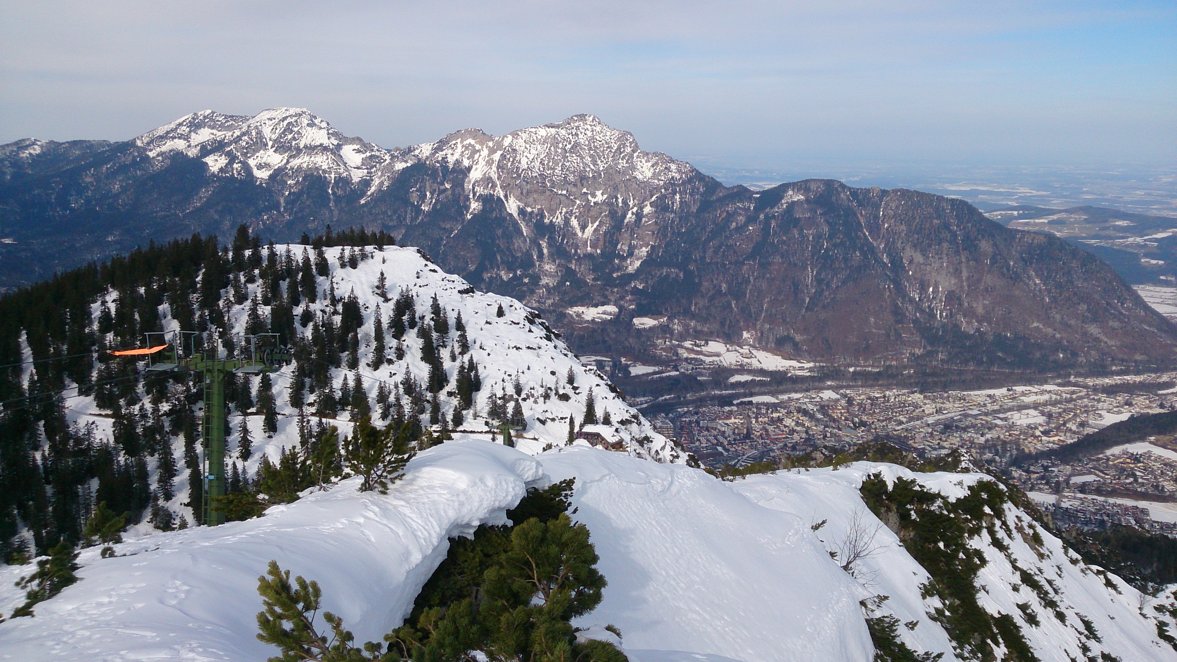 Die eigentlichen Schwierigkeiten bei der Skitour zur Hohen Munde-Ostgipfel dürften hier beginnen - die Skispur zog heute ab hier in die Inntalflanke: Bei hartem Schnee (heute bis zu meiner Höhe nicht der Fall) akute Absturzgefahr ins Inntal (Felsabbruch unter der Spur), ansonsten wird es enorm steil und damit entsprechend lawinengefährdet. Mir war das heute viel zu gefährlich wegen Lawinen und so kehrte ich wie geplant um. Es sind aber auch welche hoch - angesichts des Absturzgeländes dürften aber schon kleinere Lawinen sehr gefährlich sein (Mitreißgefahr). Locken würden die restlichen 450 Hm zum Gipfel natürlich schon. Alternativ geht es evtl. auch nochmals steiler direkt die Ostflanke hoch (geschätzt 45 Grad).
