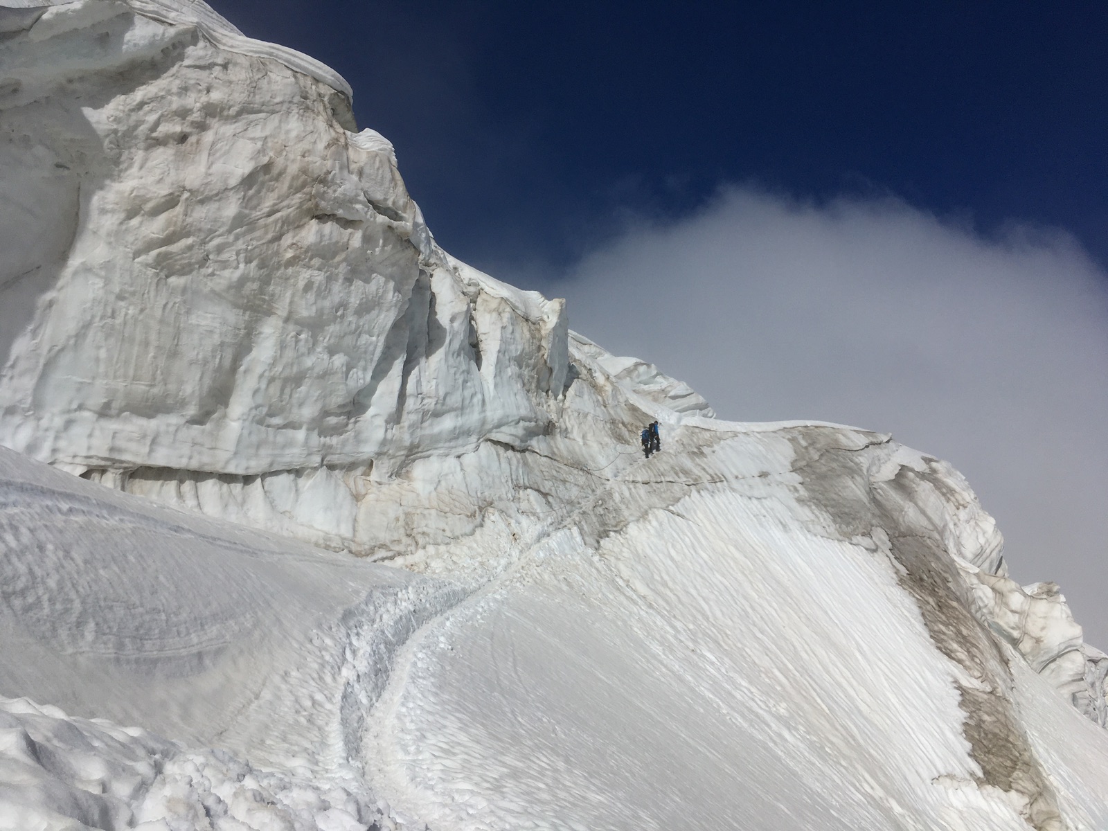 Ohne genügende Recherche im Vorfeld - die Tour war ja so nicht geplant - versuchte ich mich dann am 1. Watzmannkind über die Watzmannscharte. Der Einstieg bei der Felswand unter der Watzmannscharte ist noch gut zu finden, aber dort könnte man sich entweder rechts halten, wobei der Weiterweg nicht klar war, oder nach links kraxeln. Da dort zahlreiche Bohrhaken hingen, ging ich davon aus, dass sei die richtige Route. Es handelt sich aber um ca. 50 Hm zwar nicht schwierige Kraxelei (I-II, T6), aber der Fels ist nicht immer fest, es ist ausgesetzt und auf dem anschließenden sehr ausgesetzten Querungsband liegt auch noch etwas Schotter. Ziemlich unangenehm die Passage. Mit Seilsicherung wäre es wohl keine große Sache, so war es aber herauf und vor allem herunter gerade auch psychisch fordernd. Eine provisorische Selbstsicherung an einer langen Reepschnur half da wenigstens etwas.