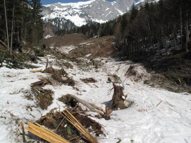 Tourenverhältnisse: Noch immer viel Schnee und bestimmt gute Verhältnisse, wenn man rechtzeitig unterwegs ist - am besten 6h. Der Schnee reicht fast bis zum Parkplatz. Die ersten 200Hm geht es durch den Lawinenkegel unter dem auch die untere Wegscheidalm begraben ist. Man kann ihn aber fahren.