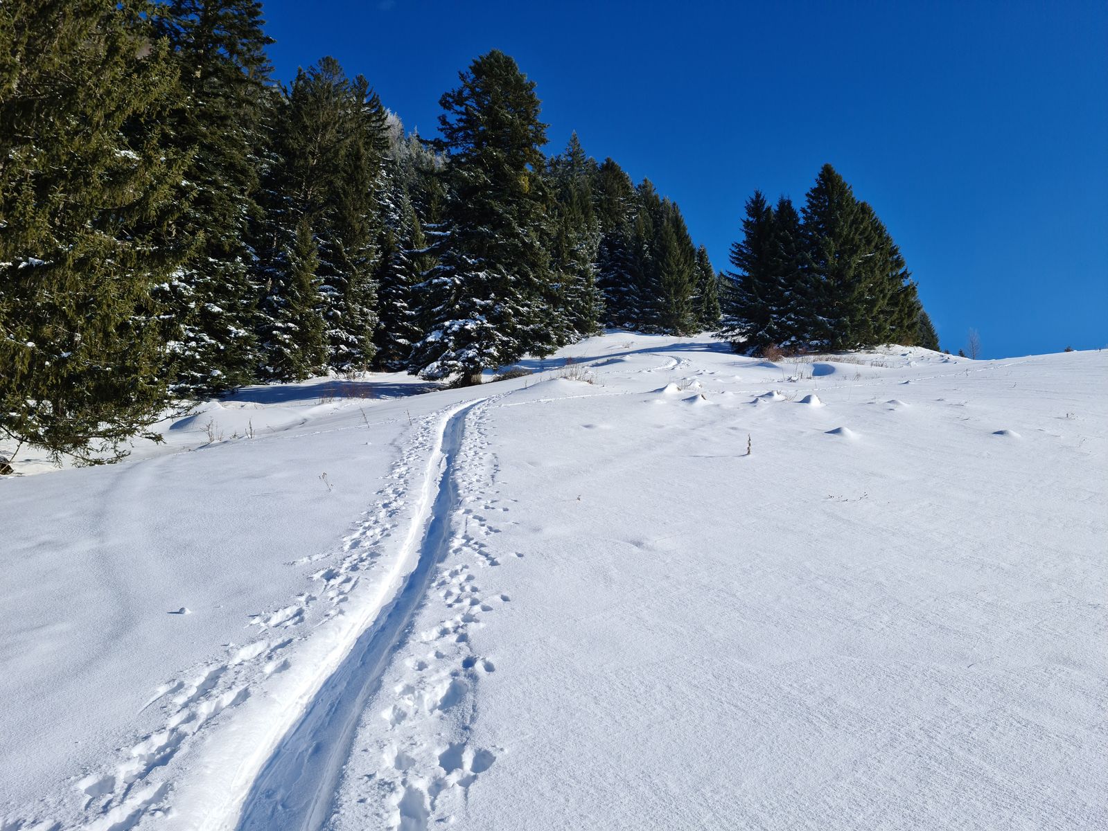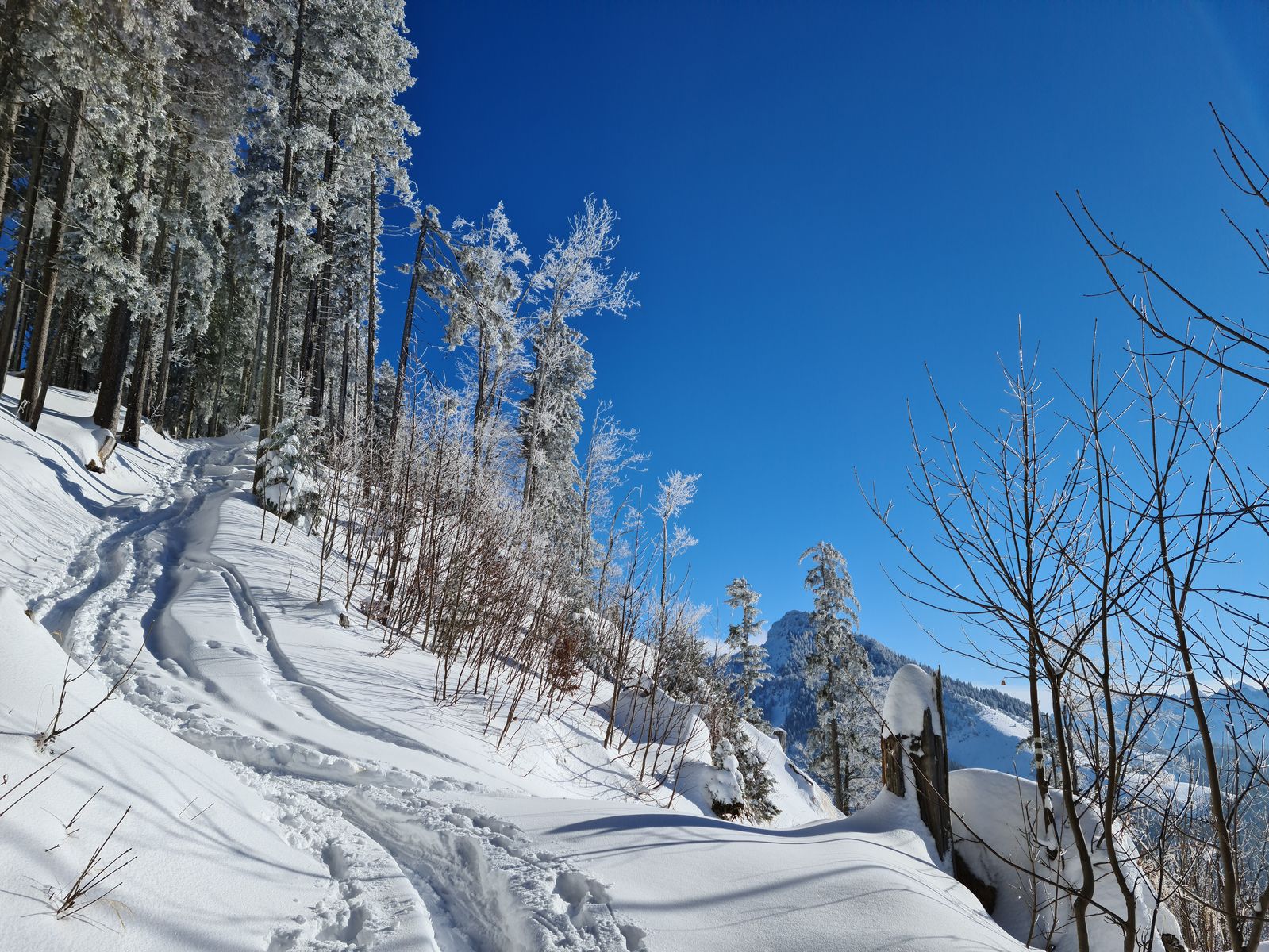 Verhältnisse: Der Forstweg ist durchgehend in einem sehr guten Zustand, unten ist er sogar präpariert für die Rodler. Die Waldschneise entlang des Rückens hat ausreichend Schnee, so dass man gut rauf und einigermaßen runterkommt. An einigen Stellen war allerdings schon sehr vorsichtiges Seitwärts-Abrutschen angesagt. Vereist waren die Steilstellen noch nicht, höchstens mal bisserl harschig.