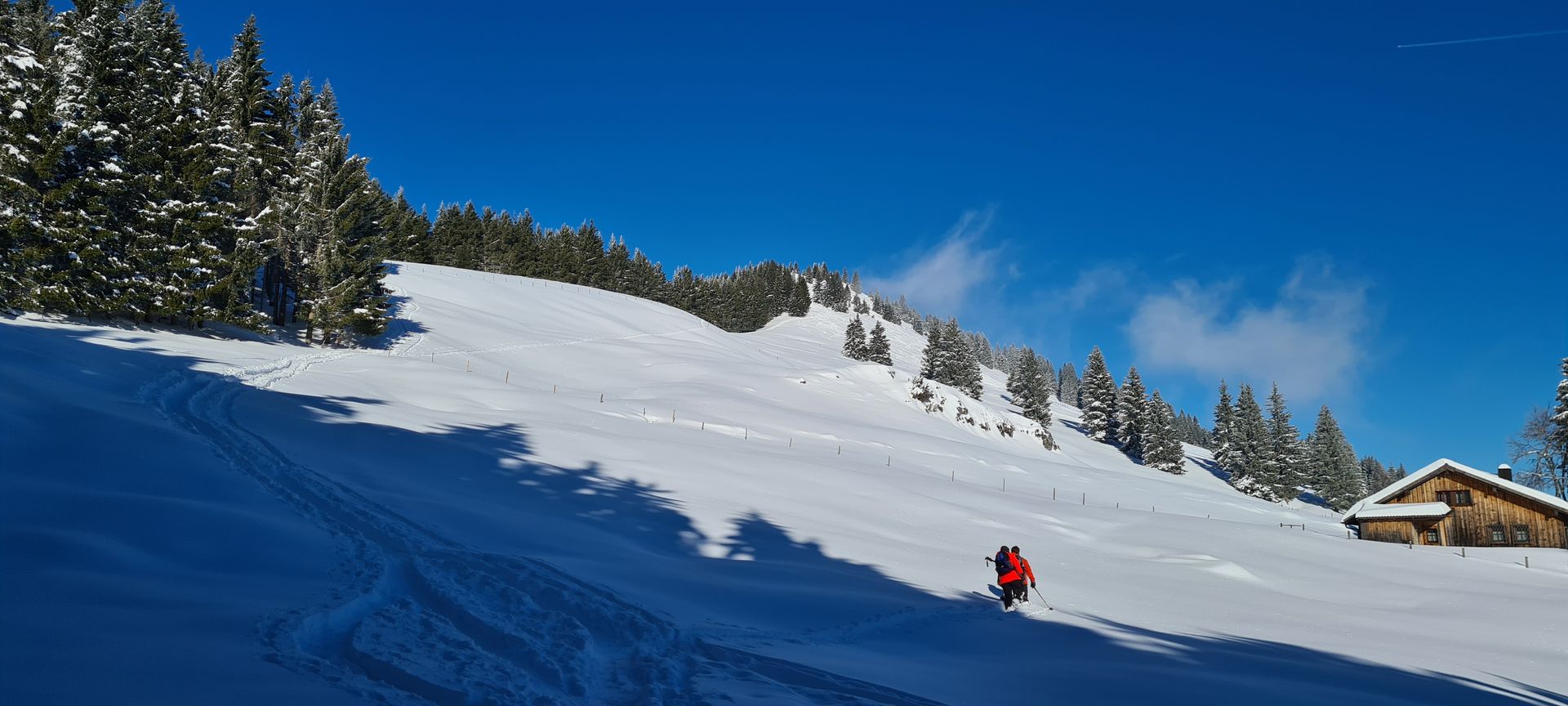 Kalt war es heute Morgen, -15 Grad bei der Anfahrt durch das Risstal, am Ausgangspunkt dann -11 Grad. Die Entscheidung für die Sonnenseite war daher gleich getroffen, auch wenn uns klar war, dass wir das evtl. mit schlechtem Schnee bezahlen werden.