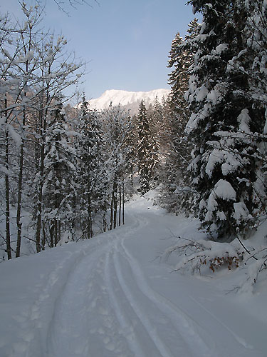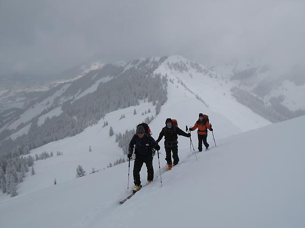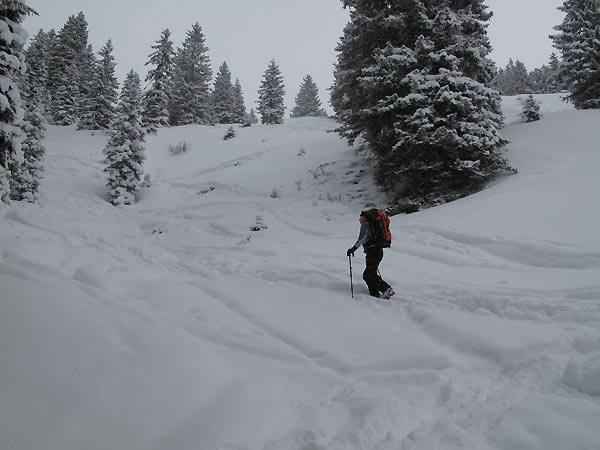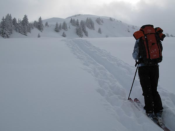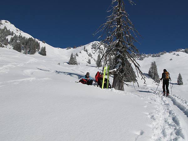Tourenverhältnisse: Gut einen halben Meter Neuschnee hat es gemacht. Allein von gestern auf heute fielen am Spitzingsee (1100 m) 40 cm. Beim Anstieg zum Lempersberg durch die schönen breiten und eher flachen Waldschneisen war von starker Windeinwirkung/Verfrachtung nichts zu spüren. Allerdings war der Neuschnee noch nicht gut mit der Harschschicht der Altschneedecke verbunden. An einigen Stellen war es fast zu viel vom herrlichen Pulver um im flachen Gelände schwingen zu können.