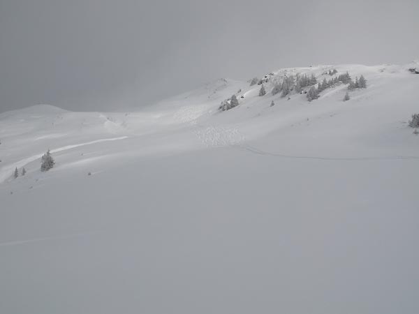 Gefahreneinschätzung: Gelände nur unwesentlich über 30 Grad, zudem sorgte die Harschschicht für eine Stabilität, die ein einzelner Skifahrer bei dieser Steilheit kaum so stören kann, dass es zur Auslösung kommt.