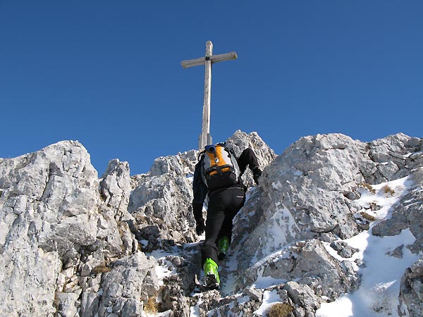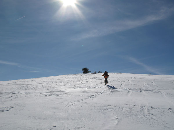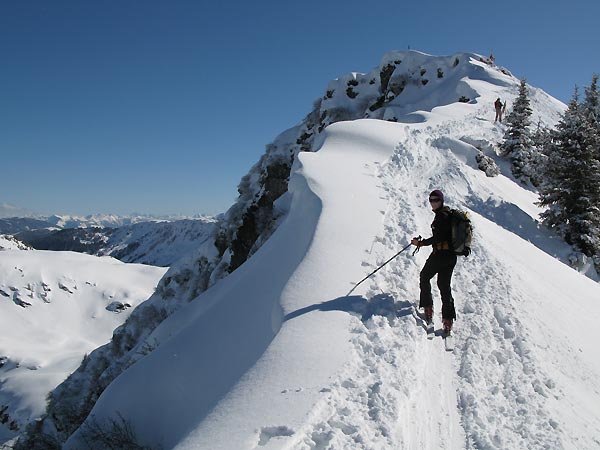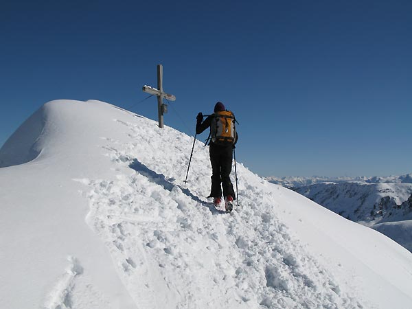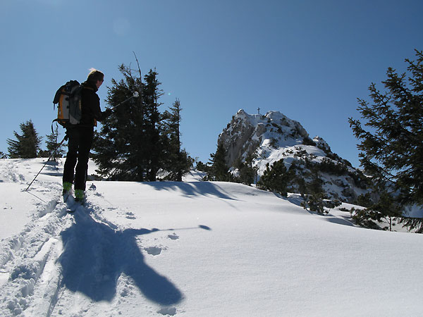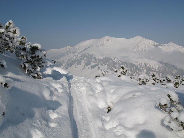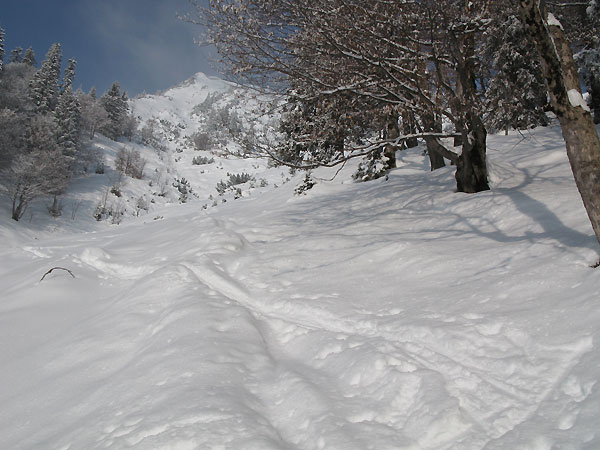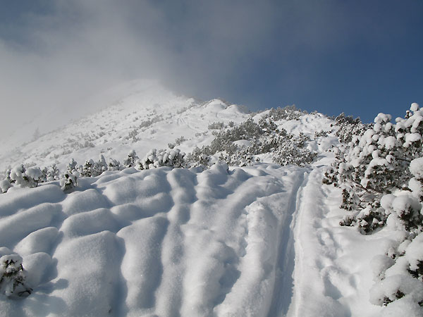 Tourenverhältnisse: Ausreichend Schnee, wobei der Latschen bestandene Gipfelgrat auch noch mehr vertragen könnte. Schnee: ca. 10 bis 20 cm Pulver und Rauhreif auf im Aufstieg meist tragender Harschschicht. In der Abfahrt hat die Harschschicht nicht immer gehalten. Daher bin ich stellenweise in abgeschattete Bereiche ausgewichen - hier herrlicher Pulver! Unten im Waldbereich bei den Abkürzungen erstaunlich gut, da durchwegs tragend.