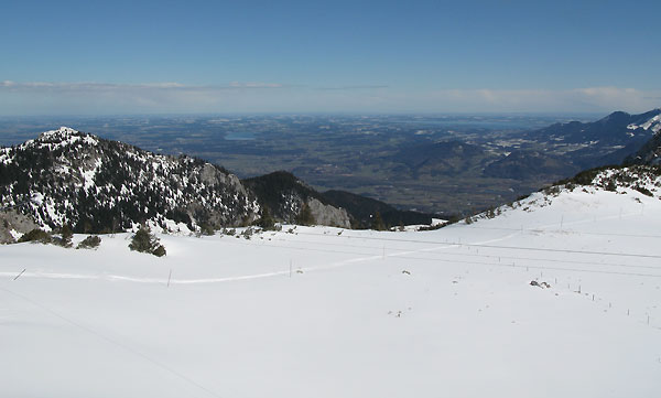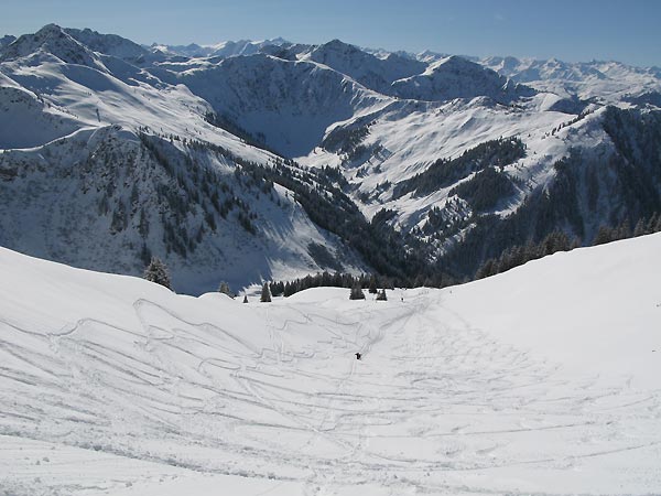 Tourenverhältnisse: Für die kleine Skiwanderung vom Blomberg (Bergstation) zum Zwieselberg hat es ausreichend Schnee. Pulver auf gutem Untergrund. Für die "Normalroute" von der Waldherralm herauf dürfte es nach meiner Einschätzung im Waldbereich immer noch etwas wenig Schnee haben, aber das ist nur eine Ferndiagnose.
