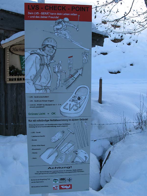 Am Beginn der Route in den Auracher Graben gibt es jetzt eine Hinweistafel mit automatischem LVS-Geräte-Check. Man muss ca. 1 m an die Tafel herantreten, dann zeigt ein grünes Licht die ordnungsgemäße Funktion des LVS-G an. Siehe Bilder. Was es nicht alles gibt...