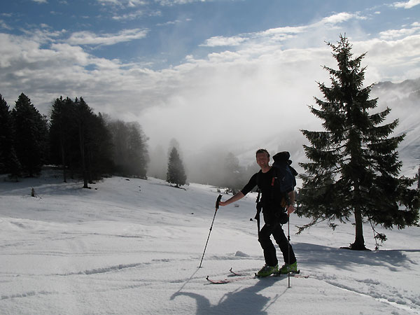 Tourenverhältnisse: Fast hätte ich wieder den Rückwärtsgang eingelegt, denn bei der Anfahrt hat es leicht geregnet. Dann hat es aber in einer atemberaubenden Geschwindigkeit aufgemacht und es gab strahlenden Sonnenschein. 2 bis 5 cm Neuschnee - Pulver auf einer überwiegend tragenden Decke.