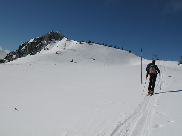Gegen Mittag starke Windfahnen um die Gipfel und Grate (Föhn!).Gefahreneinschätzung: Auf der sonnseitigen Exposition erschienen mir die Verhältnisse sehr sicher, da wie gesagt ein tragender Harschdeckel (nicht mal mit dem Stock zu durchstoßen) vorhanden war und die geringe Neuschneeauflage ohne nennenswerten Wind gefallen sein muss.
