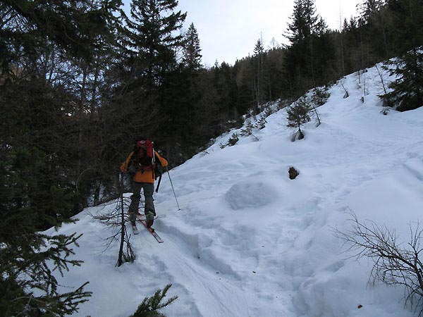 Hahnenkampl: Der Direktaufstieg von der Bochumerhütte durch den Wald ist möglich, zum Abfahren hat es hier aber zu wenig Schnee. Wir sind daher am Grat Richtung Rauber und dann über die Waldschneisen ganz gut zur Hütte wieder hinuntergekommen.