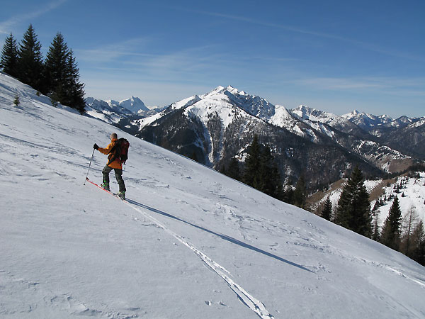 Tourenverhältnisse: Es hat bis weit hinauf geregnet (bis ca. 1500 m), zum Ende des Niederschlags muss der Regen dann ab 1200/1300 m ganz kurzzeitig in Schnee übergegangen sein. Hier 1 bis 2 cm Neuschnee, der oben verblasen war. Die Straße zur Trockenbachalm war komplett vereist mit einigen Steinen im untersten Bereich. Ab der Trockenbachalm dann bock-harter Harsch mit erwähnter minimaler Neuschneeauflage. Dennoch relativ griffig zu gehen, wir haben keine Harscheisen gebraucht. Die schattseitigen Expositionen gingen auch bis Mittag (ca. 13 Uhr) nicht auf. Weich war nur der Gipfelhang zum Trainsjoch, oder die zusätzliche Abfahrt zur Trainsalm (ostseitig). Skifahrerisch also heute kein Hochgenuss, jedoch traumhaftes Wetter mit fantastischer Fernsicht!