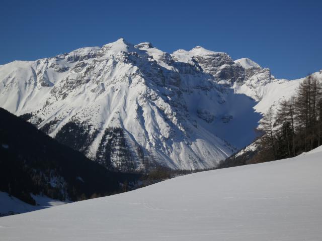 Abfahrt im leicht sulzigen Schnee; sehr gut zu fahren. Im Wald besser auf der Forststraße bleiben (unterste Hänge beginnen auszuapern). Brugger Schupfe jetzt im Winter geschlossen.