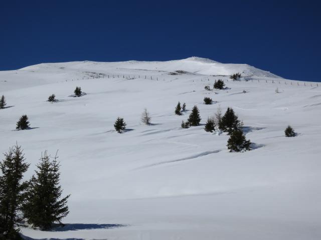 Wiederum Abfahrt im leicht sulzigen Schnee. Auch der relativ steile Gipfelhang war lawinensicher, da bereits oft befahren. Rodelbahn ab Moarhofalm (geöffnet; Mo Ruhetag) in gutem Zustand.
