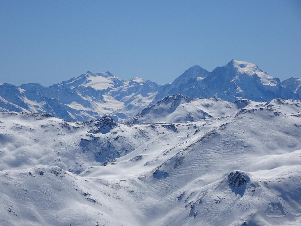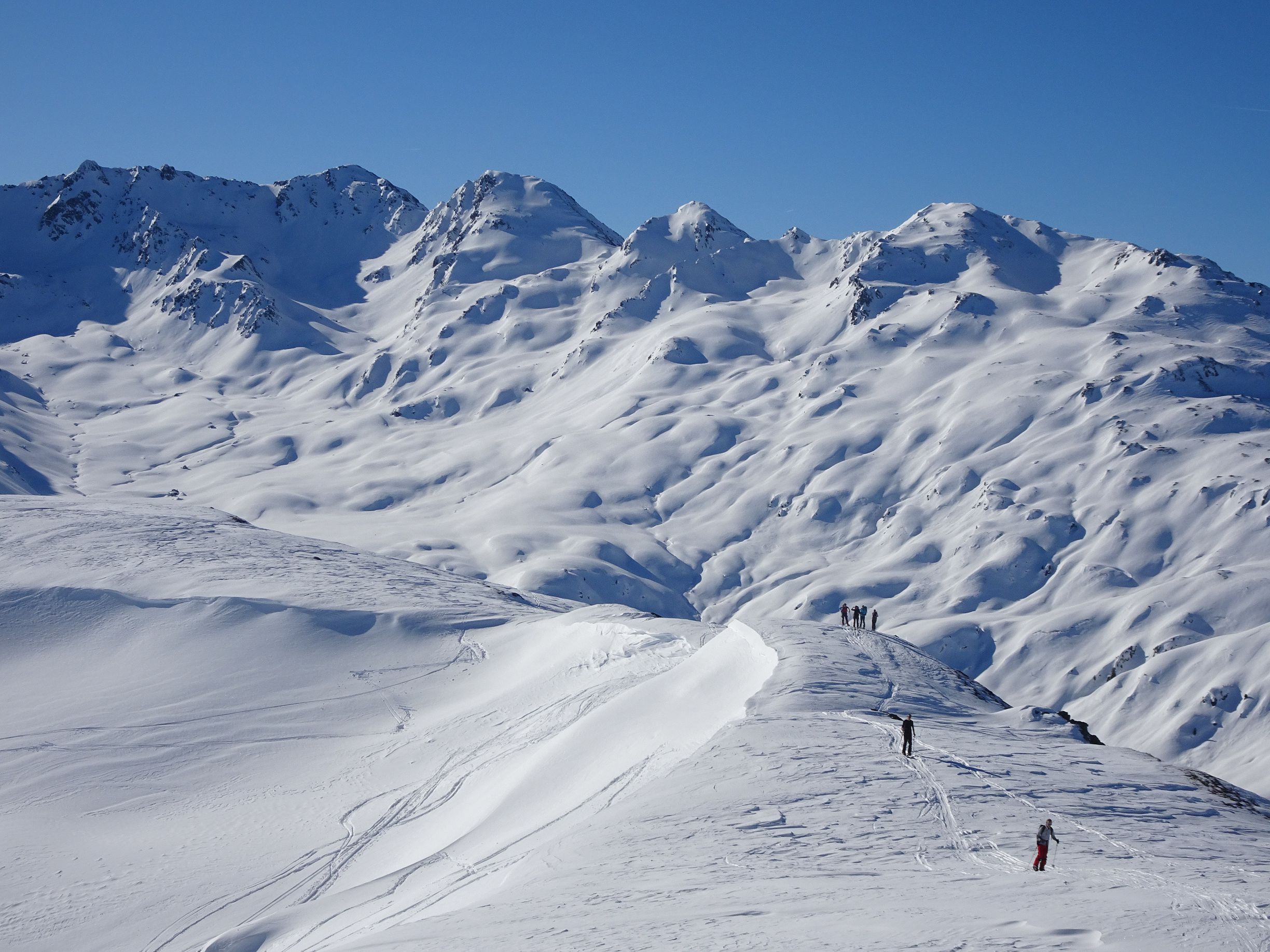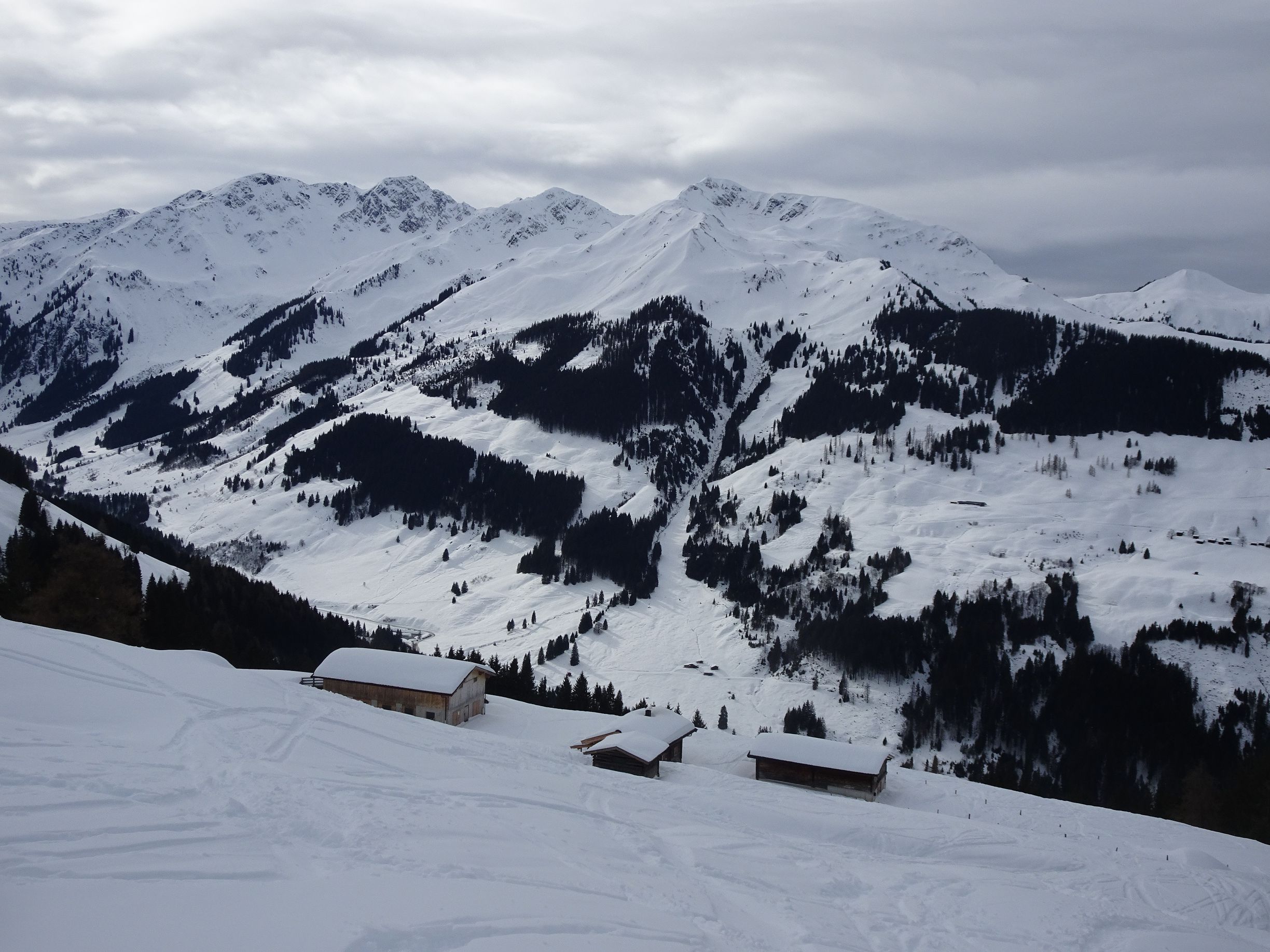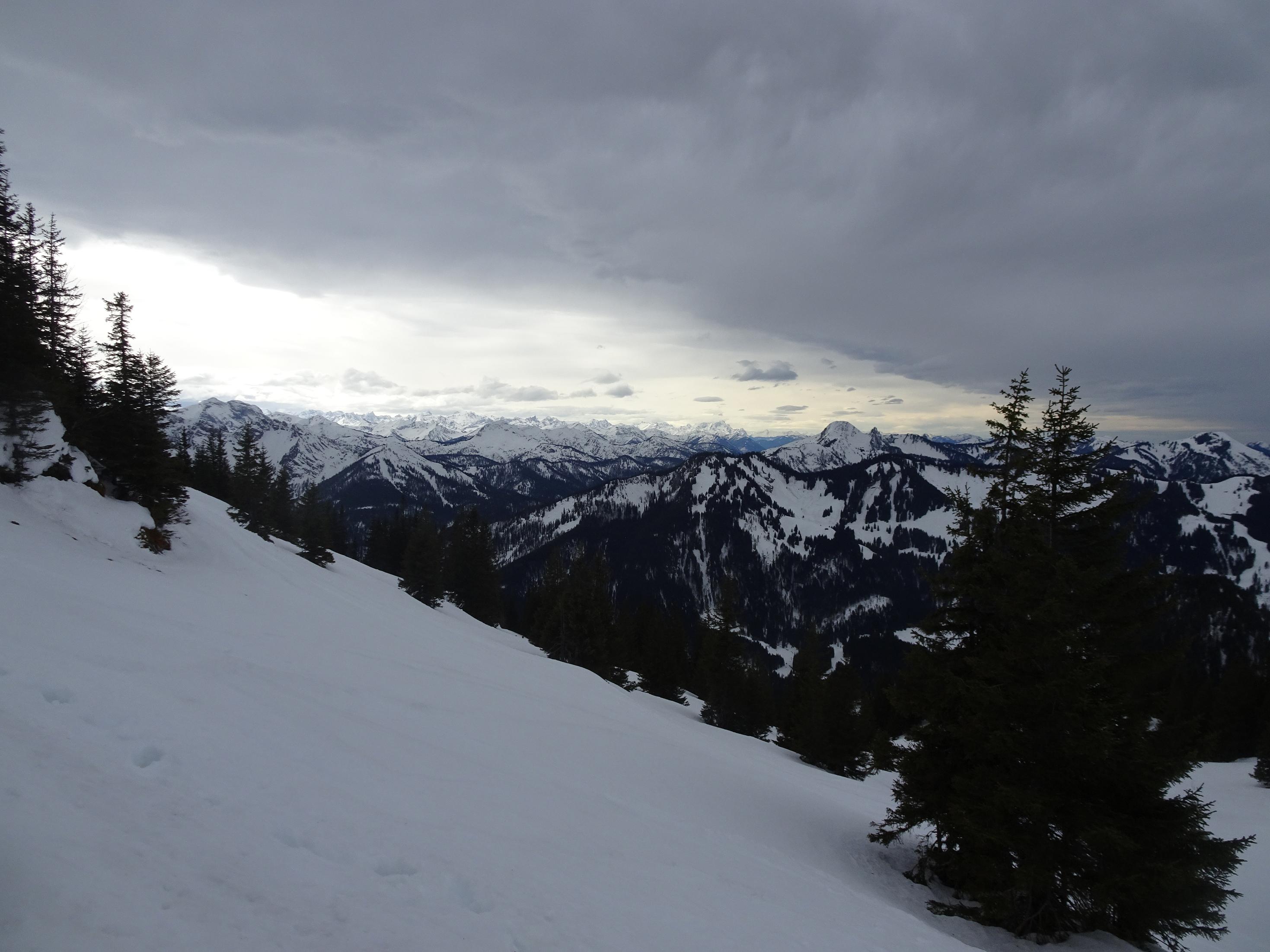 Der Blick vom Rosskopf aus hinüber ins Taubensteingebiet zeigte, dass man ab Talstation Taubensteinbahn etwa 20 Minuten die Ski tragen muss, ehe man auf eine geschlossene Schneedecke trifft.