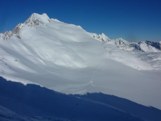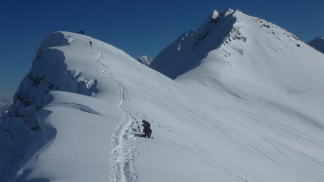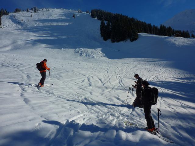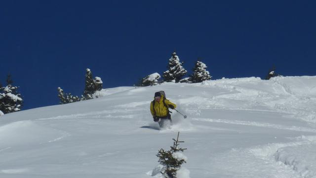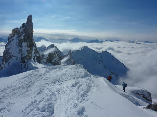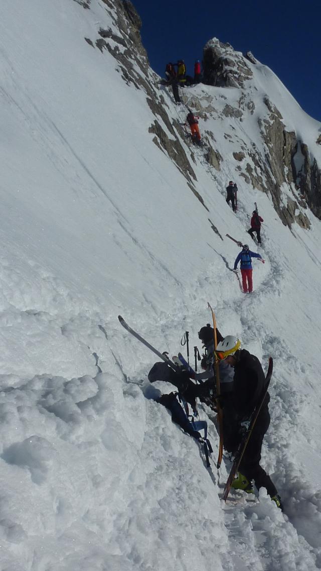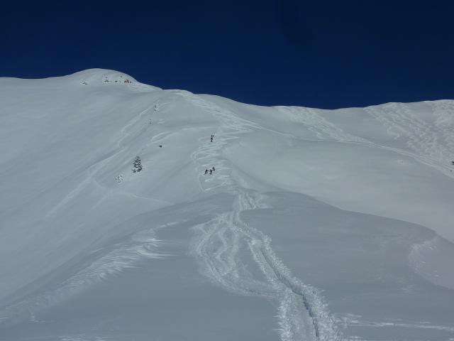 Tourenverhältnisse: sehr gute Verhältnisse, wie im anderen Bericht auch: Steigeisen für die Tunnel im Sulzltal sehr hilfreich. Der 800-m-Hang nach der Simmshütte ein Traum und tolle Spuranlage. Keine Harscheisen nötig. Im Gipfelaufbau bei harten Verhältnissen in der Früh, Steigeisen und Pickel sinnvoll. Die Felsen sind schneefrei und fast schon sommerliche Verhältnisse. Ab Skidepot unterhalb Fallenbacher Joch zu Fuß.