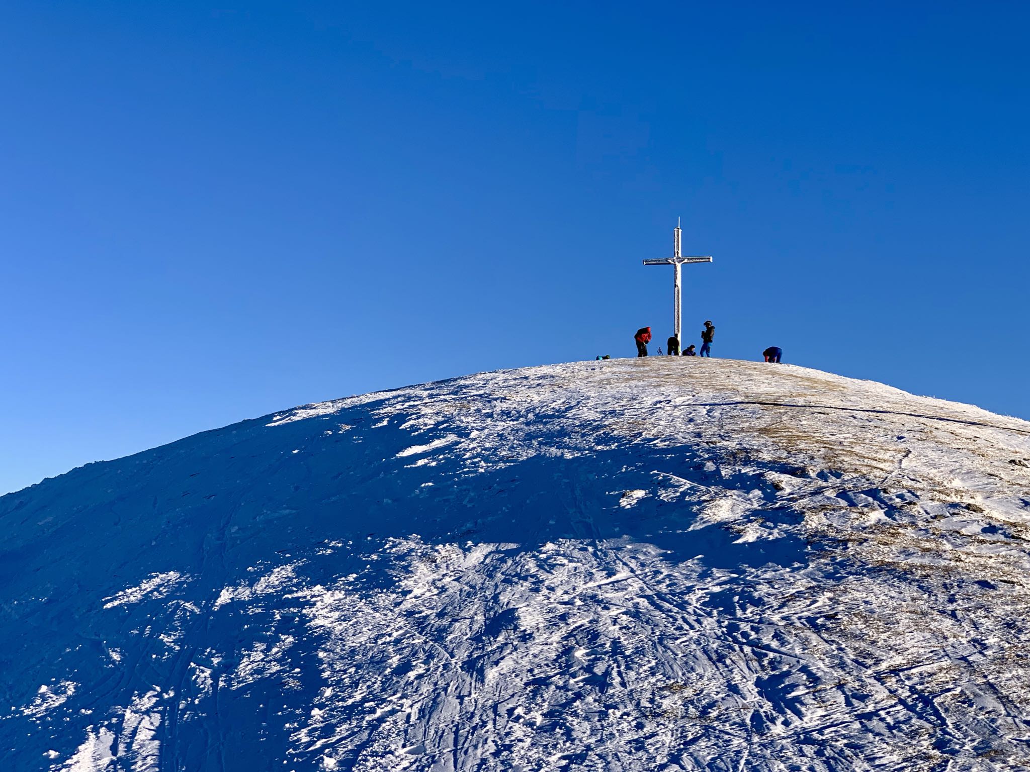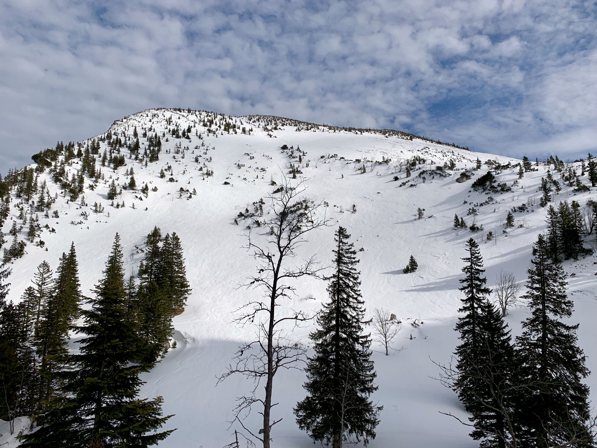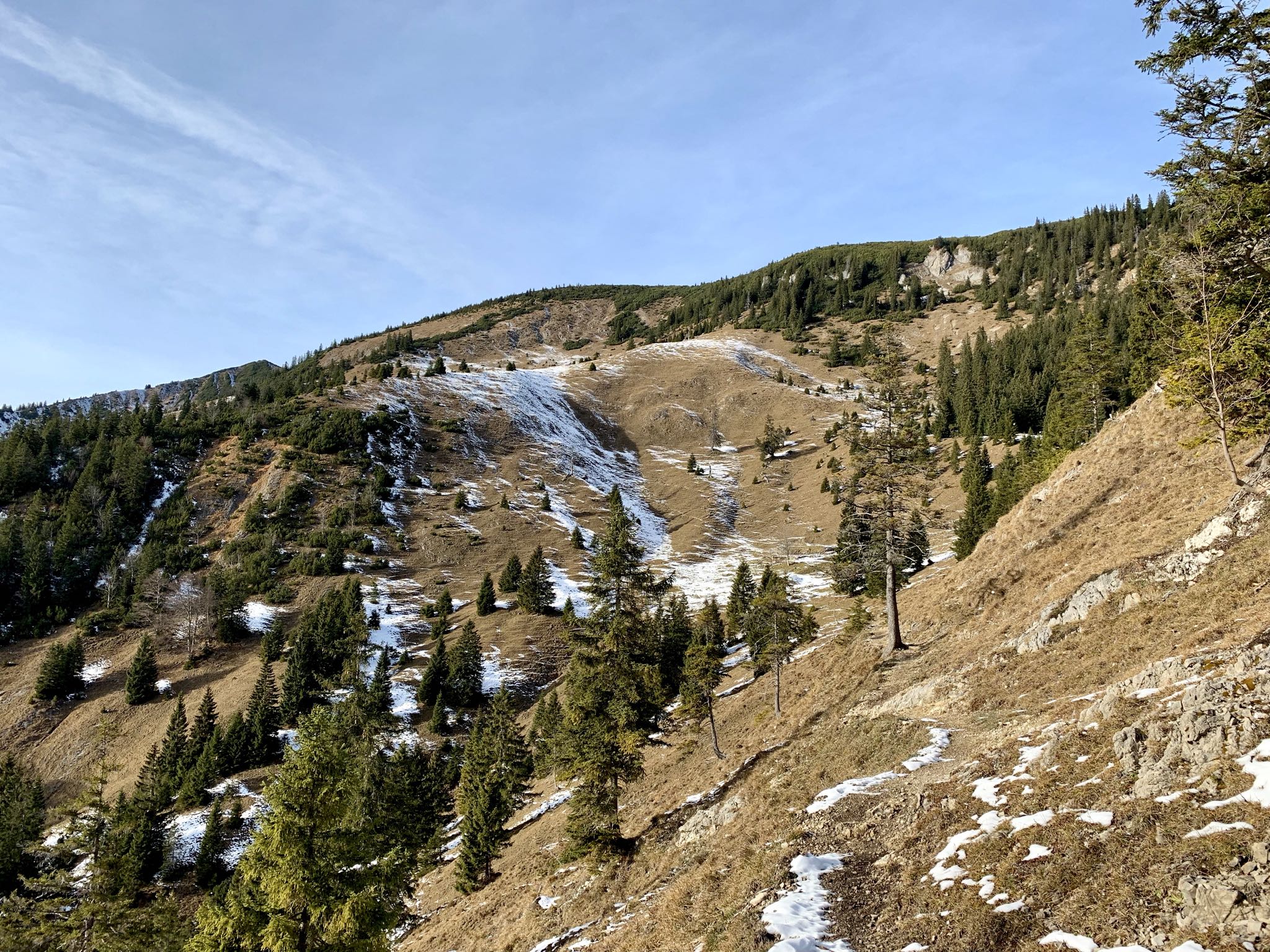 Sonstiges: Vom WP Hohenburg (725m) auf dem Sträßchen an Lasseln vorbei dem Wegweiser „Mariaeck“ folgend Richtung SO auf die Alpelwand zu. Südlich davon in einigen Kehren grob dem Alpelgraben Richtung O folgend zum aussichtsreich gelegenen Alpel (1206m) hinauf. Von dort Richtung SO zum Mariaeck, der Einsattelung zwischen Seekarkreuz im Norden und Schönberg im Süden. Westlich unterhalb davon Richtung SSW steil und teils eng zwischen einigen Felsen hindurch auf den kreuzlosen Schönberg (1621m) hinauf. Zurück wieder Richtung Mariaeck hinunter und, wo die Aufstiegsspur von NW heraufzieht, geradeaus Richtung NO auf das Mariaeck (1469m) und weiter auf der Zimmerleite Richtung NO zur Rauhalm (1400m) hinab. Die Richtung beibehaltend Richtung Brandkopf hinauf und unterhalb davon in weitem Linksbogen auf den NO-Rücken des Seekarkreuz und hinauf zum großen Gipfelkreuz (1601m). Runter Richtung N in den lichten Wald hinein und rechts haltend in den großen 35° Hang. An der Seekarstrasse (Forstweg) über den Sulzbach hinweg etwas nach NO und dann westlich des Stickelbergs durch die Lichtung Richtung WNW, nach einer weiteren Forststrasse immer Richtung WNW durch den Wald, bis wir unten in der Nähe des Sommerwegs den Forstweg treffen, der zum PP zurück führt.